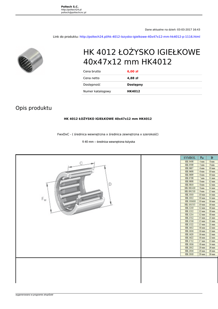 HK 4012 ŁOŻYSKO IGIEŁKOWE 40x47x12 mm HK4012
