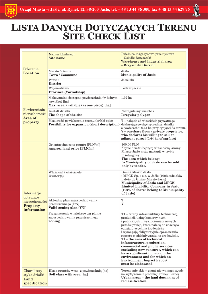 Urz¹d Miasta w Jaœle, ul. Rynek 12, 38-200 Jas³o, tel. + 48 13 44 86 300, fax + 48 13 44 629 76 LISTA DANYCH DOTYCZ¥CYCH TERENU SITE CHECK LIST Po³o¿enie Location Nazwa lokalizacji Site name Dzielnica magazynowo-przemys³owa – Osiedle Brzyszczki Warehouse and industrial area – Brzyszczki District Miasto / Gmina Town / Commune Jas³o Municipality of Jas³o Powiat District Województwo Province (Voivodship) Jasielski Maksymalna dostêpna powierzchnia (w jednym kawa³ku) [ha] Max. area available (as one piece) [ha] 1,97 ha Powierzchnia Kszta³t dzia³ki nieruchomoœci The shape of the site Area of Mo¿liwoœci powiêkszenia terenu (krótki opis) property Podkarpackie Nieregularny wielobok Irregular polygon T – nabycie od w³aœciciela prywatnego, Possibility for expansion (short description) deklaruj¹cego chêæ sprzeda¿y, dzia³ki o powierzchni 0,64 ha przylegaj¹cej do terenu. Y – purchase from a private proprietor, who declares his willing to sell an adjacent parcel (0,64 ha of surface) Orientacyjna cena gruntu [PLN/m2] Approx. land price [PLN/m2] 100,00 PLN Zbycie dzia³ki bêd¹cej w³asnoœci¹ Gminy Miasto Jas³o mo¿e nast¹piæ w trybie przetargowym. The area which belongs to Municipality of Jas³o can be sold only by tender. W³aœciciel / w³aœciciele Owner(s) Gmina Miasto Jas³o i MPGK Sp. z o.o. w Jaœle (100% udzia³ów nale¿y do Gminy Miasto Jas³o) Municipality of Jas³o and MPGK Limited Liability Company in Jas³o (100% of shares belong to Municipality of Jas³o) Informacje dotycz¹ce nieruchomoœci Aktualny plan zagospodarowania przestrzennego (T/N) Property Valid zoning plan (Y/N) information Przeznaczenie w miejscowym planie zagospodarowania przestrzennego Zoning Klasa gruntów wraz z powierzchni¹ [ha] Charakterystyka dzia³ki Soil class with area [ha] Land specification T Y T1 – tereny infrastruktury technicznej, produkcji, us³ug komercyjnych i publicznych z wykluczeniem nowych przedsiêwziêæ, które nale¿¹ do znacz¹co oddzia³uj¹cych na œrodowisko i wymagaj¹ obligatoryjnie opracowania raportu o oddzia³ywaniu na œrodowisko. T1 – the area of technical infrastructure, production, commercial and public services excluding new ventures, which can have significant impact on the environment and for which an Environment Impact Report must be elaborated. Tereny miejskie – grunt nie wymaga zgody na wy³¹czenie z produkcji rolnej i leœnej. Urban areas – the land doesn't need reclassification. Urz¹d Miasta w Jaœle, ul. Rynek 12, 38-200 Jas³o, tel. +48 13 44 86 300, fax +48 13 44 629 76 Charakterystyka dzia³ki Land specification Po³¹czenia transportowe Transport links Ró¿nica poziomów terenu [m] Differences in land level [m] 0,5 m Obecne u¿ytkowanie Present usage Nieu¿ytkowany Not in use at present Zanieczyszczenia wód powierzchniowych i gruntowych (T/N) Soil and underground water pollution (Y/N) N N Poziom wód gruntowych [m] Underground water level [m] Niski Low Czy by³y prowadzone badania geologiczne terenu (T/N) Were geological research done (Y/N) N N Ryzyko wyst¹pienia zalañ lub obsuniêæ terenu (T/N) Risk of flooding or land slide (Y/N) N N Przeszkody podziemne (T/N) Underground obstacles (Y/N) T – Mo¿liwe do przebudowy (linie centralnego ogrzewania) Y – Possible to redevelop (central heating lines) Przeszkody wystêpuj¹ce na powierzchni terenu (T/N) Ground and overhead obstacles (Y/N) N N Istniej¹ce ograniczenia ekologiczne (T/N) Ecological restrictions (Y/N) N N Budynki i zabudowania na terenie (T/N) Buildings / other constructions on site (Y/N) T - do rozbiórki T - condemned Droga dojazdowa do terenu (rodzaj drogi i jej szerokoœæ) Access road to the plot (type and width of access road) £¹cznik lokalny do drogi krajowej nr 28. (szerokoœæ 20 m) Local road connection with the national road no. 28 (20 m of width) Autostrada / droga krajowa [km] Nearest motorway / national road [km] Autostrada – 60 km Motorway – 60 km Droga krajowa nr 28 – 0,5 km National road no. 28 – 0,5 km Droga krajowa nr 73 – 1 km National road no. 73 – 1 km Porty rzeczne i morskie w odleg³oœci do 200 km Sea and river ports located up to 200 km N N Kolej [km] Railway line [km] Jas³o, 4 km Railway line is located 4 km away from the area (Jas³o) Bocznica kolejowa [km] Railway siding [km] Na terenie s¹siedzkiej dzia³ki (tego samego w³aœciciela) Railway siding is located on the adjacent site (of the same owner) Najbli¿sze lotnisko miêdzynarodowe [km] Nearest international airport [km] Rzeszów /Jasionka/ - 80 km , Krosno /lotnisko sportowe/ - 20 km Rzeszów International airport /Jasionka/ - 80 km, Krosno /sport airport/ – 20 km Najbli¿sze miasto wojewódzkie [km] Nearest province capital [km] Rzeszów, stolica woj. podkarpackiego – 65 km Rzeszów, capital of the province – 65 km Istniej¹ca Elektrycznoœæ na terenie (T/N) infrastruktura Electricity (Y/N) Existing infrastructure T Y Urz¹d Miasta w Jaœle, ul. Rynek 12, 38-200 Jas³o, tel. +48 13 44 86 300, fax +48 13 44 629 76 Napiêcie Voltage [kV] 15 kV Dostêpna moc Available capacity [MW] 0,46 MW Gaz na terenie (T/N) Gas (Y/N) Istniej¹ca infrastruktura Existing infrastructure N N Odleg³oœæ przy³¹cza od granicy dzia³ki Connection point (distance from boundary) [m] 3000 m Wartoœæ kaloryczna Calorific value [MJ/Nm3] 38 MJ/Nm3 Œrednica rury Pipe diameter [mm] 160 mm Dostêpna objêtoœæ Available capacity [Nm3/h] Bez ograniczeñ Unlimited Woda na terenie (T/N) Water supply (Y/N) Dostêpna objêtoœæ Available capacity [m3/24h] Kanalizacja na terenie (T/N) Sewage discharge (Y/N) Dostêpna objêtoœæ Available capacity [m3/24h] Telefony (T/N) Telephone (Y/N) Odleg³oœæ przy³¹cza od granicy terenu Connection point (distance from boundary) [m] T– Wodoci¹g Y – Water supply system 1500 m3/24h T Y 1500 m3/24h N N 60 m 60 m 10 atutów Jas³a jako lokalizacji inwestycji Uwagi Comments 1. Bogate i ugruntowane historycznie tradycje przemys³owe (przem