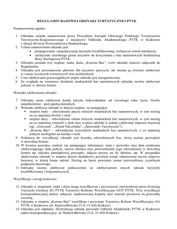 REGULAMIN BAZOWEJ ODZNAKI TURYSTYCZNEJ PTTK Postanowienia ogólne: 1. Odznaka została ustanowiona przez Prezydium Zarządu Głównego Polskiego Towarzystwa Turystyczno-Krajoznawczego z inicjatywy Oddziału Akademickiego PTTK w Krakowie z okazji 60-lecia Przewodnictwa Studenckiego. 2. Celem ustanowienia odznaki jest: propagowanie i popularyzacja turystyki kwalifikowanej, zwłaszcza wśród młodzieży, zachęcenie szerokiego grona turystów do korzystania z baz namiotowych Studenckiej Bazy Noclegowej PTTK. 3. Odznaka posiada trzy stopnie: mała, duża, „Korona Baz”, wzór odznaki stanowi załącznik do Regulaminu. 4. Odznaka jest przeznaczona głównie dla turystów pieszych, ale można ją również zdobywać w czasie wycieczek rowerowych oraz jeździeckich. 5. Czas zdobywania poszczególnych stopni odznaki jest nieograniczony. 6. Ze względu na sezonowe działanie studenckich baz namiotowych odznakę można zdobywać jedynie w okresie letnim. Warunki zdobywania odznaki: 7. Odznakę może zdobywać każdy turysta indywidualnie od czwartego roku życia. Osoby niepełnoletnie - pod opieką dorosłych. 8. Warunki zdobycia odznaki w danym stopniu są następujące: stopień mały – odwiedzenie pięciu różnych studenckich baz namiotowych, w tym nocleg na co najmniej dwóch z nich. stopień duży – odwiedzenie ośmiu różnych studenckich baz namiotowych, w tym nocleg na co najmniej czterech z nich oraz wzięcie udziału w jednej cyklicznej imprezie bazowej (np. „Gorcstok”, „Dzień NaLeśnika”, „Śpiewanki Turystyczne”). „Korona Baz” – odwiedzenie wszystkich studenckich baz namiotowych, z co najmniej jednym noclegiem na każdej z nich. 9. Podstawą do weryfikacji odznaki jest kronika odwiedzanych baz, którą można prowadzić w dowolnej formie. 10. W kronice powinny znaleźć się następujące informacje: imię i nazwisko oraz data urodzenia zdobywającego, data pobytu, nazwa obiektu oraz potwierdzenie jego odwiedzenia w dowolnej formie np. odcisku pamiątkowej pieczątki, zdjęcia turysty na tle obiektu, itp. W przypadku zdobywania odznaki w stopniu dużym dodatkowo powinna zostać odnotowana nazwa imprezy bazowej, w której brano udział. Nocleg na bazie powinien zostać potwierdzony czytelnym podpisem bazowego. 11. Odznakę można zdobywać jednocześnie ze zdobywaniem innych odznak turystyki kwalifikowanej i krajoznawczych. Weryfikacja i uwagi końcowe: 12. Odznaki w stopniach: mała i duża mogą weryfikować i przyznawać zatwierdzone przez Komisję Turystyki Górskiej ZG PTTK Terenowe Referaty Weryfikacyjne GOT PTTK. Przy weryfikacji korespondencyjnej należy załączyć zaadresowaną kopertę oraz znaczki pocztowe na przesyłkę zwrotną. 13. Odznakę w stopniu „Korona Baz” weryfikuje i przyznaje Terenowy Referat Weryfikacyjny OA PTTK w Krakowie (ul. Radziwiłłowska 21/4, 31-026 Kraków). 14. Odznaka jest odpłatna. Dystrybucję odznak prowadzi Oddział Akademicki PTTK w Krakowie (adres korespondencyjny: ul. Radziwiłłowska 21/4, 31-026 Kraków). 15. Interpretacja regulaminu należy do Zarządu Oddziału Akademickiego PTTK w Krakowie. 16. Wykaz studenckich baz namiotowych, sporządzony przez Komisję Akademicką ZG PTTK, wymaganych do zdobywania odznaki jest zamieszczany w informatorze oraz na mapie Studenckiej Bazy Noclegowej. 17. Regulamin został zatwierdzony przez Prezydium ZG PTTK uchwałą nr 39/XVIII/2015 21 stycznia 2015 r. Załącznik do Regulaminu Bazowej Odznaki Turystycznej PTTK wzór odznaki (autor Janusz Jutrzenka Trzebiatowski) stopień mały stopień duży Korona Baz