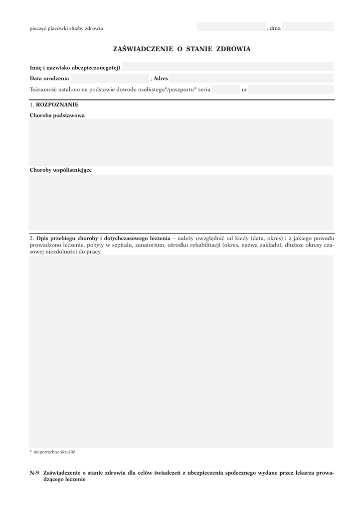piecz´ç placówki s∏u˝by zdrowia . . . . . . . . . . . . . . . . . . . . . . . . . , dnia . . . . . . . . . . . . . . . . ZAÂWIADCZENIE O STANIE ZDROWIA Imi´ i nazwisko ubezpieczonego(ej) . . . . . . . . . . . . . . . . . . . . . . . . . . . . . . . . . . . . . . . . . . . . . . . . . . . . . . . . . . . . . . . . . . . . Data urodzenia . . . . . . . . . . . . . . . . . . . . . . . . . ; Adres . . . . . . . . . . . . . . . . . . . . . . . . . . . . . . . . . . . . . . . . . . . . . . . . . . . . . To˝samoÊç ustalono na podstawie dowodu osobistego*/paszportu* seria . . . . . . . . . nr . . . . . . . . . . . . . . . . . . . . . . . . . . . 1. ROZPOZNANIE Choroba podstawowa .................................................................................................. .................................................................................................. .................................................................................................. .................................................................................................. Choroby wspó∏istniejàce .................................................................................................. .................................................................................................. .................................................................................................. .................................................................................................. .................................................................................................. 2. Opis przebiegu choroby i dotychczasowego leczenia – nale˝y uwzgl´dniç od kiedy (data, okres) i z jakiego powodu prowadzono leczenie, pobyty w szpitalu, sanatorium, oÊrodku rehabilitacji (okres, nazwa zak∏adu), d∏u˝sze okresy czasowej niezdolnoÊci do pracy * niepotrzebne skreÊliç N-9 ZaÊwiadczenie o stanie zdrowia dla celów Êwiadczeƒ z ubezpieczenia spo∏ecznego wydane przez lekarza prowadzàcego leczenie 3. Wyniki badaƒ pomocniczych i wnioski z konsultacji specjalistycznych potwierdzajàce rozpoznanie choroby podstawowej i chorób wspó∏istniejàcych 4. Ocena wyników leczenia i rokowanie (nale˝y okreÊliç obecny stan zdrowia, prognoz´ przebiegu choroby, wskazania odnoÊnie dalszego leczenia i rehabilitacji) 5. Ubezpieczony(a) jest: 6 zdolny(a); 6 niezdolny(a) do odbycia podró˝y na badanie przez lekarza orzecznika (konsultanta) ZUS z powodu: za∏àczniki : .................................... podpis i piecz´ç lekarza UWAGA: ZaĞwiadczenie o stanie zdrowia powinno byü wystawione nie wczeĞniej niĪ na miesiąc przed datą záoĪenia wniosku o Ğwiadczenie. N-9 ZaÊwiadczenie o stanie zdrowia dla celów Êwiadczeƒ z ubezpieczenia spo∏ecznego wydane przez lekarza prowadzàcego leczenie