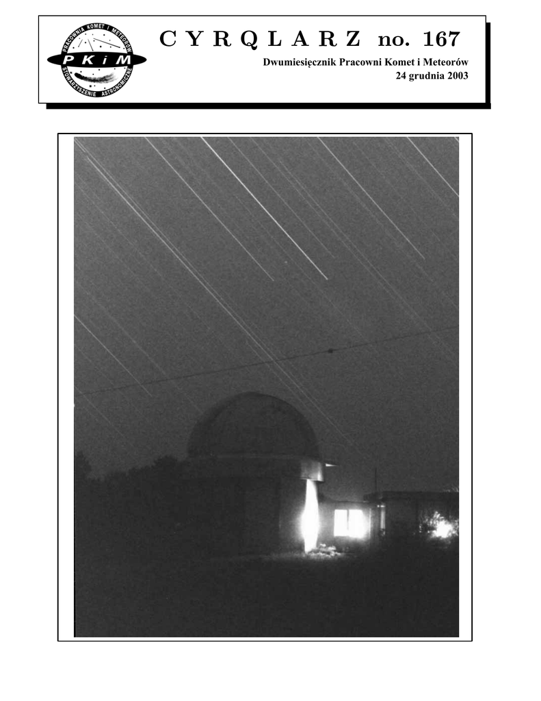 Dwumiesi˛ecznik Pracowni Komet i Meteorów 24 grudnia 2003 Zdjþ ecia nowego sprzü etu obserwacyjnego PKiM, zakupionego w ramach grantu, kt—rym kieruje Krzysztof Mularczyk. Na g—rze trzy teleskopy Celestrona, przeznaczone do obserwacji teleskopowych meteor—w. Poniú zej z prawej jeden z piü eciu aparat—w Canon T50 pod nowych shutterem do obserwacji fotograÞcznych. Po lewej Arkadiusz Olech z jego nowym teleskopem Ð Pronto. Drodzy Czytelnicy, Świ˛eta tuż tuż, a wi˛ec i najnowszy numer “Cyrqlarza” wyszedł troch˛e weselszy, mniej poważny niż zwykle. Wszystko za sprawa˛ zabawnych relacji Przemka Żoładka ˛ i Krzyśka Hełminiaka z jeszcze wakacyjnego “XIII Obozu Obserwacyjnego PKiM” w Ostrowiku, oraz Ewy Zegler z listopadowej akcji obserwowania Leonidów. Co prawda na Leonidy pogoda ogl˛ednie mówiac ˛ średnio dopisała, ale sadz ˛ ac ˛ po lekturze, wszelkie “działania” pozaobserwacyjne z pewno ścia˛ urozmaiciły i umiliły obserwatorom pobyt w Ostrowiku. Kto wie zreszta,˛ czy po lekturze obu sprawozda ń istotnie nie zwi˛ekszy si˛e liczba ch˛etnych do uczestnictwa w naszych obozach? Na razie jednak szykuje si˛e nam kolejne, już dwudzieste “Seminarium PKiM”. Tym razem nie b˛edzie co prawda “Walnego Zgromadzenia PKiM”, niemniej organizatorzy postaraja˛ si˛e, by nie zabrakło ciekawych wykładów, nie tylko dotyczacych ˛ tematyki meteorowej. Ze swej strony pozostaje mi tylko serdecznie zaprosi ć do uczestnictwa w “Seminarium”. Zainteresowanych odsyłam do lektury anonsu na stronie 18 niniejszego numeru “Cyrqlarza”. Ponieważ ten numer “Cyrqlarza” jest ostatnim w powoli mijajacym ˛ 2003 roku, Redakcja życzy Czytelnikom Wesołych Świat˛ i Wszystkiego Dobrego w Nowym Roku. Przyjemnej lektury. Mirosław Należyty W numerze: 2 4 7 9 12 12 13 Podsumowanie obserwacji meteorów wykonanych podczas XIII Obozu Obserwacyjnego PKiM Piotr K˛edzierski, Krzysztof Mularczyk, Konrad Szaruga, Kamil Złoczewski Sprawozdanie z XIII Obozu Obserwacyjnego PKiM z przymrużeniem oka, czyli “Patrz, kurde, idzie milicja!!!” Przemysław ”Brahi” Żoładek, ˛ Xysiek Hełminiak Zorza polarna i meteory, czyli Akcja Obserwacyjna “Leonidy 2003” Ewa Zegler Obserwacje bazowe meteorów Krzysztof Mularczyk Nowości: Gdzie ko ńczy si˛e Układ Słoneczny? Arkadiusz Olech Pas Kuipera był kiedyś bliżej Arkadiusz Olech 14 S TARDUST wykonała pierwsze zdj˛ecia komety Wild 2 Arkadiusz Olech 14 Bezpośrednia detekcja efektu Yarkovskiego Arkadiusz Olech 16 17 17 Komiks(?) Luiza Wojciechowska Patrzac ˛ w niebo: Dane do obserwacji Krzysztof Mularczyk 18 18 18 19 Konferowa ć jest rzecza˛ ludzka: ˛ Zaproszenie na XX Seminarium PKiM International Astronomical Youth Camp (IAYC) 2004 Regulamin PKiM 20 Grant Prezent Luiza Wojciechowska I strona okładki: Zdj˛ecie nawiazuje ˛ nieco zaprezentowanych na stronie 16 “pocztówek z wakacji”. Cho ć egzotyki na zdj˛eciu właściwie nie widać, zostało ono zrobione przez Naczelnego kilka lat temu na Kaukazie, podczas pobytu w Specjalnym Obserwatorium Astrofizycznym – tym samym, w którym znajduje si˛e niegdyś najwi˛ekszy na świecie, 6-metrowy teleskop. PODSUMOWANIE OBSERWACJI METEORÓW WYKONANYCH PODCZAS XIII OBOZU OBSERWACYJNEGO PKiM Piotr K˛edzierski, Krzysztof Mularczyk, Konrad Szaruga, Kamil Złoczewski Przedstawiamy podsumowanie obserwacji wizualnych, teleskopowych, fotograficznych i wideo wykonanych podczas XIII Obozu Obserwacyjnego PKiM, Ostrowik, 21 sierpnia – 7 wrze śnia 2003. W tym miejscu chcemy serdecznie podziȩkować dyrekcji Obserwatorium Astronomicznego UW za umożliwienie organizacji kolejnego obozu. Lokalizacja Stacji Obserwacyjnej w Ostrowiku umożliwia rokrocznie wykonanie gros obserwacji meteorów w Polsce, głównie podczas letnich obozów PKiM, organizowanych przez studentów astronomii Uniwersytetu Warszawskiego. O BSERWACJE Obserwatorzy Anna Pałasz Karolina Pyrek Ewa Zegler Krzysztof Hełminiak Justyna Cholka Przemysław Żoładek ˛ Katarzyna Radzińska Dominika Łacheta Andrzej Skoczewski Anna Lemiecha Dariusz Dorosz Kamil Szewc Kamil Złoczewski Juta Kawalerowicz Krzysztof Mularczyk Łukasz Kowalski Michał Jurek Piotr K˛edzierski Arkadiusz Olech RAZEM WIZUALNE IMO kod PALAN PYRKA ZEGEW HELKR CHOJU ZOLPR RADKA LACDO SKOAN LEMAN DORDA SZEKA ZLOKA KAWJU MULKR KOWLU JURMC KEDPI OLEAR - T te f f [h] 44.418 36.834 33.484 27.328 27.017 25.549 23.784 20.037 15.232 11.999 11.633 10.917 10.158 8.750 7.800 4.580 3.290 2.000 1.050 325.86 Tablica 1: Obserwacje wizualne wykonane w dniach 21/22.08 – 06/07.09.2003, 34014 Ostrowik. O BSERWACJE Data 19/20 08 2003 22/23 08 2003 28/29 08 2003 RAZEM WIDEO Ilość kamer 4 3 3 - Te f f [h] 4.00 6.00 3.36 13.36 Tablica 2: Obserwacje wideo wykonane w dniach 19/20.08 – 28/29.08.2003, 34014 Ostrowik. O BSERWACJE FOTOGRAFICZNE Aparaty: Zenit 11 – obiektyw 2/58, Praktica L – obiektyw 2/58. Klisze Fotopan 800. Wszystkie obserwacje wykonywane były przy pomocy shutter’a wykonanego przez Andrzeja Skoczewskiego i Piotra Kȩdzierskiego. Data 19/20 08 2003 22/23 08 2003 28/29 08 2003 30/31 08 2003 RAZEM 1: Te f f [h] 0.95 2.58 0.34 4.50 8.37 2: Te f f [h] 1.10 2.58 0.34 4.50 8.52 1+2: T e f f [h] 2.05 5.16 0.68 9.00 16.89 Tablica 3: Obserwacje fotograficzne wykonane w dniach 19/20.08 – 30/31.08.2003, 34014 Ostrowik. O BSERWACJE Data 03-08-22 03-08-23 03-08-24 03-08-25 03-08-27 03-08-28 03-08-30 03-08-31 03-08-01 03-09-02 03-09-03 03-09-04 03-09-05 03-09-06 RAZEM JURMC Tte f f [h] N 0.92 7 0.88 0.77 0.89 3.46 KAWJU Tte f f [h] N 3 5 6 21 1.00 2.20 5 12 2.12 13 5.32 30 KOWLU Tte f f [h] N 3.08 35 1.13 12 0.90 14 1.27 25 2.68 45 1.95 30 3.73 51 1.10 19 0.53 8 1.00 0.92 5.03 3.50 26.83 13 11 56 41 36 TELESKOPOWE HELKR Tte f f [h] N SKOAN Tte f f [h] N SZAKO Tte f f [h] N 1.10 1.17 17 24 2.17 11 1.00 8 1.50 3.05 0.98 41 51 19 2.17 11 1.00 8 7.80 152 RAZEM Tte f f [h] N 4.00 42 1.13 12 2.00 31 2.44 49 3.56 48 4.20 76 9.95 121 2.08 38 0.