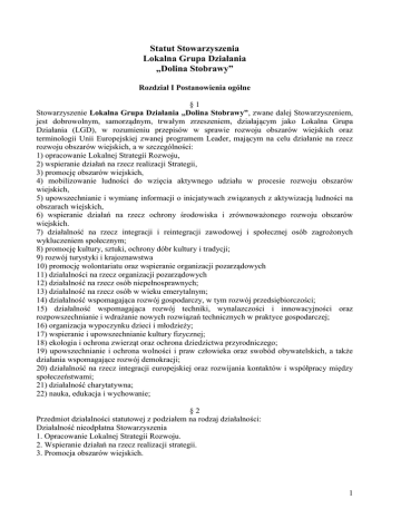 Statut Stowarzyszenia Lokalna Grupa Działania „Dolina Stobrawy” Rozdział I Postanowienia ogólne §1 Stowarzyszenie Lokalna Grupa Działania „Dolina Stobrawy”, zwane dalej Stowarzyszeniem, jest dobrowolnym, samorządnym, trwałym zrzeszeniem, działającym jako Lokalna Grupa Działania (LGD), w rozumieniu przepisów w sprawie rozwoju obszarów wiejskich oraz terminologii Unii Europejskiej zwanej programem Leader, mającym na celu działanie na rzecz rozwoju obszarów wiejskich, a w szczególności: 1) opracowanie Lokalnej Strategii Rozwoju, 2) wspieranie działań na rzecz realizacji Strategii, 3) promocję obszarów wiejskich, 4) mobilizowanie ludności do wzięcia aktywnego udziału w procesie rozwoju obszarów wiejskich, 5) upowszechnianie i wymianę informacji o inicjatywach związanych z aktywizacją ludności na obszarach wiejskich, 6) wspieranie działań na rzecz ochrony środowiska i zrównoważonego rozwoju obszarów wiejskich. 7) działalność na rzecz integracji i reintegracji zawodowej i społecznej osób zagrożonych wykluczeniem społecznym; 8) promocję kultury, sztuki, ochrony dóbr kultury i tradycji; 9) rozwój turystyki i krajoznawstwa 10) promocję wolontariatu oraz wspieranie organizacji pozarządowych 11) działalności na rzecz organizacji pozarządowych 12) działalność na rzecz osób niepełnosprawnych; 13) działalność na rzecz osób w wieku emerytalnym; 14) działalność wspomagająca rozwój gospodarczy, w tym rozwój przedsiębiorczości; 15) działalność wspomagająca rozwój techniki, wynalazczości i innowacyjności oraz rozpowszechnianie i wdrażanie nowych rozwiązań technicznych w praktyce gospodarczej; 16) organizacja wypoczynku dzieci i młodzieży; 17) wspieranie i upowszechnianie kultury fizycznej; 18) ekologia i ochrona zwierząt oraz ochrona dziedzictwa przyrodniczego; 19) upowszechnianie i ochrona wolności i praw człowieka oraz swobód obywatelskich, a także działania wspomagające rozwój demokracji; 20) działalność na rzecz integracji europejskiej oraz rozwijania kontaktów i współpracy między społeczeństwami; 21) działalność charytatywna; 22) nauka, edukacja i wychowanie; §2 Przedmiot działalności statutowej z podziałem na rodzaj działalności: Działalność nieodpłatna Stowarzyszenia 1. Opracowanie Lokalnej Strategii Rozwoju. 2. Wspieranie działań na rzecz realizacji strategii. 3. Promocja obszarów wiejskich. 1 4. Mobilizowanie ludności do brania aktywnego udziału w procesie rozwoju obszarów wiejskich. 5. Upowszechnianie i wymiana informacji o inicjatywach związanych z aktywizacją ludności na obszarach wiejskich. 6. Wspieranie działań na rzecz ochrony środowiska i zrównoważonego rozwoju obszarów wiejskich. 7. 58, 14, z, wydawanie czasopism i pozostałych periodyków. 8. 79, 90, b, działalność w zakresie informacji turystycznej. 9. 93, 19, z, pozostała działalność związana ze sportem. 10. 63, 12, z. Działalność portali internetowych. 11. 72, 19, z. Badania naukowe i prace rozwojowe w dziedzinie pozostałych nauk przyrodniczych i technicznych. Działalność odpłatna Stowarzyszenia 18.12.Z Pozostałe drukowanie 18.13.Z Działalność usługowa związana z przygotowywaniem do druku 58.19.Z Pozostała działalność wydawnicza 77.21.Z Wypożyczanie i dzierżawa sprzętu rekreacyjnego i sportowego 77.29.Z Wypożyczanie i dzierżawa pozostałych artykułów użytku osobistego i domowego 79.12.Z Działalność organizatorów turystyki 82.30.Z Działalność związana z organizacją targów, wystaw i kongresów 85.59.B Pozostałe pozaszkolne formy edukacji, gdzie indziej niesklasyfikowane 85.60.Z Działalność wspomagająca edukację 88.99.Z Pozostała pomoc społeczna bez zakwaterowania, gdzie indziej niesklasyfikowana 93.19.Z Pozostała działalność związana ze sportem 93.21.Z Działalność wesołych miasteczek i parków rozrywki 93.29.Z Pozostała działalność rozrywkowa i rekreacyjna 94.99.Z Działalność pozostałych organizacji członkowskich, gdzie indziej niesklasyfikowana §3 Stowarzyszenie działając na rzecz rozwoju obszarów wiejskich, uwzględnia ochronę oraz promocję środowiska naturalnego, krajobrazu i zasobów historyczno-kulturowych, rozwój turystyki oraz popularyzację i rozwój produkcji wyrobów regionalnych. §4 Siedzibą Stowarzyszenia jest Kluczbork, gmina Kluczbork, województwo opolskie. §5 Stowarzyszenie działa na podstawie przepisów ustawy z dnia 7 kwietnia 1989 r. Prawo o stowarzyszeniach (Dz. U. z 2001 r. Nr 79, poz. 855 z późn. zm, ustawy z dnia 20 lutego 2015 r. o rozwoju lokalnym z udziałem lokalnej społeczności (Dz. U. 2015 poz. 378), rozporządzenia Parlamentu Europejskiego i Rady (UE) nr 1303/2013 z dnia 17 grudnia 2013 r.( Dziennik Urzędowy Unii Europejskiej Nr L 347/320 z dnia 20 grudnia 2013r.), ustawy z dnia 24 kwietnia 2003 r. o działalności pożytku publicznego i o wolontariacie (Dz. U. Nr 96 poz. 873) oraz niniejszego Statutu. §6 1. Stowarzyszenie może być członkiem krajowych i międzynarodowych organizacji o podobnym celu działania. 2. Terenem działania Stowarzyszenia jest obszar Rzeczpospolitej Polskiej, przy czym w zakresie niezbędnym dla właściwego realizowania celów może ono prowadzić działalność także poza granicami Rzeczypospolitej Polskiej. 3. Czas trwania Stowarzyszenia nie jest ograniczony. 2 4. Stowarzyszenie Lokalna Grupa Działania „Dolina Stobrawy” może używać nazwy skrócone: LGD „Dolina Stobrawy” jak również Stowarzyszenie LGD „Dolina Stobrawy”. Rozdział II Zasady działania Stowarzyszenia §7 Stowarzyszenie realizuje swój cel w szczególności poprzez: 1) organizowanie i finansowanie: a) przedsięwzięć zgodnych z Lokalną Strategią Rozwoju, b) przedsięwzięć o charakterze informacyjnym lub szkoleniowym, c) imprez kulturalnych, służących zwłaszcza promocji regionu i jego tożsamości kulturowej, d) działalności promocyjnej, 2) prowadzenie bezpłatnego dorad