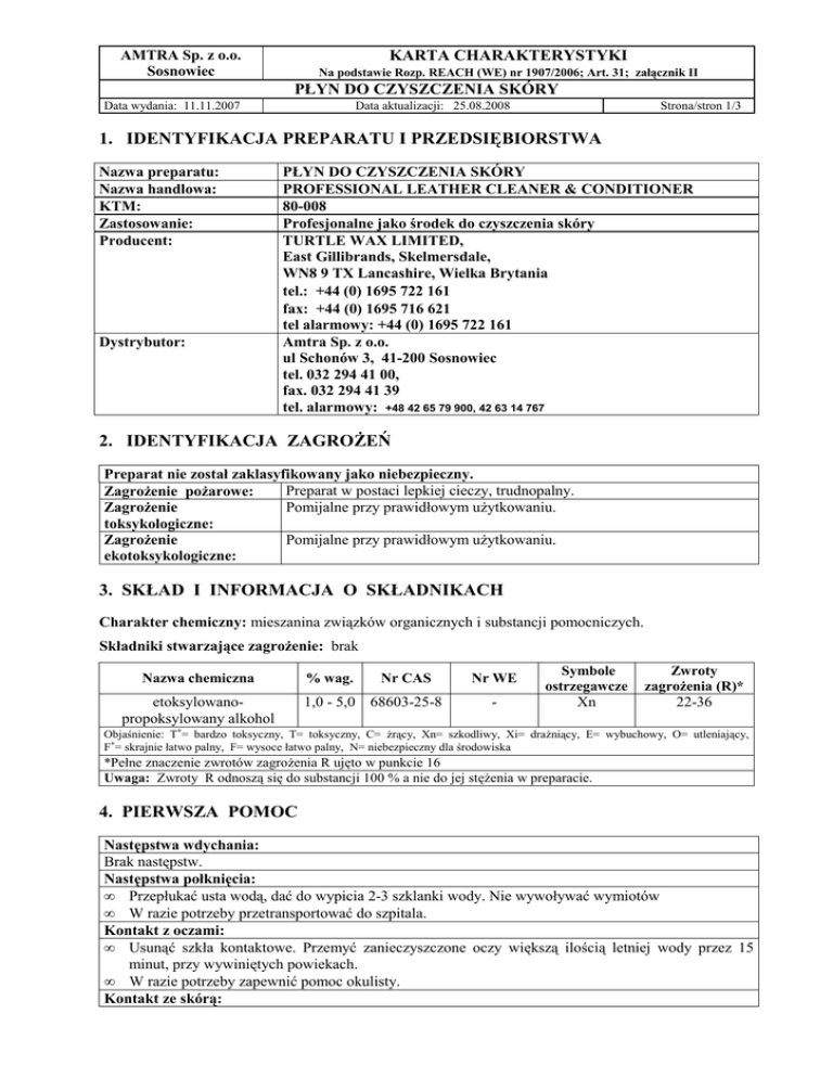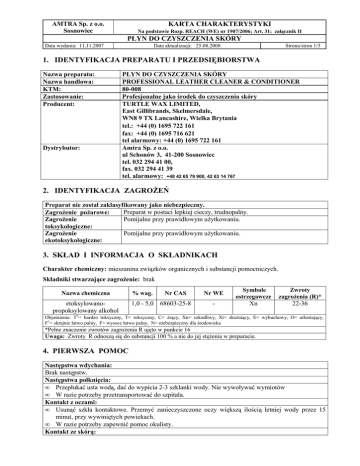 AMTRA Sp. z o.o. Sosnowiec KARTA CHARAKTERYSTYKI Na podstawie Rozp. REACH (WE) nr 1907/2006; Art. 31; załącznik II PŁYN DO CZYSZCZENIA SKÓRY Data wydania: 11.11.2007 Data aktualizacji: 25.08.2008 Strona/stron 1/3 1. IDENTYFIKACJA PREPARATU I PRZEDSIĘBIORSTWA Nazwa preparatu: Nazwa handlowa: KTM: Zastosowanie: Producent: Dystrybutor: PŁYN DO CZYSZCZENIA SKÓRY PROFESSIONAL LEATHER CLEANER & CONDITIONER 80-008 Profesjonalne jako środek do czyszczenia skóry TURTLE WAX LIMITED, East Gillibrands, Skelmersdale, WN8 9 TX Lancashire, Wielka Brytania tel.: +44 (0) 1695 722 161 fax: +44 (0) 1695 716 621 tel alarmowy: +44 (0) 1695 722 161 Amtra Sp. z o.o. ul Schonów 3, 41-200 Sosnowiec tel. 032 294 41 00, fax. 032 294 41 39 tel. alarmowy: +48 42 65 79 900, 42 63 14 767 2. IDENTYFIKACJA ZAGROśEŃ Preparat nie został zaklasyfikowany jako niebezpieczny. Preparat w postaci lepkiej cieczy, trudnopalny. ZagroŜenie poŜarowe: Pomijalne przy prawidłowym uŜytkowaniu. ZagroŜenie toksykologiczne: Pomijalne przy prawidłowym uŜytkowaniu. ZagroŜenie ekotoksykologiczne: 3. SKŁAD I INFORMACJA O SKŁADNIKACH Charakter chemiczny: mieszanina związków organicznych i substancji pomocniczych. Składniki stwarzające zagroŜenie: brak Nazwa chemiczna etoksylowanopropoksylowany alkohol % wag. Nr CAS 1,0 - 5,0 68603-25-8 Nr WE - Symbole ostrzegawcze Xn Zwroty zagroŜenia (R)* 22-36 Objaśnienie: T+= bardzo toksyczny, T= toksyczny, C= Ŝrący, Xn= szkodliwy, Xi= draŜniący, E= wybuchowy, O= utleniający, F+= skrajnie łatwo palny, F= wysoce łatwo palny, N= niebezpieczny dla środowiska *Pełne znaczenie zwrotów zagroŜenia R ujęto w punkcie 16 Uwaga: Zwroty R odnoszą się do substancji 100 % a nie do jej stęŜenia w preparacie. 4. PIERWSZA POMOC Następstwa wdychania: Brak następstw. Następstwa połknięcia: • Przepłukać usta wodą, dać do wypicia 2-3 szklanki wody. Nie wywoływać wymiotów • W razie potrzeby przetransportować do szpitala. Kontakt z oczami: • Usunąć szkła kontaktowe. Przemyć zanieczyszczone oczy większą ilością letniej wody przez 15 minut, przy wywiniętych powiekach. • W razie potrzeby zapewnić pomoc okulisty. Kontakt ze skórą: AMTRA Sp. z o.o. Sosnowiec KARTA CHARAKTERYSTYKI Na podstawie Rozp. REACH (WE) nr 1907/2006; Art. 31; załącznik II PŁYN DO CZYSZCZENIA SKÓRY Data wydania: 11.11.2007 Data aktualizacji: 25.08.2008 Strona/stron 2/3 Brak następstw. 5. POSTĘPOWANIE W PRZYPADKU POśARU ZagroŜenia poŜarowe: Środki gaśnicze: Środki gaśnicze, jakich nie naleŜy stosować: Gaszenie poŜaru: Sprzęt ochronny straŜaków: Produkty spalania: Uwaga dodatkowa: Preparat w postaci lepkiej cieczy, trudnopalny. • pianę gaśniczą (odporną na alkohol) • ditlenek węgla (CO2) • proszek gaśniczy, • mgłę wodną. Brak. Opary strącać mgłą wodną. Pojemniki naraŜone na działania ognia lub wysokiej temperatury chłodzić wodą i w miarę moŜliwości usunąć z zagroŜonego obszaru. Pełne wyposaŜenie ochronne. Aparaty izolujące drogi oddechowe. Dymy zawierające niebezpieczne produkty spalania, w tym tlenek i ditlenek węgla, tlenki azotu. W wyniku podgrzewania produktu wytwarzają się mieszaniny wybuchowe. Do zbierania rozlanej cieczy uŜywać materiały absorbujące. Chronić kanalizację, wody powierzchniowe i grunt przed zanieczyszczeniem. 6. POSTĘPOWANIE W PRZYPADKU NIEZAMIERZONEGO UWOLNIENIA DO ŚRODOWISKA Środki ochrony indywidualnej: Metody oczyszczania: Środki ostroŜności w odniesieniu do środowiska: Ubrania ochronne ze zwartej tkaniny, rękawice z tworzywa nitrylowego lub neoprenowego, buty z tworzywa neoprenowego, okulary ochronne w szczelnej obudowie. Usunąć wszelkie potencjalne źródła zapłonu, zabezpieczyć uszkodzone opakowania. Stosować obojętne materiały absorbujące (ziemia, suchy piasek, diatomit, wermikulit). Zebrany ze środowiska preparat umieścić w opakowaniu zastępczym i skierować do zniszczenia. Nie wolno uŜywać rozpuszczalników. Do czyszczenia stosować detergenty. Zabezpieczyć studzienki ściekowe. W przypadku powaŜnego zanieczyszczenia jakichkolwiek elementu środowiska, powiadomić odpowiednie władze administracyjne i kontrolne oraz organizacje ratownicze. Na drodze spalania po rozładowaniu opakowań, w odpowiednich instalacjach uprawnionego przedsiębiorstwa. 7. POSTĘPOWANIE Z PREPARATEM I JEGO MAGAZYNOWANIE Postępowanie z preparatem: Podczas wszelkich, wykonywanych czynności z preparatem: . • nie jeść, nie pić, nie palić nie zaŜywać lekarstw, • unikać bezpośrednich kontaktów z preparatem, • unikać wdychania par i aerozoli, • przestrzegać zasad higieny osobistej, • stosować odzieŜ i sprzęt ochrony osobistej. AMTRA Sp. z o.o. Sosnowiec KARTA CHARAKTERYSTYKI Na podstawie Rozp. REACH (WE) nr 1907/2006; Art. 31; załącznik II PŁYN DO CZYSZCZENIA SKÓRY Data wydania: 11.11.2007 Data aktualizacji: 25.08.2008 Strona/stron 3/3 • zapewnić łatwy dostęp do bieŜącej wody. • stosować wentylację na stanowiskach pracy Zapobieganie poŜarom Brak szczególnych zaleceń. i wybuchom: Warunki bezpiecznych Magazyny muszą być suche, przystosowane do przechowywania produktów chemicznych. magazynów: Wszelkie pomieszczenia magazynowe muszą być wydajnie wentylowane. PodłoŜe musi być wykonane z materiału nieprzepuszczalnego, najlepiej ceramicznego. Przechowywać we właściwie oznakowanych, fabrycznych, zamkniętych Warunki opakowaniach, z etykietą w języku polskim zgodną z obowiązującymi magazynowania: przepisami. Zawsze uŜywać pojemników wykonanych z materiałów analogicznych jak oryginalne opakowania. Przechowywać w oddzieleniu od produktów Ŝywnościowych i pasz. Przechowywać w chłodzie. Chronić przed działaniem promieni słonecznych i źródeł ciepła. Personel magazynowy musi być wyposaŜony w niezbędne ochrony osobiste. Stosować się do zaleceń ujętych w karcie-charakterystyce. Szczegółowe informacje w karcie technicznej. Specyficzn
