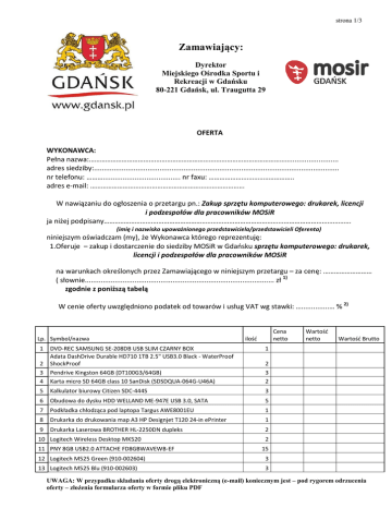 strona 1/3 Zamawiający: Dyrektor Miejskiego Ośrodka Sportu i Rekreacji w Gdańsku 80-221 Gdańsk, ul. Traugutta 29 OFERTA WYKONAWCA: Pełna nazwa:…………………………………………………………………………………………………........................ adres siedziby:........................................................................................................................... nr telefonu: ………....................................... nr faxu: ……………………………………….. adres e-mail: …………………………………………………………………………. W nawiązaniu do ogłoszenia o przetargu pn.: Zakup sprzętu komputerowego: drukarek, licencji i podzespołów dla pracowników MOSiR ja niżej podpisany………………………………………………………………………………………………………………………. (imię i nazwisko upoważnionego przedstawiciela/przedstawicieli Oferenta) niniejszym oświadczam (my), że Wykonawca którego reprezentuję: 1.Oferuje – zakup i dostarczenie do siedziby MOSiR w Gdańsku sprzętu komputerowego: drukarek, licencji i podzespołów dla pracowników MOSiR na warunkach określonych przez Zamawiającego w niniejszym przetargu – za cenę: ……………………… ( słownie............................................................................................... zł 1) zgodnie z poniższą tabelą W cenie oferty uwzględniono podatek od towarów i usług VAT wg stawki: …..............… % 2) Lp. Symbol/nazwa 1 Cena netto ilość 1 2 3 4 DVD-REC SAMSUNG SE-208DB USB SLIM CZARNY BOX Adata DashDrive Durable HD710 1TB 2.5" USB3.0 Black - WaterProof ShockProof Pendrive Kingston 64GB (DT100G3/64GB) Karta micro SD 64GB class 10 SanDisk (SDSDQUA-064G-U46A) 5 Kalkulator biurowy Citizen SDC-444S 3 6 Obudowa do dysku HDD WELLAND ME-947E USB 3.0, SATA 5 7 Podkładka chłodząca pod laptopa Targus AWE8001EU 1 8 Drukarka do drukowania map A3 HP Designjet T120 24-in ePrinter 1 9 Drukarka Laserowa BROTHER HL-2250DN dupleks 2 10 Logitech Wireless Desktop MK520 11 PNY 8GB USB2.0 ATTACHE FD8GBWAVEWB-EF Wartość netto Wartość Brutto 2 3 2 2 15 12 Logitech M525 Green (910-002604) 3 13 Logitech M525 Blu (910-002603) 3 UWAGA: W przypadku składania oferty drogą elektroniczną (e-mail) koniecznym jest – pod rygorem odrzucenia oferty – złożenia formularza oferty w formie pliku PDF strona 2/3 14 Logitech M525 Black (910-002584) 3 15 Laptop ASUS R510LDV-XO961H i3-4010U 4GB MAT 1TB GT820 W8.1 16 Skaner Mobilny Brother ADS-2100 5 1 17 Monitor Iiyama x2380hs-b1 18 Monitor DELL U2412M czarny 19 KARTA GRAFICZNA AGP 256MB GF FX5500 Dell Optiplex 780 (Core2Duo E8400 3GHz 4GB 160GB DVDRW Win7) 20 +LCD 19” Dell 1908fp 21 Adata SSD XPG SX900 256GB 2.5'' SATA3 SF2281 Sync 555/535 MB/ 22 Hub USB ICY BOX IB-AC611 4 x USB 3.0 microUSB 23 Drukarka do etykiet Brother QL-650TD 24 Drukarka A3 Brother MFC-J6920DW 25 Opus Bindownica Wire El-Jumbo 3 1 1 1 20 1 1 1 1 Router B593 bez simlocka z anteną (antena dualana 34 dBi, 2 x 5m 26 przewód ze złączem SMA) 1 27 Komputer stacjonarny (podzespoły w tabelce poniżej) 1 28 Drukarka HP OfficeJet Pro 8600 Plus 1 29 Logitech performance mx Tablet Galaxy Tab S 8,4 LTE SM-T705 (czarny) + (EF-BT700 czarny) jako 30 zestaw 2 31 Urządzenie wielofunkcyjne Brother MFC-J4510DW 1 32 Microsoft Sculpt Ergonomic Mouse 1 2 RAZEM Lista części do komputera z pozycji 27 Lp. 1 2 3 4 5 6 7 8 Symbol/nazwa OBUDOWA CHIEFTEC CT-01B-OP - mATX- CZARNA ZASILACZ CHIEFTEC GPA-450S8 (80+) 450W MSI Z97M-G43 Intel Core i5 4460 3,20 GHz BOX GeIL DDR3 Black Dragon 8GB/1600 CL11-11-11-28 Wartość netto ilość Wartość Brutto 1 1 1 1 1 Samsung 2.5'' SSD 850 Series 256GB (Serial ATA3) Pro 7mm 550/520 MB/s IOPS 100/90K (MZ-7KE256BW) DVD-REC SAMSUNG SH-224DB SATA CZARNY Czytnik kart MODECOM ALL IN ONE CR-109 2x USB 3.0 1 1 1 RAZEM Licencje Lp. 1 2 3 4 5 6 Symbol/nazwa MS Windows 8.1 prof. 64bit z możliwością przenoszenia licencji Uniblue Driver Scanner 2014 (wersja elektroniczna) Acronis True Image 2015 PL Paragon Backup & Recovery 14 Home Adobe Photoshop Lightroom 5 MS Windows Office 2013 T5D-01753 ilość 2 1 1 1 1 12 RAZEM UWAGA: W przypadku składania oferty drogą elektroniczną (e-mail) koniecznym jest – pod rygorem odrzucenia oferty – złożenia formularza oferty w formie pliku PDF strona 3/3 Sprzęt inny Lp. Symbol/nazwa Wartość netto ilość 1 Bateria alkaliczna Duracell OEA / OEM LR6 AA 2 Baterie AA Akumulatory Eneloop (opakowanie 4 sztuki) Sanyo Eneloop XX UWXB R6/AA 2550mAh (box) Wartość Brutto 120 4 RAZEM Netto Brutto Całość w PLN 2. Jest płatnikiem podatku VAT – w cenie oferty uwzględniono podatek VAT. 2) Nie jest płatnikiem podatku VAT – w cenie oferty nie uwzględniono podatku VAT. 2) 3. Posiada: 1) numer NIP: ………………………………………………. 2) numer REGON: …………………………………………. 4. Uzyskał niezbędne informacje do przygotowania rzetelnej i kompletnej oferty oraz właściwej realizacji zamówienia, w tym realizacja zamówienia do dnia: 15.12.2014 5. Uważa się za związanego złożoną ofertą przez okres 30 dni od daty upływu terminu składania ofert. 6. Wszelkie wnioski, informacje, oświadczenia i zawiadomienia należy przekazywać, odpowiednio: w formie faksowej na numer: ………………………………………………………………………… , lub (jeżeli inny niż na pierwszej stronie oferty) w formie elektronicznej adres e-mailowy: ............................................................. (jeżeli inny niż na pierwszej stronie oferty) ………………………………………………………….…….……………………. (własnoręczny podpis upoważnionego przedstawiciela /przedstawicieli Oferenta) 1) cena w rozumieniu art. 3 ust. 1 pkt 1 i ust. 2 ustawy z dnia 9 maja 2014 r. o informowaniu o cenach towarów i usług (Dz. U