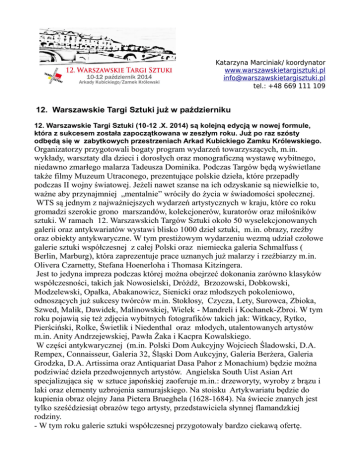 Katarzyna Marciniak/ koordynator www.warszawskietargisztuki.pl [email protected] tel.: +48 669 111 109 12. Warszawskie Targi Sztuki już w październiku 12. Warszawskie Targi Sztuki (10-12 .X. 2014) są kolejną edycją w nowej formule, która z sukcesem została zapoczątkowana w zeszłym roku. Już po raz szósty odbędą się w zabytkowych przestrzeniach Arkad Kubickiego Zamku Królewskiego. Organizatorzy przygotowali bogaty program wydarzeń towarzyszących, m.in. wykłady, warsztaty dla dzieci i dorosłych oraz monograficzną wystawę wybitnego, niedawno zmarłego malarza Tadeusza Dominika. Podczas Targów będą wyświetlane także filmy Muzeum Utraconego, prezentujące polskie dzieła, które przepadły podczas II wojny światowej. Jeżeli nawet szanse na ich odzyskanie są niewielkie to, ważne aby przynajmniej „mentalnie” wróciły do życia w świadomości społecznej. WTS są jednym z najważniejszych wydarzeń artystycznych w kraju, które co roku gromadzi szerokie grono marszandów, kolekcjonerów, kuratorów oraz miłośników sztuki. W ramach 12. Warszawskich Targów Sztuki około 50 wyselekcjonowanych galerii oraz antykwariatów wystawi blisko 1000 dzieł sztuki, m.in. obrazy, rzeźby oraz obiekty antykwaryczne. W tym prestiżowym wydarzeniu wezmą udział czołowe galerie sztuki współczesnej z całej Polski oraz niemiecka galeria Schmalfuss ( Berlin, Marburg), która zaprezentuje prace uznanych już malarzy i rzeźbiarzy m.in. Olivera Czarnetty, Stefana Hoenerloha i Thomasa Kitzingera. Jest to jedyna impreza podczas której można obejrzeć dokonania zarówno klasyków współczesności, takich jak Nowosielski, Dróżdż, Brzozowski, Dobkowski, Modzelewski, Opałka, Abakanowicz, Sienicki oraz młodszych pokoleniowo, odnoszących już sukcesy twórców m.in. Stokłosy, Czycza, Lety, Surowca, Zbioka, Szwed, Malik, Dawidek, Malinowskiej, Wielek - Mandreli i Kochanek-Zbroi. W tym roku pojawią się też zdjęcia wybitnych fotografików takich jak: Witkacy, Rytko, Pierściński, Rolke, Świetlik i Niedenthal oraz młodych, utalentowanych artystów m.in. Anity Andrzejewskiej, Pawła Żaka i Kacpra Kowalskiego. W części antykwarycznej (m.in. Polski Dom Aukcyjny Wojciech Śladowski, D.A. Rempex, Connaisseur, Galeria 32, Śląski Dom Aukcyjny, Galeria Berżera, Galeria Grodzka, D.A. Artissima oraz Antiquariat Dasa Pahor z Monachium) będzie można podziwiać dzieła przedwojennych artystów. Angielska South Uist Asian Art specjalizująca się w sztuce japońskiej zaoferuje m.in.: drzeworyty, wyroby z brązu i laki oraz elementy uzbrojenia samurajskiego. Na stoisku Artykwariatu będzie do kupienia obraz olejny Jana Pietera Brueghela (1628-1684). Na świecie znanych jest tylko sześćdziesiąt obrazów tego artysty, przedstawiciela słynnej flamandzkiej rodziny. - W tym roku galerie sztuki współczesnej przygotowały bardzo ciekawą ofertę. Wśród wystawców pojawią się m.in.: Zderzak (m.in. Czycz, Stokłosa), Art Agenda Nova (m.in. Chudzicki, The Krasnals), Andzelm (m.in. Gierowski, Kałucki), Olimpus (m.in. Marczyński, Berdyszak), Stalowa ( m.in. Opałka, Kowalska), Wirydarz ( m.in. Modzelewski, Leto), Arttrakt ( m.in. Grzyb, Mlącka), Karowa ( Zaborowski), Milano ( m.in. Markowski,Tarasin). Galeria Mostra przypomni twórczość niedocenionego Andrzeja Mierzejewskiego i po raz kolejny zaprezentuje rzeźby Bronisława Krzysztofa, które zasilają największe zagraniczne kolekcje. Obecna po raz pierwszy na Warszawskich Targach Sztuki poznańska Galeria Muzalewska pokaże prace wyjątkowych artystów - Stanisława Dróżdża i Marka Chlandy. Debiutująca także w tym roku Galeria Dyląg zaoferuje obrazy mało znanego a bardzo interesującego malarza Adama Hoffmanna. Znakomite prace na papierze przygotowały: Fejkiel Gallery (m.in. Jerzy Panek) i Galeria Grafiki i Plakatu, która pokaże dokonania Tadeusza Dominika. Krakowski Artemis wystawi „Ikara” Franciszka Starowieyskiego, który wrócił po 15 latach do galerii. Wówczas został sprzedany za 5,2 tys. zł, teraz będzie do kupienia w cenie 25 tys. zł. Będzie też silna reprezentacja galerii zajmujących się fotografią: Obserwacje, Artinfo.pl, Leica Gallery Warszawa i Ney Gallery – mówi Kama Zboralska, przewodnicząca Komisji Programowej. W ramach projektu Polska Grafika Cyfrowa pojawią się uznani, polscy twórcy posługujący się najnowszymi technologiami - Szymon Biernacki ( współpracował m.in. z Warner Bros. , The SPA Studios); Igor Aqualoopa Chołda (laureat m.in. pierwszej nagrody w konkursie na mural Levi’s “Go Forth”, 2011); Marek Okoń (pracuje dla najlepszych producentów gier video oraz studiów filmowych Legendary Pictures, Warner Bross.). Ta różnorodność oferowanych prac jest także istotnym elementem edukacyjnym Targów, bez edukacji potencjalnych klientów trudno zbudować prawdziwy rynek sztuki. U nas wiedza na temat sztuki nadal jest niepokojąco niska, ważne jest zainicjowanie, stworzenie pewnego nawyku kupowania obrazów czy rzeźb i nie chodzi o nabywanie najmodniejszych, tylko takich, które nam się podobają. Organizatorzy, podobnie jak w poprzednim roku przygotowali, cieszące się dużym powodzeniem warsztaty dla dzieci i dorosłych, którzy pod okiem Pracowni Kwadrat oraz znanych artystów m.in. Andrzeja Pągowskiego będą próbować swoich sił na polu twórczych inspiracji. Z pewnością nie tylko kolekcjonerów ucieszy informacja o towarzyszących wykładach: jeden będzie poświęcony twórczości Andrzeja Wróblewskiego – ikony polskiej, powojennej sztuki, autora słynnych obrazów: „Rozstrzelania” i „Kolejka trwa” (poprowadzi ceniony krytyk sztuki Jan Michalski) oraz wykład o coraz bardziej u nas docenianej Fotografii Kolekcjonerskiej (poprowadzi Rafał Kamecki, kolekcjoner, właściciel portalu o sztuce artinfo.pl). Stowarzyszenie Antykwariuszy Polskich zaprosiło Olgierda Jakubowskiego kryminologa, doktoranta Instytutu Nauk Prawnych PAN do popro