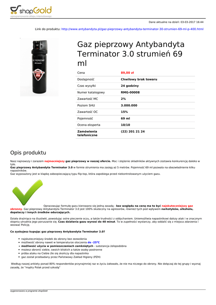 Dane aktualne na dzień: 03-03-2017 16:44 Link do produktu: http://www.antybandyta.pl/gaz-pieprzowy-antybandyta-terminator-30-strumien-69-ml-p-400.html Gaz pieprzowy Antybandyta Terminator 3.0 strumień 69 ml Cena 89,00 zł Dostępność Chwilowy brak towaru Czas wysyłki 24 godziny Numer katalogowy RMG-00008 Zawartość MC 2% Poziom SHU 3.000.000 Zawartość OC 15% Pojemność 69 ml Ocena eksperta 10/10 Zamówienia telefoniczne (22) 201 21 24 Opis produktu Nasz najnowszy i zarazem najmocniejszy gaz pieprzowy w naszej ofercie. Moc i stężenie składników aktywnych zostawia konkurencję daleko w tyle. Gaz pieprzowy Antybandyta Terminator 3.0 w formie strumienia ma zasięg aż 5 metrów. Pojemność 69 ml pozwala na obezwładnienie kilku napastników. Gaz wyposażony jest w klapkę zabezpieczającą typu flip-top, która zapobiega przed niekontrolowanym użyciem gazu. Opracowując formułę gazu kierowano się jedną zasadą - bez względu na cenę ma to być najskuteczniejszy gaz obronny. Gaz pieprzowy Antybandyta Terminator 3.0 jest 100% skuteczny na agresorów, również tych pod wpływem narkotyków, alkoholu, dopalaczy i innych środków odurzających. Działa drażniąco na śluzówki, powodując ostre pieczenie oczu, a także trudności z oddychaniem. Uniemożliwia napastnikowi dalszy atak i w znacznym stopniu utrudnia jego poruszanie się. Czas działania gazu wynosi do 40 minut. To w zupełności wystarczy, aby oddalić się z miejsca zdarzenia i wezwać Policję. Co zyskujesz kupując gaz pieprzowy Antybandyta Terminator 3.0? najskuteczniejszy środek do obrony bez zezwolenia możliwość obrony nawet w temperaturze otoczenia do -25oC możliwość użycia w pomieszczeniach zamkniętych - substancja żelopodobna możesz obronić siebie, swoich bliskich a także osoby postronne próba ataku na Ciebie źle się skończy dla napastnika gaz został przebadany przez Państwowy Zakład Higieny (PZH) Według naszej ankiety ponad 80% respondentów przynajmniej raz w życiu żałowało, że nie ma niczego do obrony. Nie dołączaj do tej grupy i wyznaj zasadę, że "mądry Polak przed szkodą" wygenerowano w programie shopGold Gaz pieprzowy Antybandyta Terminator 3.0 posiada w swoim składzie aż 15% OC, 2% kapsaicynoidów, a jego ostrość to 3.000.000 SHU (dla porównania sos Tabasco® ma ostrość "tylko" 5 tyś SHU). Te parametry czynią go jednym z najmocniejszych gazów pieprzowych na Świecie. Dzięki najwyższej jakości składnikom czas działania gazu sięga do 40 minut. W tym czasie napastnik nie jest w stanie na przeprowadzenie ataku. Dzięki specjalnej formule środka miotającego udało się zwiększyć skuteczny zasięg gazu do 5 metrów ( w testach laboratoryjnych wyniosła ona 6 metrów) Gaz pieprzowy Antybandyta Terminator 3.0 jest bezpieczny Antybandyta Terminator posiada atest Narodowego Instytutu Zdrowia Publicznego - Państwowego Zakładu Higieny. Gaz jest bardzo skuteczny w czasie swojego działania (do 40 minut) i nie powoduje trwałych obrażeń i uszczerbku na zdrowiu. Najwyższa jakość wykonania! Jeśli chodzi nasze zdrowie a czasem życie, nie wolno iść na kompromisy w jakości wykonania gazu pieprzowego. Antybandyta Terminator posiada głowicę wykonaną z trwałego polimeru oraz ruchomą klapkę zabezpieczającą przed przypadkowym użyciem. Bardzo często klienci zadają nam pytanie, który gaz pieprzowy jest najmocniejszy, bez względu na cenę? Tym gazem bez wątpienia jest Antybandyta Terminator 3.0 Uwaga: Gaz pieprzowy zawsze nosimy w taki sposób, aby w sytuacji zagrożenia można go było szybko wyciągnąć i użyć. Najlepszym miejscem jest kieszeń kurtki, płaszcza lub spodni, a dla osób zmotoryzowanych schowek w podłokietniku lub w drzwiach. Gaz pieprzowy należy używać tylko w przypadku obrony koniecznej. W przypadku niewłaściwego użycia natychmiast wypłukać dużą ilością czystej wody, lub użyć chusteczki dekontaminacyjnej, którą można kupić tutaj - kliknij Dane techniczne: Zawartość OC - 15% Zawartość kapsaicynoidów (MC) - 2% Ostrość - 3.000.000 SHU Pojemność: 69 ml Skuteczny zasięg - 5 metrów Data produkcji: 09.2015 Termin ważności: 3 lata Prosimy wystrzegać się przed zakupem gazu obronnego niewiadomego pochodzenia, w szczególności na bazarach. Nasi klienci sygnalizują nam, że takie gazy są nieskuteczne a ich zasięg nie przekracza 1 metra. wygenerowano w programie shopGold Zapytania hurtowe prosimy kierować na adres hurt[@]antybandyta.pl ABC gazów pieprzowych Gazy pieprzowe, czy to w formie ręcznych typu spray, czy w formie pistoletu to skuteczne narzędzie służące samoobronie, na które nie jest wymagane żadne zezwolenie. Poniżej znajdziesz kilka przydatnych informacji na ich temat. Gazy pieprzowe są legalnymi substancjami, pochodzącymi głównie z roślin pieprzowych. Taka substancja umieszczana jest z pojemniku pod ciśnieniem, skąd można ją miotać w stronę napastnika/ów. Najważniejszym składnikiem gazów pieprzowych jest Oleoresin Capsicum czyli w skrócie OC. Oleoresin Capsicum działa drażniąco na błony śluzowe powodując ostre pieczenie, trudności w oddychaniu oraz łzawienie. Czas działania gazu pieprzowego wynosi minimum 10 minut, a w przypadku gazów z wyższej półki (np. Antybandyta Terminator) do 40 minut, co daje możliwość ucieczki oraz wezwania pomocy. Największą zaletą gazów pieprzowych jest to, że działają one na wszystkich ludzi oraz zwierzęta. Gaz pieprzowy działa również na napastników będących pod wpływem alkoholu, narkotyków oraz innych środków, w tym również dopalaczy. Gaz pieprzowy posiadający atest Państwowego Zakładu Higieny (np. IDC RSG 3/2000 lub Antybandyta Terminator) nie powoduje uszczerbku na zdrowiu, więc można go używać w każdej sytuacji zagrożenia. Jak nosić gaz pieprzowy? Noszenie gazu pieprzowego jest kluczową sprawą. Ze względu na wielkość pojemnika gazowego oraz jego budowę, można go nosić w kaburz