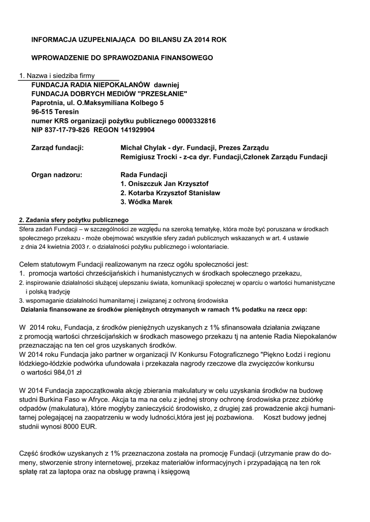 INFORMACJA UZUPEŁNIAJĄCA DO BILANSU ZA 2014 ROK WPROWADZENIE DO SPRAWOZDANIA FINANSOWEGO 1. Nazwa i siedziba firmy FUNDACJA RADIA NIEPOKALANÓW dawniej FUNDACJA DOBRYCH MEDIÓW "PRZESŁANIE" Paprotnia, ul. O.Maksymiliana Kolbego 5 96-515 Teresin numer KRS organizacji pożytku publicznego 0000332816 NIP 837-17-79-826 REGON 141929904 Zarząd fundacji: Michał Chylak - dyr. Fundacji, Prezes Zarządu Remigiusz Trocki - z-ca dyr. Fundacji,Członek Zarządu Fundacji Organ nadzoru: Rada Fundacji 1. Oniszczuk Jan Krzysztof 2. Kotarba Krzysztof Stanisław 3. Wódka Marek 2. Zadania sfery pożytku publicznego Sfera zadań Fundacji – w szczególności ze względu na szeroką tematykę, która może być poruszana w środkach społecznego przekazu - może obejmować wszystkie sfery zadań publicznych wskazanych w art. 4 ustawie z dnia 24 kwietnia 2003 r. o działalności pożytku publicznego i wolontariacie. Celem statutowym Fundacji realizowanym na rzecz ogółu społeczności jest: 1. promocja wartości chrześcijańskich i humanistycznych w środkach społecznego przekazu, 2. inspirowanie działalności służącej ulepszaniu świata, komunikacji społecznej w oparciu o wartości humanistyczne i polską tradycję 3. wspomaganie działalności humanitarnej i związanej z ochroną środowiska Działania finansowane ze środków pieniężnych otrzymanych w ramach 1% podatku na rzecz opp: W 2014 roku, Fundacja, z środków pieniężnych uzyskanych z 1% sfinansowała działania związane z promocją wartości chrześcijańskich w środkach masowego przekazu tj na antenie Radia Niepokalanów przeznaczając na ten cel gros uzyskanych środków. W 2014 roku Fundacja jako partner w organizacji IV Konkursu Fotograficznego "Piękno Łodzi i regionu łódzkiego-łódzkie podwórka ufundowała i przekazała nagrody rzeczowe dla zwycięzców konkursu o wartości 984,01 zł W 2014 Fundacja zapoczątkowała akcję zbierania makulatury w celu uzyskania środków na budowę studni Burkina Faso w Afryce. Akcja ta ma na celu z jednej strony ochronę środowiska przez zbiórkę odpadów (makulatura), które mogłyby zanieczyścić środowisko, z drugiej zaś prowadzenie akcji humanitarnej polegającej na zaopatrzeniu w wody ludności,która jest jej pozbawiona. Koszt budowy jednej studnii wynosi 8000 EUR. Część środków uzyskanych z 1% przeznaczona została na promocję Fundacji (utrzymanie praw do domeny, stworzenie strony internetowej, przekaz materiałów informacyjnych i przypadającą na ten rok spłatę rat za laptopa oraz na obsługę prawną i księgową Poniesione koszty administracyjne były niezbędne dla dalszego funkcjonowania Fundacji Bank i numer konta opp do wpłat 1% Bank PEKAO S.A. Nr konta 47 1240 1822 1111 0010 2800 3921 Działania finansowane z innych środków W 2014 roku Fundacja uzyskała środki bezpośrednio od darczyńców - osób fizycznych, które zdecydowały się wesprzeć działania Fundacji wpisane w jej cele statutowe. 3. Organ rejestrowy fundacji i data rozpoczęcia działalności Fundacja Dobrych Mediów "PRZESŁANIE" działa na podstawie wpisu do KRS pod numerem 332816 dokonanego w dniu 16.07.2009 r. W 2013 roku zmieniono nazwę Fundacji na FUNDACJA RADIA NIEPOKALANÓW z uwagi na główny cel Fundacji tj. promocję wartości chrześcijanskich i humanistycznych na antenie Radia Niepokalanów. 4. Dodatkowe informacje wprowadzające Sprawozdanie finansowe zostało sporządzone przy założeniu kontynuowania działalności przez fundację co najmniej 12 miesięcy i dłużej. Okresem sprawozdawczym dla niniejszego sprawozdania finansowego jest rok kalendarzowy 2014 Przyjęte zasady rachunkowości stosuje się w sposób ciągły, dokonując w kolejnych latach obrotowych jednakowego grupowania operacji, jednakowej wyceny aktywów i pasywów, ustalania wyniku finansowego i sporządzania sprawozdania finansowego tak aby za kolejne lata informacje z nich wynikające były porównywalne. 5. Przyjęte przez fundację zasady rachunkowości, metody wyceny aktywów i pasywów, pomiaru wyniku finansowego oraz sposób sporządzenia sprawozdania finansowego. Sprawozdanie finansowe składa się z: 1) bilansu 2) rachunku zysków i strat 3) informacji uzupełniającej i zawiera informacje przewidziane dla jednostek niebędących spółkami handlowymi, nieprowadzących działalności gospodarczej. W związku z uchyleniem art..82 pkt 1 ustawy o rachunkowości, zawierającego delegację ustawową dla ministra właściwego do spraw finansów publicznych do wydania rozporządzenia określającego szczególne zasady rachunkowości dla niektórych jednostek niebędących spółkami handlowymi, nieprowadzącymi działalności gospodarczej, z dniem wejścia w życie ustawy zmieniającej ( tj z dniem 5 września 2014 r.) przestały obowiązywać przepisy Rozp. Min.Fin. Z dnia 15 listopada 2001 r (Dz.U.z dnia 30 listopada 2001r) Stąd sprawozdanie finansowe Fundacji sporządzone zostało zgodnie z załącznikiem 4 do ustawy o rachunkowości przeznaczonym dla jednostek mikro po uzupełnieni o informacje istotne dla sprawozdania fundacji. Zgodnie, bowiem, z art.. 50 tej ustawy informacje zawarte w sprawozdaniu finansowym mogą być wykazywane ze szczegółowością większą niż określana w załącznikach do ustawy, jeżeli wynika to z potrzeb lub specyfiki jednostki. DODATKOWE INFORMACJE I OBJAŚNIENIA 1.FUNDUSZE WŁASNE - poz.A.I i II.bilansu Nazwa I II III Fundusz statutowy Fundusz z aktualizacji wyceny Wynik finansowy 1. Nadwyżka przychodów nad kosztami(wielkość dodatnia) 2. Nadwyżka kosztów nad przychodami (wielkość ujemna) Razem fundusze własne Wartość Uwagi 7 991,08 0,00 0,00 31 992,07 39 983,15 2. ŹRÓDŁA ZWIĘKSZENIA I WYKORZYSTANIE FUNDUSZU STATUTOWEGO Wyszczególnienie Statutowy 1. Stan na początek roku obrotowego fundusz założycielski a. zwiększenia - z zysku za rok 2010 - z zysku za rok 2013 - inne b. Zmniejszenia - pokrycie straty nie występują 2. Stan na koniec okresu ob