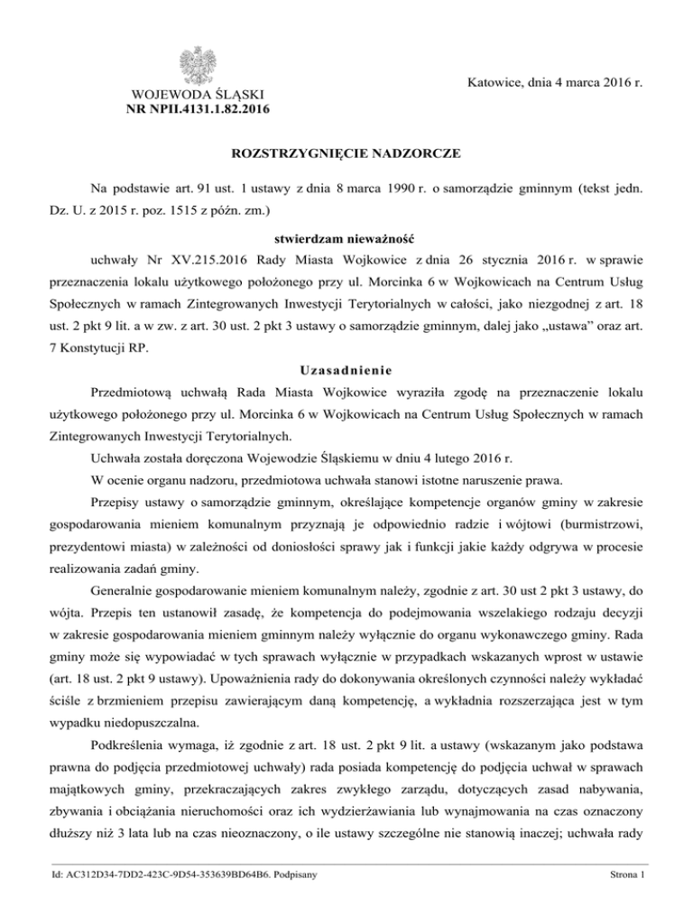 Katowice, dnia 4 marca 2016 r. WOJEWODA ŚLĄSKI NR NPII.4131.1.82.2016 ROZSTRZYGNIĘCIE NADZORCZE Na podstawie art. 91 ust. 1 ustawy z dnia 8 marca 1990 r. o samorządzie gminnym (tekst jedn. Dz. U. z 2015 r. poz. 1515 z późn. zm.) stwierdzam nieważność uchwały Nr XV.215.2016 Rady Miasta Wojkowice z dnia 26 stycznia 2016 r. w sprawie przeznaczenia lokalu użytkowego położonego przy ul. Morcinka 6 w Wojkowicach na Centrum Usług Społecznych w ramach Zintegrowanych Inwestycji Terytorialnych w całości, jako niezgodnej z art. 18 ust. 2 pkt 9 lit. a w zw. z art. 30 ust. 2 pkt 3 ustawy o samorządzie gminnym, dalej jako „ustawa” oraz art. 7 Konstytucji RP. Uzasadnienie Przedmiotową uchwałą Rada Miasta Wojkowice wyraziła zgodę na przeznaczenie lokalu użytkowego położonego przy ul. Morcinka 6 w Wojkowicach na Centrum Usług Społecznych w ramach Zintegrowanych Inwestycji Terytorialnych. Uchwała została doręczona Wojewodzie Śląskiemu w dniu 4 lutego 2016 r. W ocenie organu nadzoru, przedmiotowa uchwała stanowi istotne naruszenie prawa. Przepisy ustawy o samorządzie gminnym, określające kompetencje organów gminy w zakresie gospodarowania mieniem komunalnym przyznają je odpowiednio radzie i wójtowi (burmistrzowi, prezydentowi miasta) w zależności od doniosłości sprawy jak i funkcji jakie każdy odgrywa w procesie realizowania zadań gminy. Generalnie gospodarowanie mieniem komunalnym należy, zgodnie z art. 30 ust 2 pkt 3 ustawy, do wójta. Przepis ten ustanowił zasadę, że kompetencja do podejmowania wszelakiego rodzaju decyzji w zakresie gospodarowania mieniem gminnym należy wyłącznie do organu wykonawczego gminy. Rada gminy może się wypowiadać w tych sprawach wyłącznie w przypadkach wskazanych wprost w ustawie (art. 18 ust. 2 pkt 9 ustawy). Upoważnienia rady do dokonywania określonych czynności należy wykładać ściśle z brzmieniem przepisu zawierającym daną kompetencję, a wykładnia rozszerzająca jest w tym wypadku niedopuszczalna. Podkreślenia wymaga, iż zgodnie z art. 18 ust. 2 pkt 9 lit. a ustawy (wskazanym jako podstawa prawna do podjęcia przedmiotowej uchwały) rada posiada kompetencję do podjęcia uchwał w sprawach majątkowych gminy, przekraczających zakres zwykłego zarządu, dotyczących zasad nabywania, zbywania i obciążania nieruchomości oraz ich wydzierżawiania lub wynajmowania na czas oznaczony dłuższy niż 3 lata lub na czas nieoznaczony, o ile ustawy szczególne nie stanowią inaczej; uchwała rady ————————————————————————————————————————————————————————— Id: AC312D34-7DD2-423C-9D54-353639BD64B6. Podpisany Strona 1 gminy jest wymagana również w przypadku, gdy po umowie zawartej na czas oznaczony do 3 lat strony zawierają kolejne umowy, których przedmiotem jest ta sama nieruchomość; do czasu określenia zasad wójt może dokonywać tych czynności wyłącznie za zgodą rady gminy. Uznać zatem należy, iż w przepisie art. 18 ust. 2 pkt 9 lit. a ustawy, ustawodawca przyznał organowi stanowiącemu gminy pewne kompetencje w zakresie zarządu mieniem, które ograniczają wójta (burmistrza, prezydenta miasta) w powyższym zakresie, jednakże odnoszą się wyłącznie do wskazanych w wyżej wymienionym przepisie czynności. Tymczasem przedmiotowa uchwała nie dotyczy czynności wymienionych w art. 18 ust. 2 pkt 9 lit. a, tylko przeznaczenia lokalu użytkowego, a zatem, zdaniem organu nadzoru, Rada podejmując przedmiotową uchwałę wykroczyła poza swoje kompetencje jednocześnie wkraczając w domenę organu wykonawczego. W tym miejscu wskazania wymaga, iż „jedną z podstawowych zasad działania organów administracji publicznej jest zasada praworządności, to jest działania tych organów na podstawie i w granicach prawa. Jest to zasada rangi konstytucyjnej (art. 7 Konstytucji RP), z której wynika w szczególności zakaz domniemywania kompetencji organu władzy publicznej, a tym samym nakaz by wszelkie działania organu władzy publicznej były oparte na wyraźnie określonej normie kompetencyjnej. Organ władzy publicznej ma obowiązek wykazać istnienie normy kompetencyjnej, uprawniającej go do działania, niedopuszczalne jest bowiem poprzestawanie tylko na stwierdzeniu braku zakazu takiego działania w normach zawierających jego kompetencje ogólne (postanowienie 7 sędziów SN z 18 stycznia 2005 r., sygn. akt WK 22/04, OSNKW 2005, nr 3, poz. 29). Oznacza to, że w państwie praworządnym wszelka działalność władcza wymaga podstaw prawnych, tzn. legitymacji w prawnie nadanym upoważnieniu do działania. Sposób wykorzystywania kompetencji przez organy państwowe nie jest wyrazem arbitralności ich działania, lecz wynikiem realizacji przekazanych im uprawnień. Działania wykraczające poza ramy tych uprawnień są pozbawione legitymacji. Nie ma tu więc pola dla swobody w działalności organu władzy publicznej. Każde przekroczenie granic określonych przez Konstytucję, pozbawia taki organ legitymacji działania (B. Banaszak, Konstytucja Rzeczypospolitej Polskiej. Komentarz, Warszawa 2009, s. 57). W doktrynie zasadnie podkreśla się, że w państwie przyjmującym zasadę państwa prawnego kompetencje organów państwowych powinny wyraźnie wynikać z obowiązujących przepisów i nie można ich domniemywać lub tworzyć za pomocą wykładni. W państwie prawa nie jest dopuszczalne uzurpowanie sobie przez jakikolwiek organ kompetencji nieprzyznanych mu wyraźnie w normie prawnej (por. B. Banaszak, Proceduralne i materialnoprawne normy konstytucji (w:) J. Trzciński (red.), Charakter i struktura norm konstytucji, Warszawa 1997, s. 121).” (wyrok Wojewódzkiego Sądu Administracyjnego w Gdańsku z dnia 7 listopada 2013r., sygn. akt III Sa/Gd 583/13, Centralna Baza Orzeczeń Sądów Administracyjnych). Wobec powyższego, zdaniem organu nadzoru, Rada Miasta Wojkowice podjęła p