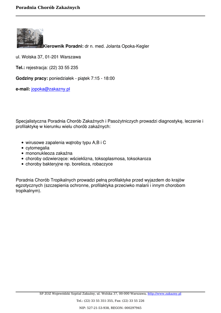 Poradnia Chorób Zakaźnych Kierownik Poradni: dr n. med. Jolanta Opoka-Kegler ul. Wolska 37, 01-201 Warszawa Tel.: rejestracja: (22) 33 55 235 Godziny pracy: poniedziałek - piątek 7:15 - 18:00 e-mail: [email protected] Specjalistyczna Poradnia Chorób Zakaźnych i Pasożytniczych prowadzi diagnostykę, leczenie i profilaktykę w kierunku wielu chorób zakaźnych: wirusowe zapalenia wątroby typu A,B i C cytomegalia mononukleoza zakaźna choroby odzwierzęce: wścieklizna, toksoplasmosa, toksokaroza choroby bakteryjne np. borelioza, robaczyce Poradnia Chorób Tropikalnych prowadzi pełną profilaktyke przed wyjazdem do krajów egzotycznych (szczepienia ochronne, profilaktyka przeciwko malarii i innym chorobom tropikalnym). SP ZOZ Wojewódzki Szpital Zakaźny, ul. Wolska 37, 00-000 Warszawa, http://www.zakazny.pl Tel.: (22) 33 55 351-355, Fax: (22) 33 55 226 NIP: 527-21-53-938, REGON: 000297945