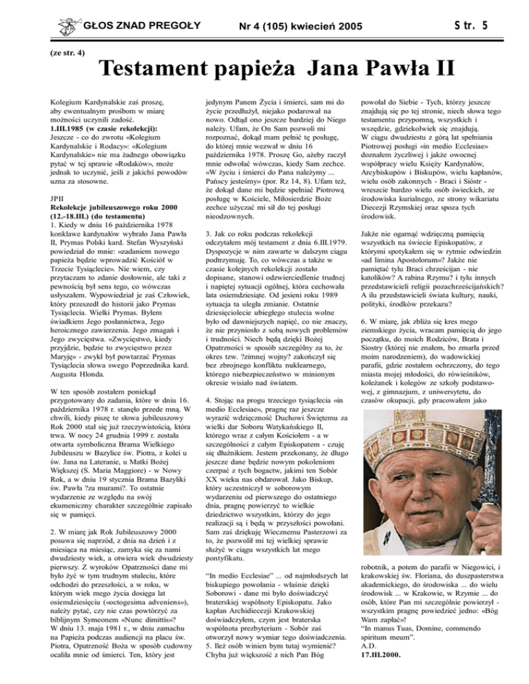GŁOS ZNAD PREGOŁY Nr 4 (105) kwiecień 2005 Str. 5 (ze str. 4) Testament papieża Jana Pawła II Kolegium Kardynalskie zaś proszę, aby ewentualnym prośbom w miarę możności uczynili zadość. 1.III.1985 (w czasie rekolekcji): Jeszcze - co do zwrotu «Kolegium Kardynalskie i Rodacy»: «Kolegium Kardynalskie» nie ma żadnego obowiązku pytać w tej sprawie «Rodaków», może jednak to uczynić, jeśli z jakichś powodów uzna za stosowne. JPII Rekolekcje jubileuszowego roku 2000 (12.-18.III.) (do testamentu) 1. Kiedy w dniu 16 października 1978 konklawe kardynałów wybrało Jana Pawła II, Prymas Polski kard. Stefan Wyszyński powiedział do mnie: «zadaniem nowego papieża będzie wprowadzić Kościół w Trzecie Tysiąclecie». Nie wiem, czy przytaczam to zdanie dosłownie, ale taki z pewnością był sens tego, co wówczas usłyszałem. Wypowiedział je zaś Człowiek, który przeszedł do historii jako Prymas Tysiąclecia. Wielki Prymas. Byłem świadkiem Jego posłannictwa, Jego heroicznego zawierzenia. Jego zmagań i Jego zwycięstwa. «Zwycięstwo, kiedy przyjdzie, będzie to zwycięstwo przez Maryję» - zwykł był powtarzać Prymas Tysiąclecia słowa swego Poprzednika kard. Augusta Hlonda. W ten sposób zostałem poniekąd przygotowany do zadania, które w dniu 16. października 1978 r. stanęło przede mną. W chwili, kiedy piszę te słowa jubileuszowy Rok 2000 stał się już rzeczywistością, która trwa. W nocy 24 grudnia 1999 r. została otwarta symboliczna Brama Wielkiego Jubileuszu w Bazylice św. Piotra, z kolei u św. Jana na Lateranie, u Matki Bożej Większej (S. Maria Maggiore) - w Nowy Rok, a w dniu 19 stycznia Brama Bazyliki św. Pawła ?za murami?. To ostatnie wydarzenie ze względu na swój ekumeniczny charakter szczególnie zapisało się w pamięci. 2. W miarę jak Rok Jubileuszowy 2000 posuwa się naprzód, z dnia na dzień i z miesiąca na miesiąc, zamyka się za nami dwudziesty wiek, a otwiera wiek dwudziesty pierwszy. Z wyroków Opatrzności dane mi było żyć w tym trudnym stuleciu, które odchodzi do przeszłości, a w roku, w którym wiek mego życia dosięga lat osiemdziesięciu («octogesima adveniens»), należy pytać, czy nie czas powtórzyć za biblijnym Symeonem «Nunc dimittis»? W dniu 13. maja 1981 r., w dniu zamachu na Papieża podczas audiencji na placu św. Piotra, Opatrzność Boża w sposób cudowny ocaliła mnie od śmierci. Ten, który jest jedynym Panem Życia i śmierci, sam mi do życie przedłużył, niejako podarował na nowo. Odtąd ono jeszcze bardziej do Niego należy. Ufam, że On Sam pozwoli mi rozpoznać, dokąd mam pełnić tę posługę, do której mnie wezwał w dniu 16 października 1978. Proszę Go, ażeby raczył mnie odwołać wówczas, kiedy Sam zechce. «W życiu i śmierci do Pana należymy ... Pańscy jesteśmy» (por. Rz 14, 8). Ufam też, że dokąd dane mi będzie spełniać Piotrową posługę w Kościele, Miłosierdzie Boże zechce użyczać mi sił do tej posługi nieodzownych. powołał do Siebie - Tych, którzy jeszcze znajdują się po tej stronie, niech słowa tego testamentu przypomną, wszystkich i wszędzie, gdziekolwiek się znajdują. W ciągu dwudziestu z górą lat spełniania Piotrowej posługi «in medio Ecclesiae» doznałem życzliwej i jakże owocnej współpracy wielu Księży Kardynałów, Arcybiskupów i Biskupów, wielu kapłanów, wielu osób zakonnych - Braci i Sióstr wreszcie bardzo wielu osób świeckich, ze środowiska kurialnego, ze strony wikariatu Diecezji Rzymskiej oraz spoza tych środowisk. 3. Jak co roku podczas rekolekcji odczytałem mój testament z dnia 6.III.1979. Dyspozycje w nim zawarte w dalszym ciągu podtrzymuję. To, co wówczas a także w czasie kolejnych rekolekcji zostało dopisane, stanowi odzwierciedlenie trudnej i napiętej sytuacji ogólnej, która cechowała lata osiemdziesiąte. Od jesieni roku 1989 sytuacja ta uległa zmianie. Ostatnie dziesięciolecie ubiegłego stulecia wolne było od dawniejszych napięć, co nie znaczy, że nie przyniosło z sobą nowych problemów i trudności. Niech będą dzięki Bożej Opatrzności w sposób szczególny za to, że okres tzw. ?zimnej wojny? zakończył się bez zbrojnego konfliktu nuklearnego, którego niebezpieczeństwo w minionym okresie wisiało nad światem. Jakże nie ogarnąć wdzięczną pamięcią wszystkich na świecie Episkopatów, z którymi spotykałem się w rytmie odwiedzin «ad limina Apostolorum»? Jakże nie pamiętać tylu Braci chrześcijan - nie katolików? A rabina Rzymu? i tylu innych przedstawicieli religii pozachrześcijańskich? A ilu przedstawicieli świata kultury, nauki, polityki, środków przekazu? 4. Stojąc na progu trzeciego tysiąclecia «in medio Ecclesiae», pragnę raz jeszcze wyrazić wdzięczność Duchowi Świętemu za wielki dar Soboru Watykańskiego II, którego wraz z całym Kościołem - a w szczególności z całym Episkopatem - czuję się dłużnikiem. Jestem przekonany, że długo jeszcze dane będzie nowym pokoleniom czerpać z tych bogactw, jakimi ten Sobór XX wieku nas obdarował. Jako Biskup, który uczestniczył w soborowym wydarzeniu od pierwszego do ostatniego dnia, pragnę powierzyć to wielkie dziedzictwo wszystkim, którzy do jego realizacji są i będą w przyszłości powołani. Sam zaś dziękuję Wiecznemu Pasterzowi za to, że pozwolił mi tej wielkiej sprawie służyć w ciągu wszystkich lat mego pontyfikatu. “In medio Ecclesiae” ... od najmłodszych lat biskupiego powołania - właśnie dzięki Soborowi - dane mi było doświadczyć braterskiej wspólnoty Episkopatu. Jako kapłan Archidiecezji Krakowskiej doświadczyłem, czym jest braterska wspólnota prezbyterium - Sobór zaś otworzył nowy wymiar tego doświadczenia. 5. Ileż osób winien bym tutaj wymienić? Chyba już większość z nich Pan Bóg 6. W miarę, jak zbliża się kres mego ziemskiego życia, wracam pamięcią do jego początku, do moich Rodziców, Brata i Siostry 