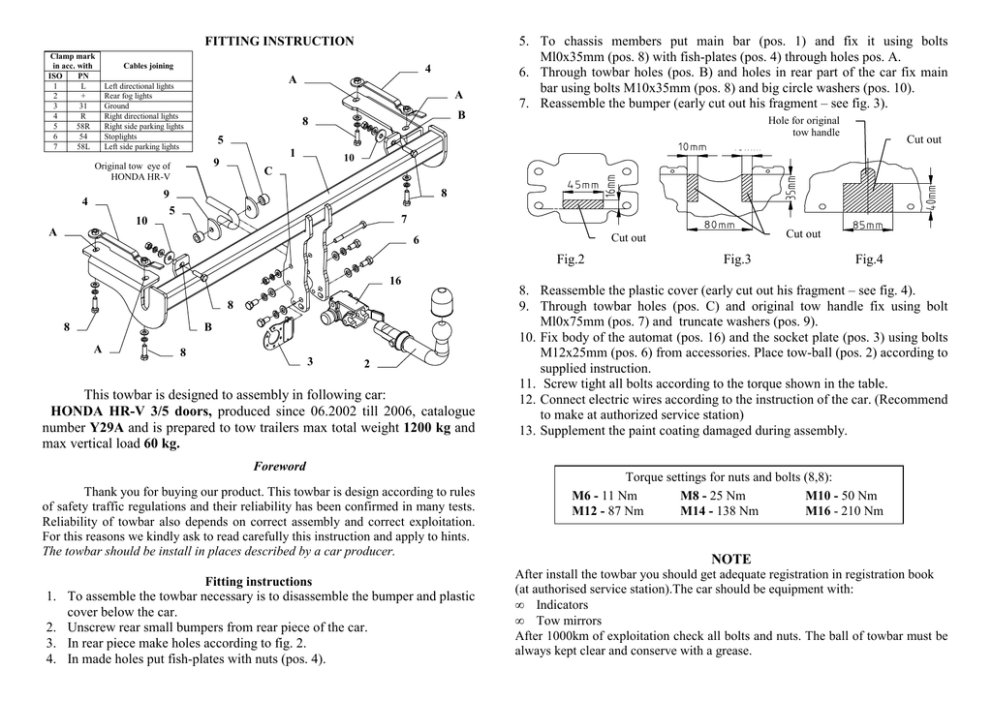 FITTING INSTRUCTION Clamp mark in acc. with ISO PN 1 L 2 + 3 31 4 R 5 58R 6 54 7 58L Cables joining 4 A Left directional lights Rear fog lights Ground Right directional lights Right side parking lights Stoplights Left side parking lights A 10 Hole for original tow handle 5 1 9 Original tow eye of HONDA HR-V 4 B 8 5. To chassis members put main bar (pos. 1) and fix it using bolts Ml0x35mm (pos. 8) with fish-plates (pos. 4) through holes pos. A. 6. Through towbar holes (pos. B) and holes in rear part of the car fix main bar using bolts M10x35mm (pos. 8) and big circle washers (pos. 10). 7. Reassemble the bumper (early cut out his fragment – see fig. 3). 10 C 8 9 5 7 A Fig.2 16 8 8 B 8 3 2 This towbar is designed to assembly in following car: HONDA HR-V 3/5 doors, produced since 06.2002 till 2006, catalogue number Y29A and is prepared to tow trailers max total weight 1200 kg and max vertical load 60 kg. Foreword Thank you for buying our product. This towbar is design according to rules of safety traffic regulations and their reliability has been confirmed in many tests. Reliability of towbar also depends on correct assembly and correct exploitation. For this reasons we kindly ask to read carefully this instruction and apply to hints. The towbar should be install in places described by a car producer. Fitting instructions 1. To assemble the towbar necessary is to disassemble the bumper and plastic cover below the car. 2. Unscrew rear small bumpers from rear piece of the car. 3. In rear piece make holes according to fig. 2. 4. In made holes put fish-plates with nuts (pos. 4). Cut out Cut out 6 A Cut out Fig.3 Fig.4 8. Reassemble the plastic cover (early cut out his fragment – see fig. 4). 9. Through towbar holes (pos. C) and original tow handle fix using bolt Ml0x75mm (pos. 7) and truncate washers (pos. 9). 10. Fix body of the automat (pos. 16) and the socket plate (pos. 3) using bolts M12x25mm (pos. 6) from accessories. Place tow-ball (pos. 2) according to supplied instruction. 11. Screw tight all bolts according to the torque shown in the table. 12. Connect electric wires according to the instruction of the car. (Recommend to make at authorized service station) 13. Supplement the paint coating damaged during assembly. Torque settings for nuts and bolts (8,8): M6 - 11 Nm M8 - 25 Nm M10 - 50 Nm M12 - 87 Nm M14 - 138 Nm M16 - 210 Nm NOTE After install the towbar you should get adequate registration in registration book (at authorised service station).The car should be equipment with: • Indicators • Tow mirrors After 1000km of exploitation check all bolts and nuts. The ball of towbar must be always kept clear and conserve with a grease. PPUH AUTO-HAK Sp.J. Towbar accessories: Produkcja Zaczepów Kulowych Henryk & Zbigniew Nejman 76-200 SŁUPSK ul. Słoneczna 16K tel/fax (059) 8-414-414; 8-414-413 E-mail: [email protected] www. autohak.com.pl Towing hitch (without electrical set) Class: A50-X Cat. no. Y29A Technical data: D-value: 6,83 kN maximum trailer weight: 1200 kg maximum vertical cup load: 60 kg Designed for: Manufacturer: HONDA Model: HR-V Type: 3-5 doors produced since 06.2002 till 2006 Approval number according to Directive 94/20/EC: e20*94/20*1012*00 Foreword This towbar is designed according to rules of safety traffic regulations. The towing hitch is a safety component and can be install only by qualified personnel. Any alteration or conversion of the towing hitch is prohibited and would lead to cancellation of design certification. Remove insulating compound and underseal from vehicle (if present) in the area of the matting surfaces of the towing hitch. The vehicle manufacturer’s specifications regarding trailer load and max. vertical cup load are decisive for driving, and values for the towing hitch cannot be exceeded. D-value formula: Max trailer weight [kg] x Max vehicle weight [kg] Max trailer weight [kg] + Max vehicle weight [kg] X 9,81 = 1000 D [kN] INSTRUKCJA Oznaczenie zacisku wg ISO PN 1 L 2 + 3 31 4 R 5 58R 6 54 7 58L MontaŜu i eksploatacji zaczepu kulowego Łączenie przewodów 4 Kierunkowskazy lewe Tylne światła przeciwmgłowe Masa Kierunkowskazy prawe Światła pozycyjne prawe Światła hamowania Światła pozycyjne lewe A A 10 Otwór na fabryczne ucho holownicze 5 Oryginalne ucho holownicze samochodu HONDA HR-V 4 B 8 4. W wykonane otwory włoŜyć nakładki z nakrętkami (poz. 4). 5. Do podłuŜnic samochodu przyłoŜyć belkę (poz. 1) i skręcić śrubami Ml0x35mm (poz. 8) z włoŜonymi nakładkami poprzez otwory poz. A. 6. Poprzez otwory zaczepu (poz. B) i otwory w tylnym płacie skręcić śrubami M10x35mm (poz. 8) wykorzystując duŜe podkładki (poz. 10). 7. Zamontować zderzak po uprzednim wycięciu fragmentu jak na rys. 3. 1 9 C 8 9 5 7 A 6 16 8 8 8 8. 9. 3 2 Zaczep kulowy przeznaczony jest do zamontowania w samochodzie: HONDA HR-V 3/5 drz., produkowanym od 06.2002r. do 2006r., nr katalogowy Y29A i słuŜy do ciągnięcia przyczep o masie całkowitej 1200 kg i nacisku na kulę max 60 kg. INFORMACJA WSTĘPNA Zaczep kulowy jest skonstruowany zgodnie z zasadami bezpieczeństwa ruchu drogowego a jego niezawodność została potwierdzona licznymi testami. JednakŜe niezawodność zaczepów kulowych jest zaleŜna równieŜ od prawidłowego montaŜu oraz prawidłowej eksploatacji. Z tego powodu prosimy Państwa o staranne przeczytanie niniejszej instrukcji montaŜu oraz przestrzeganie właściwych wskazówek. Zaczep naleŜy zamontować w miejscach do tego celu przeznaczonych przez producenta samochodu. Kolejność czynności przy montaŜu 1. W celu zamontowania zaczepu naleŜy zdemontować zderzak oraz osłonę z tworzywa od spodu samochodu. 2. Odkręcić metalowe odbojniki od tylnego płata. 3. W tylnym płacie wykonać otwory podłuŜne wg rys. 2. Wyciąć Wyciąć B A Wyciąć 10 10. 11. 12. 13. Rys.2 Rys.3 Rys.4 Zamontować osłonę plastykową po uprzednim wycięciu jego fragmentu wg rys. 4. Poprzez otwór zaczepu (poz. C) oraz fabryczne ucho do holo