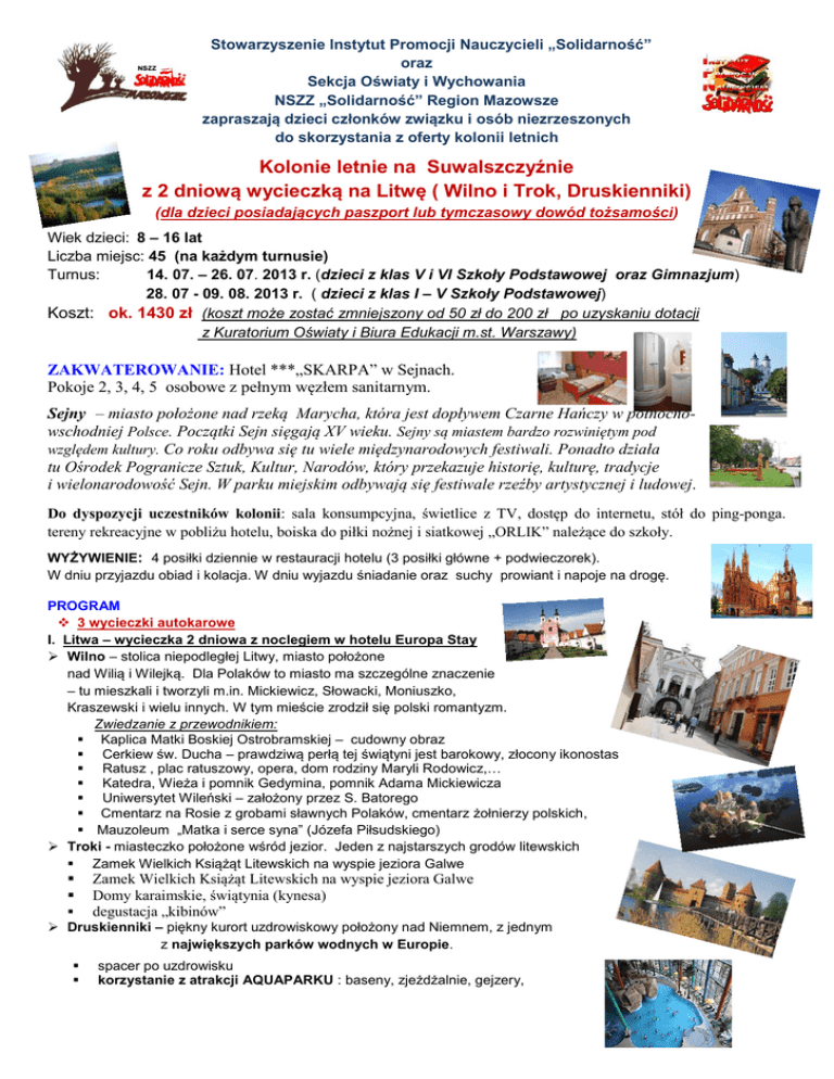 Stowarzyszenie Instytut Promocji Nauczycieli „Solidarność” oraz Sekcja Oświaty i Wychowania NSZZ „Solidarność” Region Mazowsze zapraszają dzieci członków związku i osób niezrzeszonych do skorzystania z oferty kolonii letnich Kolonie letnie na Suwalszczyźnie z 2 dniową wycieczką na Litwę ( Wilno i Trok, Druskienniki) (dla dzieci posiadających paszport lub tymczasowy dowód tożsamości) Wiek dzieci: 8 – 16 lat Liczba miejsc: 45 (na każdym turnusie) Turnus: 14. 07. – 26. 07. 2013 r. (dzieci z klas V i VI Szkoły Podstawowej oraz Gimnazjum) 28. 07 - 09. 08. 2013 r. ( dzieci z klas I – V Szkoły Podstawowej) Koszt: ok. 1430 zł (koszt może zostać zmniejszony od 50 zł do 200 zł po uzyskaniu dotacji z Kuratorium Oświaty i Biura Edukacji m.st. Warszawy) ZAKWATEROWANIE: Hotel ***„SKARPA” w Sejnach. Pokoje 2, 3, 4, 5 osobowe z pełnym węzłem sanitarnym. Sejny – miasto położone nad rzeką Marycha, która jest dopływem Czarne Hańczy w północnowschodniej Polsce. Początki Sejn sięgają XV wieku. Sejny są miastem bardzo rozwiniętym pod względem kultury. Co roku odbywa się tu wiele międzynarodowych festiwali. Ponadto działa tu Ośrodek Pogranicze Sztuk, Kultur, Narodów, który przekazuje historię, kulturę, tradycje i wielonarodowość Sejn. W parku miejskim odbywają się festiwale rzeźby artystycznej i ludowej. Do dyspozycji uczestników kolonii: sala konsumpcyjna, świetlice z TV, dostęp do internetu, stół do ping-ponga. tereny rekreacyjne w pobliżu hotelu, boiska do piłki nożnej i siatkowej „ORLIK” należące do szkoły. WYŻYWIENIE: 4 posiłki dziennie w restauracji hotelu (3 posiłki główne + podwieczorek). W dniu przyjazdu obiad i kolacja. W dniu wyjazdu śniadanie oraz suchy prowiant i napoje na drogę. PROGRAM 3 wycieczki autokarowe I. Litwa – wycieczka 2 dniowa z noclegiem w hotelu Europa Stay Wilno – stolica niepodległej Litwy, miasto położone nad Wilią i Wilejką. Dla Polaków to miasto ma szczególne znaczenie – tu mieszkali i tworzyli m.in. Mickiewicz, Słowacki, Moniuszko, Kraszewski i wielu innych. W tym mieście zrodził się polski romantyzm. Zwiedzanie z przewodnikiem: Kaplica Matki Boskiej Ostrobramskiej – cudowny obraz Cerkiew św. Ducha – prawdziwą perłą tej świątyni jest barokowy, złocony ikonostas Ratusz , plac ratuszowy, opera, dom rodziny Maryli Rodowicz,… Katedra, Wieża i pomnik Gedymina, pomnik Adama Mickiewicza Uniwersytet Wileński – założony przez S. Batorego Cmentarz na Rosie z grobami sławnych Polaków, cmentarz żołnierzy polskich, Mauzoleum „Matka i serce syna” (Józefa Piłsudskiego) Troki - miasteczko położone wśród jezior. Jeden z najstarszych grodów litewskich Zamek Wielkich Książąt Litewskich na wyspie jeziora Galwe Zamek Wielkich Książąt Litewskich na wyspie jeziora Galwe Domy karaimskie, świątynia (kynesa) degustacja „kibinów” Druskienniki – piękny kurort uzdrowiskowy położony nad Niemnem, z jednym z największych parków wodnych w Europie. spacer po uzdrowisku korzystanie z atrakcji AQUAPARKU : baseny, zjeżdżalnie, gejzery, II. Szlak Papieski - wycieczka autokarowa po Suwalszczyźnie Wigry – klasztorny zespół kamedulski: wieża, eremy, kościół, apartamenty papieskie, których mieszkał Jan Paweł II w 1999 r. Studzieniczna – mała miejscowość, w której jest zabytkowy drewniany kościół, Kapliczka na wyspie jeziora oraz studnia. Na pamiątkę pobytu Jana Pawła II postawiono piękny pomnik Rejs statkiem ze Studzienicznej do Augustowa – statek przepływa przez śluzy, które podnoszą do góry i opuszczają, aby wyrównać różnicę poziomów między jeziorami Augustów – miasto królewskie, założone przez króla Zygmunta Augusta KANAŁ AUGUSTOWSKI to bezcenne, unikatowe w skali europejskiej dzieło budownictwa wodnego z pierwszej połowy XIX wieku. spacer po Rynku Zygmunta Augusta pobyt na plaży i terenach rekreacyjnych nad Jeziorem Necko III. Wycieczka autokarowa po Suwalszczyźnie: Suwałki Suwalska starówka oraz piękny park Muzeum im. Marii Konopnickiej Muzeum Okręgowe, w tym bogate zbiory minerałów z rejonu Suwalszczyzny Muzeum Historii i Tradycji Żołnierzy Suwalszczyzny Przejażdżka Wigierską Kolejką Wąskotorową, której szlak prowadzi przez Wigierski Park Narodowy i Puszczę Augustowską. Wzdłuż trasy, tuż nad brzegiem jeziora Wigry znajdują się przystanki widokowe. Stańczyki - Akwedukty Puszczy Rominckiej' - potężne wiadukty o długości 200 m. i wysokości 36 m. (nieczynnej obecnie) linii kolejowej Gołdap – Żytkiejmy. Filary mostów ozdobione są elementami wzorowanymi na rzymskich akweduktach w Pont du Gard, Wiżajny – trójstyk granic: Polska – Rosja - Litwa Wycieczki po Sejnach i okolicy plażowanie nad jeziorem i kąpiele pod opieką ratownika przejażdżka „ciuchcią” po Sejnach i okolicy – 2 razy w tygodniu DODATKOWE ATRAKCJE: zabawy integracyjne na placu zabaw i w świetlicach wybory Miss i Mistera kolonii konkursy z nagrodami (plastyczne, rysunkowe, piosenkarskie, taneczne, itp.) gimnastyka ogólnorozwojowa, gry zespołowe na boisku Orlik dyskoteki, bal przebierańców TRANSPORT: autokar klasy turystycznej (klimatyzacja, wideo, nagłośnienie) OPIEKA MEDYCZNA: pielęgniarka, lekarz (według potrzeb) WYKWALIFIKOWANA KADRA PEDAGOGICZNA Na zakończenie każdego z turnusów uczestnicy otrzymują nagrody, pamiątkowe upominki i dyplomy. Zgłoszenia przez organizacje związkowe lub indywidualnie do dnia 15 kwietnia 2013 roku. Liczba miejsc ograniczona – zgłoszenie do 15 kwietnia gwarantuje miejsce na kolonii. Regionalna Sekcja Oświaty i Wychowania ul. Wolska 46/48 01-187 Warszawa, tel. 22 632 91 99 Dział Informacji i Promocji Regionu Mazowsze ul. Wolska 47 01-201 Warszawa, tel. 22 314 80 17 Przed pobraniem karty kolonijnej obowiązuje wpłata zaliczki w wysokości 200,00 złotych. Numer rachunku bankowego udostępniony będzie po telefonicznym zgłoszeniu uczestni