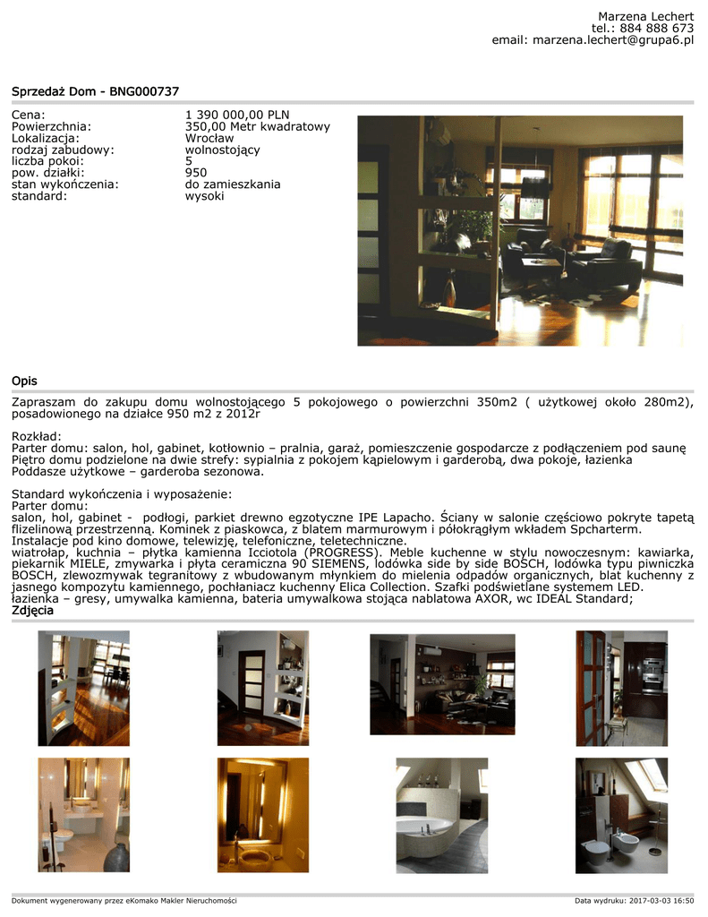 Marzena Lechert tel.: 884 888 673 email: [email protected] Sprzedaż Dom - BNG000737 Cena: Powierzchnia: Lokalizacja: rodzaj zabudowy: liczba pokoi: pow. działki: stan wykończenia: standard: 1 390 000,00 PLN 350,00 Metr kwadratowy Wrocław wolnostojący 5 950 do zamieszkania wysoki Opis Zapraszam do zakupu domu wolnostojącego 5 pokojowego o powierzchni 350m2 ( użytkowej około 280m2), posadowionego na działce 950 m2 z 2012r Rozkład: Parter domu: salon, hol, gabinet, kotłownio – pralnia, garaż, pomieszczenie gospodarcze z podłączeniem pod saunę Piętro domu podzielone na dwie strefy: sypialnia z pokojem kąpielowym i garderobą, dwa pokoje, łazienka Poddasze użytkowe – garderoba sezonowa. Standard wykończenia i wyposażenie: Parter domu: salon, hol, gabinet - podłogi, parkiet drewno egzotyczne IPE Lapacho. Ściany w salonie częściowo pokryte tapetą flizelinową przestrzenną. Kominek z piaskowca, z blatem marmurowym i półokrągłym wkładem Spcharterm. Instalacje pod kino domowe, telewizję, telefoniczne, teletechniczne. wiatrołap, kuchnia – płytka kamienna Icciotola (PROGRESS). Meble kuchenne w stylu nowoczesnym: kawiarka, piekarnik MIELE, zmywarka i płyta ceramiczna 90 SIEMENS, lodówka side by side BOSCH, lodówka typu piwniczka BOSCH, zlewozmywak tegranitowy z wbudowanym młynkiem do mielenia odpadów organicznych, blat kuchenny z jasnego kompozytu kamiennego, pochłaniacz kuchenny Elica Collection. Szafki podświetlane systemem LED. łazienka – gresy, umywalka kamienna, bateria umywalkowa stojąca nablatowa AXOR, wc IDEAL Standard; Zdjęcia Dokument wygenerowany przez eKomako Makler Nieruchomości Data wydruku: 2017-03-03 16:50