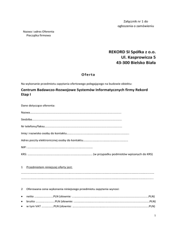 Załącznik nr 1 do ogłoszenia o zamówieniu Nazwa i adres Oferenta Pieczątka firmowa ……………………………………………. REKORD SI Spółka z o.o. Ul. Kasprowicza 5 43-300 Bielsko Biała Oferta Na wykonanie przedmiotu zapytania ofertowego polegającego na budowie obiektu: Centrum Badawczo-Rozwojowe Systemów Informatycznych firmy Rekord Etap I Dane dotyczące oferenta: Nazwa............................................................................................................... Siedziba............................................................................................................. Nr telefonu/faksu.............................................................................................. Imię i nazwisko osoby do kontaktu……………………………………………………………………….. Adres poczty elektronicznej osoby do kontaktu…………………………………………………… NIP: …………………………………………………………………………… KRS: ………………………………………………………………………….. (w przypadku podmiotów wpisanych do KRS) 1 Przedmiotem niniejszej oferty jest: …………………………………………………………………………………………………………………………………………………………… ………………………………………………………………………………………………………………………………………………………….. 2 Oferowana cena wykonania niniejszego przedmiotu zapytania wynosi: netto ……………….……PLN (słownie: ………………………………………….................................................PLN) brutto …………..….....…PLN (słownie: …………………………………………………........................................PLN) w tym VAT ……….……PLN (słownie: ………………………………………….................................................PLN) 1 3 Termin wykonania przedmiotu zapytania ofertowegoodrozpoczęcia budowy: Realizacja całego zamówienia: II kwartał 2016 do IV kwartał 2016 (dotyczy etapu I) Przewidywany plan prac budowlanych: II kwartał 2016: Roboty ziemne Ławy, stopy i ściany fundamentowe Izolacje fundamentów Podkłady pod posadzki Drenaż Zbrojenie fundamentów Płyta żelbetowa III kwartał 2016: Ściany murowane i żelbetowe, rygle, rdzenie żelbetowe Stropy, schody IV kwartał 2016: Zbrojenie elementów żelbetowych Pokrycie dachu - cały budynek 4 Warunki płatności: Płatnośd przelewem w ciągu 30 dni od daty wystawienia faktury VAT. Płatnośd zostanie zrealizowana po zakooczeniu prac na podstawie protokołu zdawczoodbiorczego. Zamawiający dopuszcza możliwośd odbiorów częściowych oraz płatności częściowych za realizację poszczególnych etapów zamówienia. Warunkiem zapłaty wynagrodzenia Wykonawcy jest przedstawienie przez Wykonawcę dowodów zapłaty wymagalnego wynagrodzenia podwykonawcom i dalszym podwykonawcom i ich oświadczeo o otrzymaniu zapłaty od Wykonawcy najpóźniej trzy dni przed datą płatności faktury. 5 Warunki gwarancji: Wykonawca udziela 24 miesięcznej gwarancji na wykonany przedmiot Umowy licząc od daty protokołu koocowego. W przypadku wykrycia usterki Wykonawca zobowiązuje się do jej usunięcia w terminie 14 dni kalendarzowych licząc od dnia zgłoszenia usterki. W przypadku zwłoki w wypełnieniu obowiązków gwarancyjnych przez Wykonawcę zapłaci on Zamawiającemu karę umowną w wysokości 0,1% wartości brutto przedmiotu podlegającego naprawie gwarancyjnej za każdy dzieo opóźnienia. 6 Termin ważności oferty: ……………………………………………………………………………………………………………………………………………………… (Termin ważności oferty biegnący od upływu ostatecznego terminu na składanie ofertnie krótszy niż40 dni od upływu ostatecznego terminu na składanie ofert.) 3. Informacja o spełnieniu warunków udziału w postępowaniu: Spełnia. 2 Nie spełnia. Proszę skreślid niewłaściwą informację 4. Proszę skreślid niewłaściwe oświadczenie: Zamierzam powierzyd realizację części prac w ramach zamówienia podwykonawcom. Nie planuję powierzad realizacji części prac w ramach zamówienia podwykonawcom. OŚWIADCZENIA: 1. Oświadczamy, że zapoznaliśmy się z warunkami z zapytania ofertowego i uznajemy się za związanych określonymi w nim wymaganiami i zasadami postępowania oraz że uzyskaliśmy wszelkie niezbędne informacje do przygotowania oferty. 2. Oświadczamy, że cena ofertowa zawiera wszystkie niezbędne koszty do realizacji przedmiotu zamówienia. 3. Dokumenty i informacje składające się na ofertę są zgodne z prawdą i stanem na dzieo złożenia oferty. ……....................................................................... Miejsce, data, pieczęd(-cie) i podpisy osoby(ób) upoważnionej(-ych) do reprezentowania Oferenta Załącznikami do niniejszej oferty są: Załącznik nr 2 do ogłoszenia o zamówieniu – oświadczenie o powiązaniach osobowych Załącznik nr 3 do ogłoszenia o zamówieniu – oświadczenie dot. powiązao kapitałowych Załącznik nr 7 do ogłoszenia o zamówieniu – oświadczenie dot. spełnienia warunków udziału w postępowaniu Załącznik nr 8 do ogłoszenia o zamówieniu – oświadczenie dot. norm środowiskowych, jeśli dotyczy Kosztorys ofertowy opracowany przez oferenta, zgodny z przedmiarem robót budowlanych Kopia polisy OC dotyczącej prowadzenia działalności gospodarczej potwierdzoną za zgodnośd z oryginałem Inne: ……………………………………………………………………………………………………………………………………………………… …………………………………………………………………