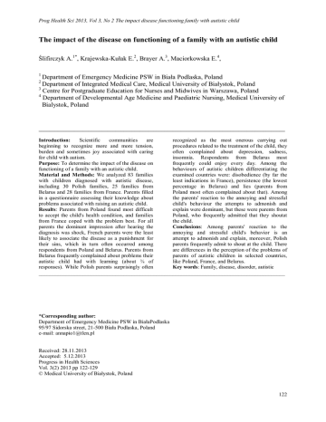 Prog Health Sci 2013, Vol 3, No 2 The impact disease functioning family with autistic child The impact of the disease on functioning of a family with an autistic child Ślifirczyk A.1*, Krajewska-Kułak E.2, Brayer A.3, Maciorkowska E.4, 1 Department of Emergency Medicine PSW in Biała Podlaska, Poland Department of Integrated Medical Care, Medical University of Białystok, Poland 3 Centre for Postgraduate Education for Nurses and Midwives in Warszawa, Poland 4 Department of Developmental Age Medicine and Paediatric Nursing, Medical University of Bialystok, Poland 2 __________________________________________________________________________________________ Introduction: Scientific communities are recognized as the most onerous carrying out beginning to recognize more and more tension, procedures related to the treatment of the child, they burden and sometimes joy associated with caring often complained about depression, sadness, for child with autism. insomnia. Respondents from Belarus most Purpose: To determine the impact of the disease on frequently could enjoy every day. Among the functioning of a family with an autistic child. behaviours of autistic children differentiating the Material and Methods: We analyzed 83 families examined countries were: disobedience (by far the with children diagnosed with autistic disease, least indications in France), persistence (the lowest including 30 Polish families, 25 families from percentage in Belarus) and lies (parents from Belarus and 28 families from France. Parents filled Poland most often complained about that). Among in a questionnaire assessing their knowledge about the parents' reaction to the annoying and stressful problems associated with raising an autistic child. child's behaviour the attempts to admonish and Results: Parents from Poland found most difficult explain were dominant, but these were parents from to accept the child's health condition, and families Poland, who frequently admitted that they shoutat from France coped with the problem best. For all the child. parents the dominant impression after hearing the Conclusions: Among parents' reaction to the diagnosis was shock, French parents were the least annoying and stressful child's behavior is an likely to associate the disease as a punishment for attempt to admonish and explain, moreover, Polish their sins, which in turn often occurred among parents frequently admit to shout at the child. There respondents from Poland and Belarus. Parents from are differences in the perception of the problems of Belarus frequently complained about problems their parents of autistic children in selected countries, autistic child had with learning (about ¾ of like Poland, France, and Belarus. responses). While Polish parents surprisingly often Key words: Family, disease, disorder, autistic __________________________________________________________________________________________ *Corresponding author: Department of Emergency Medicine PSW in BiałaPodlaska 95/97 Sidorska street, 21-500 Biała Podlaska, Poland e-mail: [email protected] Received: 28.11.2013 Accepted: 5.12.2013 Progress in Health Sciences Vol. 3(2) 2013 pp 122-129 © Medical University of Białystok, Poland 122 Prog Health Sci 2013, Vol 3, No 2 The impact disease functioning family with autistic child INTRODUCTION Autism is a pervasive developmental disorder that is present in almost all communities. Characterized by abnormalities in social interaction, communication, and severe restrictions on the activities and interests. In the last decade the number of children with this diagnosis has increased dramatically to 15 people per 10 000, live births [1]. The first epidemiological studies of autism were completed in 1966 in the UK [2]. They were conducted by Lotter [2] in Middlesex County, and he made screening of all children between 8 and 10 years of age, using questionnaires that were sent to teachers and other professionals working with children. He examined a total of about 78,000 people and initially identified 135 potentially exposed to this disorder. Among this, group finally emerged 35 people who met the diagnostic criteria developed by Kanner (i.e., rigidity of patterns and behaviour and withdrawal from social relations, these symptoms occurred before the age of five years). In these studies, Lotter [2] estimated autism prevalence at approximately 4.5 / 10 000, and the ratio of autistic girls to boys described as 2.6 to 1. According to the most current research on autism the average assumed rate of morbidity is the value of 20.6 / 10, 000 cases, with more than four fold predominance of boys over girls [3]. Scientific communities are beginning to recognize more and more tension, burden and sometimes joy associated with an autistic child care. The diagnosis of autism in a child means a very high level of stress to the parents. In many situations, this stress is accompanied by social and behavioral difficulties and feeling of guilt resulting from the attitude of the community, which attributes it to "bad upbringing of the child" by their parents [4]. In the past, parents blamed themselves for the birth of an autistic child and resigned from various therapy programs and education of that child. Children with autism were often left unnoticed, “hidden” in the house and diagnosed too late. Parents struggling with problems of an autistic child in everyday life note that providing assistance to people with autism throughout the life is a reality which they have to face. Parents are overcome with fear and uncertainty about where to find loving, lifelong help that is available regardless of how difficult and abnormal behavior their children have. Thus, some experience paradoxical confusion of hope and despair. In addition, longterm and cumulative stress over time causes immense tension both in each of the parents, and between them, and affects the extended family and the relationship between them. A number of problems are piling u