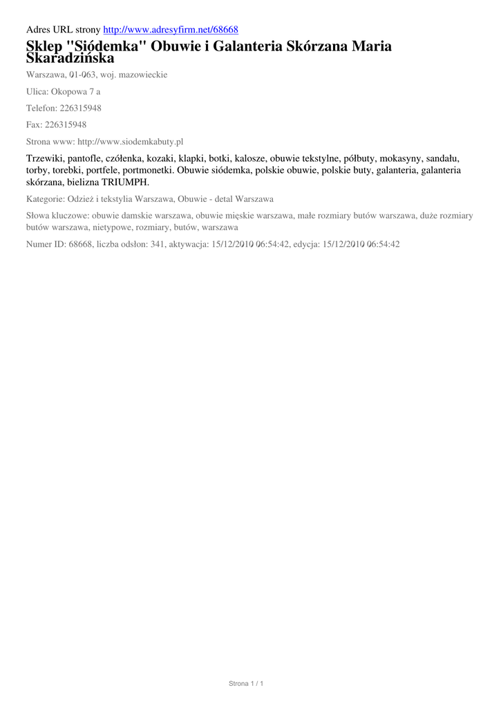 Adres URL strony http://www.adresyfirm.net/68668 Sklep "Siódemka" Obuwie i Galanteria Skórzana Maria Skaradzińska Warszawa, 01-063, woj. mazowieckie Ulica: Okopowa 7 a Telefon: 226315948 Fax: 226315948 Strona www: http://www.siodemkabuty.pl Trzewiki, pantofle, czółenka, kozaki, klapki, botki, kalosze, obuwie tekstylne, półbuty, mokasyny, sandału, torby, torebki, portfele, portmonetki. Obuwie siódemka, polskie obuwie, polskie buty, galanteria, galanteria skórzana, bielizna TRIUMPH. Kategorie: Odzież i tekstylia Warszawa, Obuwie - detal Warszawa Słowa kluczowe: obuwie damskie warszawa, obuwie mięskie warszawa, małe rozmiary butów warszawa, duże rozmiary butów warszawa, nietypowe, rozmiary, butów, warszawa Numer ID: 68668, liczba odsłon: 341, aktywacja: 15/12/2010 06:54:42, edycja: 15/12/2010 06:54:42 Strona 1 / 1