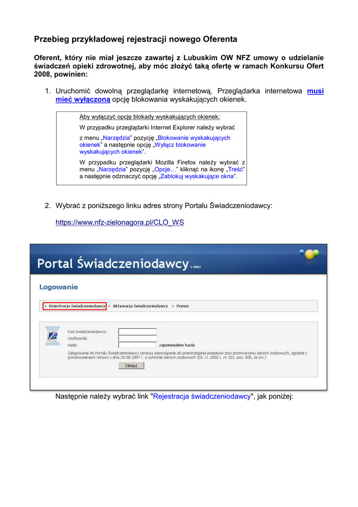 Przebieg przykładowej rejestracji nowego Oferenta Oferent, który nie miał jeszcze zawartej z Lubuskim OW NFZ umowy o udzielanie świadczeń opieki zdrowotnej, aby móc złoŜyć taką ofertę w ramach Konkursu Ofert 2008, powinien: 1. Uruchomić dowolną przeglądarkę internetową. Przeglądarka internetowa musi mieć wyłączoną opcję blokowania wyskakujących okienek. Aby wyłączyć opcję blokady wyskakujących okienek: W przypadku przeglądarki Internet Explorer naleŜy wybrać z menu „Narzędzia” pozycję „Blokowanie wyskakujących okienek” a następnie opcję „Wyłącz blokowanie wyskakujących okienek”. W przypadku przeglądarki Mozilla Firefox naleŜy wybrać z menu „Narzędzia” pozycję „Opcje…” kliknąć na ikonę „Treść” a następnie odznaczyć opcję „Zablokuj wyskakujące okna”. 2. Wybrać z poniŜszego linku adres strony Portalu Świadczeniodawcy: https://www.nfz-zielonagora.pl/CLO_WS Następnie naleŜy wybrać link "Rejestracja świadczeniodawcy", jak poniŜej: 3. W oknie formularza rejestracyjnego w punkcie 1. naleŜy podać swoje dane, jak poniŜej: Przy pozycji "Kod terytorialny gminy" naleŜy wybrać zaznaczony czerwoną ramką przycisk. W polu "Wyszukiwanie" naleŜy podać nazwę gminy, na terenie której Oferent ma swoją siedzibę i wybrać przycisk zaznaczony na niebiesko, jak poniŜej: Ze słownika gmin powinny zostać wybrane tylko te pozycje, które pasują do wpisanej w polu "Wyszukiwanie" nazwy gminy, jak poniŜej: NaleŜy wskazać i wybrać znalezioną nazwę naszej gminy. Dalej naleŜy wypełnić formularz, wg poniŜszego przykładu, podając: - ulicę z nr domu i lokalu, dane kierownika zakładu i osoby (lub osób) upowaŜnionych do reprezentowania, dane kontaktowe, oraz dane dotyczące wpisu do rejestru. Bardzo waŜne jest podanie w polu "E-mail:" aktualnego adresu poczty elektronicznej Oferenta, gdyŜ na adres ten zostanie przesłany email z potwierdzeniem naszej rejestracji po zatwierdzeniu danych wpisanych w formularzu rejestracyjnym. Jeśli adres do korespondencji jest inny od adresu siedziby to równieŜ naleŜy go podać. Przy polu "Data wpisu" naleŜy wybrać zaznaczony na czerwono przycisk i wybrać stosowną datę z tabelki, jak poniŜej: Po wybraniu daty, "Typ świadczeniodawcy". naleŜy wybrać i zaznaczyć właściwy Punkty od 2 do 4 formularza dotyczą rejestracji konta dostępowego do Portalu Świadczeniodawcy, które będzie miało uprawnienia ADMINISTRATORA, w tym celu naleŜy wypełnić dane jak poniŜej, podając: Nazwisko, Imię, PESEL, Telefon kontaktowy, E-mail, Identyfikator i dwukrotnie Hasło osoby Administratora, jak poniŜej: Zadaniem przycisku "Generuj" przy polu "Identyfikator" jest ułatwienie wyboru unikalnej nazwy Administratora. W polach "Hasło:" i "Powtórz hasło:" naleŜy podać dwukrotnie własne hasło naszego uŜytkownika Portalu. Hasło to oczywiście naleŜy zachować. W punkcie 5 formularza są linki do Umowy i Regulaminu na korzystanie z Portalu i moŜna je stąd pobrać. W punkcie 6 formularza naleŜy potwierdzić fakt zapoznania się i akceptacji zapisów Regulaminu poprzez wstawienie znaku wyboru [V]. Umowę naleŜy wydrukować w dwóch egzemplarzach, przeczytać, podpisać i przesłać oba egzemplaŜe na adres Lubuskiego OW NFZ w Zielonej Górze. Po prawidłowym wypełnieniu wszystkich koniecznych pól formularza rejestracyjnego naleŜy go zatwierdzić. W tym celu najpierw naleŜy: - wpisać tekst widoczny na obrazku do pola tekstowego umieszczonego poniŜej, pamiętając Ŝe naleŜy wpisywać odpowiednie litery z zachowaniem ich wielkości, jak w poniŜszym przykładzie: - przewinąć okno formularza tak aby zobaczyć jego nagłówek; w prawym górnym rogu formularza jest przycisk "Zatwierdź", który naleŜy wybrać aby ostatecznie zatwierdzić wprowadzone dane, jak poniŜej: Jeśli na formularzu wystąpią jakiekolwiek pola, w których brakuje danych lub są one nieprawidłowe to formularz nie zostanie zatwierdzony. NaleŜy wtedy uzupełnić braki i ponownie wybrać przycisk "Zatwierdź". 4. Po udanym zatwierdzeniu danych wpisanych do formularza rejestracyjnego otrzymamy wiadomość o potwierdzeniu rejestracji na podany w formularzu adres naszej skrzynki email, jak poniŜej: Nadawcą emaila z potwierdzeniem rejestracji jest automat portalowy: [email protected] Treść potwierdzenia będzie jak poniŜej: Potwierdzenie rejestracji Korzystając z tego adresu poczty elektronicznej dokonano wstępnej rejestracji do Portalu Świadczeniodawcy.Podany niŜej link pozwala na potwierdzenie wniosku oraz wydrukowanie go w celu przesłania do Oddziału Narodowego Funduszu Zdrowia celem rozpatrzenia. https://www.nfzzielonagora.pl/CLO_WS//FormularzSwiadczeniodawca.aspx?wid=00000013 1132421210&hid=d1c1f171a7c38b5441f5650a16acc446&st=1 JeŜeli wniosek nie zostanie potwierdzony w ciągu 7 dni, będzie on usunięty z systemu. Mail ten został wygenerowany automatycznie i nie naleŜy na niego odpowiadać. Aby wydrukować wniosek naleŜy wybrać link podany w potwierdzeniu. Po jego wybraniu powinno otworzyć się okno przeglądarki z formularzem rejestracyjnym gotowym do wydruku. Wydruk nastąpi po wybraniu przycisku „Drukuj”, jak poniŜej: Formularz po wydrukowaniu naleŜy ostęplować i podpisać a następnie przesłać lub przekazać osobiście do Lubuskiego OW NFZ w Zielonej Górze. wydrukowane i podpisane przez Oferenta dwa Do formularza naleŜy dołączyć egzemplarze umowy na korzystanie z Portalu Świadczeniodawcy. Ze strony Oferenta formularz i umowę podpisać moŜe wyłącznie osoba reprezentująca Oferenta zgodnie z dokumentami rejestrowymi bądź posiadająca stosowne pełnomocnictwo do podpisania powyŜszych dokumentów. Ostateczną aktywację konta nowego Świadczeniodawcy w Portalu moŜe wykonać tylko pracownik Lubuskiego OW NFZ po potwierdzeniu zgodności danych zawartych w przekazanym w formie papierowej formularzu z jego wersją elektroniczną. Po takim potwierdzeniu