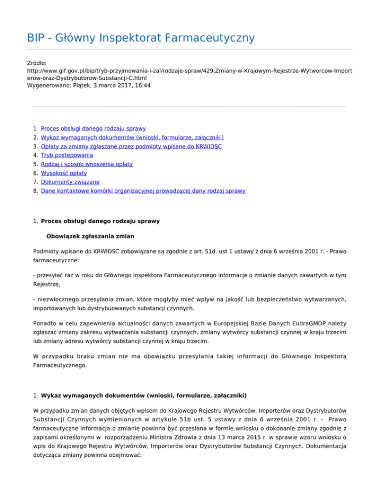 BIP - Główny Inspektorat Farmaceutyczny Źródło: http://www.gif.gov.pl/bip/tryb-przyjmowania-i-zal/rodzaje-spraw/429,Zmiany-w-Krajowym-Rejestrze-Wytworcow-Import erow-oraz-Dystrybutorow-Substancji-C.html Wygenerowano: Piątek, 3 marca 2017, 16:44 1. Proces obsługi danego rodzaju sprawy 2. Wykaz wymaganych dokumentów (wnioski, formularze, załączniki) 3. Opłaty za zmiany zgłaszane przez podmioty wpisane do KRWIDSC 4. Tryb postępowania 5. Rodzaj i sposób wnoszenia opłaty 6. Wysokość opłaty 7. Dokumenty związane 8. Dane kontaktowe komórki organizacyjnej prowadzącej dany rodzaj sprawy 1. Proces obsługi danego rodzaju sprawy Obowiązek zgłaszania zmian Podmioty wpisane do KRWIDSC zobowiązane są zgodnie z art. 51d. ust 1 ustawy z dnia 6 września 2001 r. - Prawo farmaceutyczne: - przesyłać raz w roku do Głównego Inspektora Farmaceutycznego informacje o zmianie danych zawartych w tym Rejestrze, - niezwłocznego przesyłania zmian, które mogłyby mieć wpływ na jakość lub bezpieczeństwo wytwarzanych, importowanych lub dystrybuowanych substancji czynnych. Ponadto w celu zapewnienia aktualności danych zawartych w Europejskiej Bazie Danych EudraGMDP należy zgłaszać zmiany zakresu wytwarzania substancji czynnych, zmiany wytwórcy substancji czynnej w kraju trzecim lub zmiany adresu wytwórcy substancji czynnej w kraju trzecim. W przypadku braku zmian nie ma obowiązku przesyłania takiej informacji do Głównego Inspektora Farmaceutycznego. 1. Wykaz wymaganych dokumentów (wnioski, formularze, załączniki) W przypadku zmian danych objętych wpisem do Krajowego Rejestru Wytwórców, Importerów oraz Dystrybutorów Substancji Czynnych wymienionych w artykule 51b ust. 5 ustawy z dnia 6 września 2001 r. - Prawo farmaceutyczne informacja o zmianie powinna być przesłana w formie wniosku o dokonanie zmiany zgodnie z zapisami określonymi w rozporządzeniu Ministra Zdrowia z dnia 13 marca 2015 r. w sprawie wzoru wniosku o wpis do Krajowego Rejestru Wytwórców, Importerów oraz Dystrybutorów Substancji Czynnych. Dokumentacja dotycząca zmiany powinna obejmować: ● wniosek o zmianę w KRWIDSC, ● dokumentację Główną Miejsca Prowadzenia Działalności (DGMW) w języku polskim w dwóch egzemplarzach; DGMW dołącza się w przypadku korekty danych dotyczących miejsca wytwarzania, importu lub dystrybucji substancji czynnej oraz wtedy, kiedy zgłaszana zmiana ma wpływ na treść DGM, ● dowód wpłaty za złożenie wniosku na konto Głównego Inspektoratu Farmaceutycznego w myśl art. 51c ust. 6 pkt 1 z dnia 6 września 2001 r. ustawy Prawo Farmaceutyczne. W przypadku innych zmian dokumentacja powinna obejmować: ● zgłoszenie zmiany wraz z opisem, ● DGMW wtedy, kiedy zmiana ma wpływ na treść DGMW. Ponadto, niezależnie od rodzaju zmiany, należy złożyć dla każdego złożonego pełnomocnictwa dowód wpłaty potwierdzający wniesienie opłaty skarbowej. 1. Opłaty za zmiany zgłaszane przez podmioty wpisane do KRWIDSC ● Opłaty są pobierane w przypadku zgłoszenia do Głównego Inspektora Farmaceutycznego zmian skutkujących koniecznością wprowadzenia zmian do KRWIDSC. ● Za zmiany dotyczące nazw substancji czynnych już wpisanych do rejestru oraz zmiany skutkujące tylko aktualizacją w europejskiej bazie danych EudraGMDP opłaty nie są pobierane. 1. Tryb postępowania. Po zarejestrowaniu wniosku o zmianę dokumenty sprawdzane są pod kątem formalnym i merytorycznym. W przypadku stwierdzenia braków, sformułowane zostaje wezwanie do uzupełnienia braków wraz ze wskazaniem podstawy prawnej. W przypadku nieuzupełnienia przez przedsiębiorcę braków formalnych w terminie 7 dni od dnia dostarczenia przedmiotowego wezwania wniosek pozostanie bez rozpatrzenia – zgodnie z art. 64 § 2 ustawy z dnia 14 czerwca 1960 r. - Kodeks postępowania administracyjnego (Dz. U. 2013, poz. 267). W przypadku trudności z uzupełnieniem braku we wniosku w terminie określonym w art. 64 § 2 k.p.a, strona może zwrócić się do organu z wnioskiem o zawieszenie postępowania. Zgodnie z art. 98 § 1 k.p.a. organ administracji publicznej może zawiesić postępowanie, jeżeli wystąpi o to strona, na której żądanie postępowanie zostało wszczęte, a nie sprzeciwiają się temu inne strony oraz nie zagraża to interesowi społecznemu. w przypadku zawieszenia postępowania wnioskodawca po skompletowaniu brakującej dokumentacji, jest zobowiązany do jak najszybszego złożenia jej w Urzędzie wraz z pisemnym wnioskiem o podjęcie postępowania w sprawie zmiany wpisu w KRWIDSC. W przypadku braku zastrzeżeń do przysłanych dokumentów podejmowana jest decyzja o przeprowadzeniu inspekcji przed zmianą wpisu w KRWIDSC. W przypadku konieczności przeprowadzenia inspekcji przed zmianą w KRWIDSC, zmiana ta jest możliwa po uzyskaniu pozytywnej opinii dotyczącej wnioskowanej zmiany w raporcie z przeprowadzonej inspekcji. Jeżeli nie ma konieczności przeprowadzenia inspekcji przed zmianą wpisu w KRWIDSC Główny Inspektor Farmaceutyczny wydaje zaświadczenie o wpisie do KRWIDSC. Jeżeli jest konieczność przeprowadzenia inspekcji przed zmianą w KRWIDSC wówczas na podstawie wyniku inspekcji Główny Inspektorat Farmaceutyczny: ● wydaje zaświadczenie o wpisie do KRWIDSC w przypadku inspekcji zakończonej wynikiem pozytywnym lub ● wydaje postanowienie odmawiające dokonania wpisu do KRWIDSC w przypadku inspekcji zakończone wynikiem negatywnym. 1. Rodzaj i sposób wnoszenia opłaty ● Opłatę za wniosek o zmianę wpisu w KRWIDSC należy wnosić na rachunek bieżący dochodów budżetowych Głównego Inspektoratu Farmaceutycznego - NBP o/o w Warszawie nr: 30 1010 1010 0056 2722 3100 0000. ● Opłata za pełnomocnictwo – opłata skarbowa wniesiona w kasie Urzędu Dzielnicy Śródmieście m.st. Warszawa, ul. Nowogrodzka 43, 00-691 Warszawa lub przelewem na konto bankowe numer 60 1030 1508 0000 0005 5001 0038. 1. Wysokość opłaty ● Zgodnie z art. 51 c ust