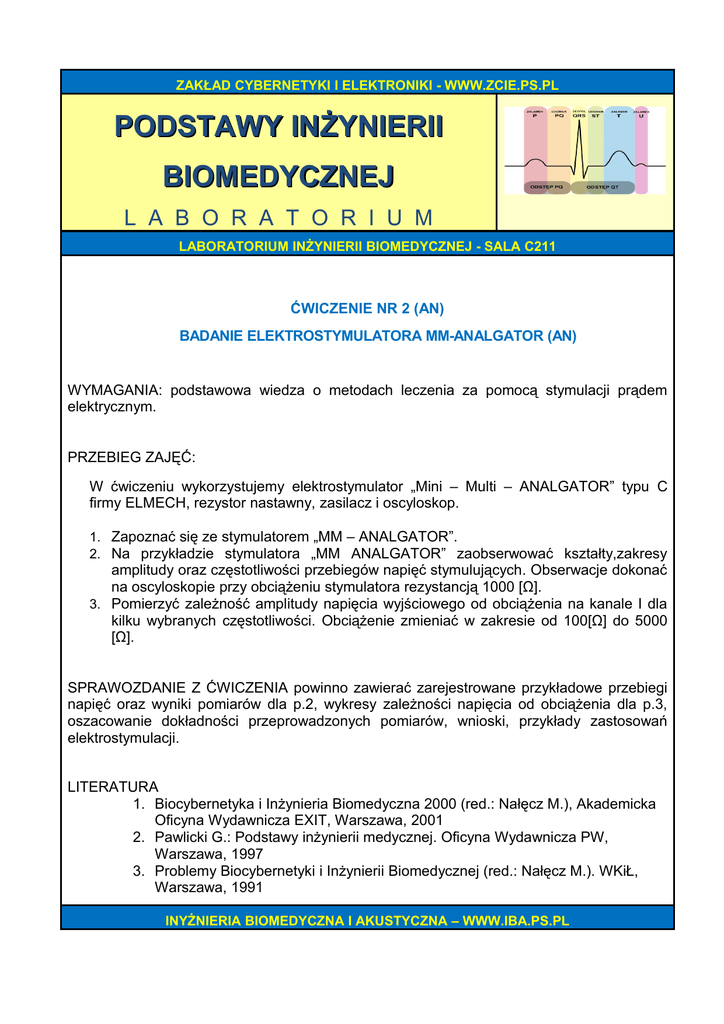 ZAKŁAD CYBERNETYKI I ELEKTRONIKI - WWW.ZCIE.PS.PL PODSTAWY INŻYNIERII BIOMEDYCZNEJ L A B O R A T O R I U M LABORATORIUM INŻYNIERII BIOMEDYCZNEJ - SALA C211 ĆWICZENIE NR 2 (AN) BADANIE ELEKTROSTYMULATORA MM-ANALGATOR (AN) WYMAGANIA: podstawowa wiedza o metodach leczenia za pomocą stymulacji prądem elektrycznym. PRZEBIEG ZAJĘĆ: W ćwiczeniu wykorzystujemy elektrostymulator „Mini – Multi – ANALGATOR” typu C firmy ELMECH, rezystor nastawny, zasilacz i oscyloskop. 1. Zapoznać się ze stymulatorem „MM – ANALGATOR”. 2. Na przykładzie stymulatora „MM ANALGATOR” zaobserwować kształty,zakresy amplitudy oraz częstotliwości przebiegów napięć stymulujących. Obserwacje dokonać na oscyloskopie przy obciążeniu stymulatora rezystancją 1000 [Ω]. 3. Pomierzyć zależność amplitudy napięcia wyjściowego od obciążenia na kanale I dla kilku wybranych częstotliwości. Obciążenie zmieniać w zakresie od 100[Ω] do 5000 [Ω]. SPRAWOZDANIE Z ĆWICZENIA powinno zawierać zarejestrowane przykładowe przebiegi napięć oraz wyniki pomiarów dla p.2, wykresy zależności napięcia od obciążenia dla p.3, oszacowanie dokładności przeprowadzonych pomiarów, wnioski, przykłady zastosowań elektrostymulacji. LITERATURA 1. Biocybernetyka i Inżynieria Biomedyczna 2000 (red.: Nałęcz M.), Akademicka Oficyna Wydawnicza EXIT, Warszawa, 2001 2. Pawlicki G.: Podstawy inżynierii medycznej. Oficyna Wydawnicza PW, Warszawa, 1997 3. Problemy Biocybernetyki i Inżynierii Biomedycznej (red.: Nałęcz M.). WKiŁ, Warszawa, 1991 INYŻNIERIA BIOMEDYCZNA I AKUSTYCZNA – WWW.IBA.PS.PL