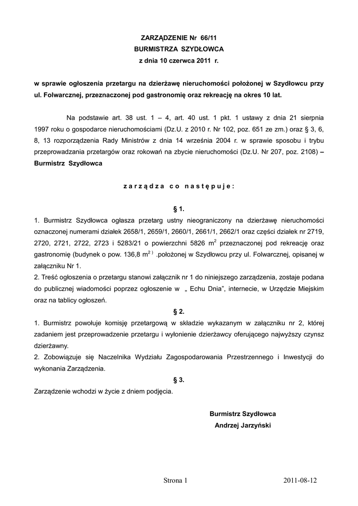 ZARZĄDZENIE Nr 66/11 BURMISTRZA SZYDŁOWCA z dnia 10 czerwca 2011 r. w sprawie ogłoszenia przetargu na dzierżawę nieruchomości położonej w Szydłowcu przy ul. Folwarcznej, przeznaczonej pod gastronomię oraz rekreację na okres 10 lat. Na podstawie art. 38 ust. 1 – 4, art. 40 ust. 1 pkt. 1 ustawy z dnia 21 sierpnia 1997 roku o gospodarce nieruchomościami (Dz.U. z 2010 r. Nr 102, poz. 651 ze zm.) oraz § 3, 6, 8, 13 rozporządzenia Rady Ministrów z dnia 14 września 2004 r. w sprawie sposobu i trybu przeprowadzania przetargów oraz rokowań na zbycie nieruchomości (Dz.U. Nr 207, poz. 2108) – Burmistrz Szydłowca zarządza co następuje: § 1. 1. Burmistrz Szydłowca ogłasza przetarg ustny nieograniczony na dzierżawę nieruchomości oznaczonej numerami działek 2658/1, 2659/1, 2660/1, 2661/1, 2662/1 oraz części działek nr 2719, 2720, 2721, 2722, 2723 i 5283/21 o powierzchni 5826 m2 przeznaczonej pod rekreację oraz gastronomię (budynek o pow. 136,8 m2 ) .położonej w Szydłowcu przy ul. Folwarcznej, opisanej w załączniku Nr 1. 2. Treść ogłoszenia o przetargu stanowi załącznik nr 1 do niniejszego zarządzenia, zostaje podana do publicznej wiadomości poprzez ogłoszenie w „ Echu Dnia”, internecie, w Urzędzie Miejskim oraz na tablicy ogłoszeń. § 2. 1. Burmistrz powołuje komisję przetargową w składzie wykazanym w załączniku nr 2, której zadaniem jest przeprowadzenie przetargu i wyłonienie dzierżawcy oferującego najwyższy czynsz dzierżawny. 2. Zobowiązuje się Naczelnika Wydziału Zagospodarowania Przestrzennego i Inwestycji do wykonania Zarządzenia. § 3. Zarządzenie wchodzi w życie z dniem podjęcia. Burmistrz Szydłowca Andrzej Jarzyński Strona 1 2011-08-12 Załącznik Nr 1 do Zarządzenia Nr 66 /2011 Burmistrza Szydłowca z dnia 10 czerwca 2011 r. BURMISTRZ SZYDŁOWCA OGŁASZA PRZETARG USTNY NIEOGRANICZONY na dzierżawę nieruchomości, położonej w Szydłowcu przy ul. Folwarcznej, przeznaczonej pod gastronomię oraz rekreację na okres 3 lat. Do dzierżawy przeznacza się działki : - nr 2658/1, 2659/1, 2660/1, 2661/1, 2662/1 oraz części działek nr 2719, 2720, 2721, 2722, 2723 i 5283/21 zaznaczone na niżej zamieszczonej mapie o powierzchni 5826 m2 oraz część budynku parterowego o pow 136,8 m2 – cena wywoławcza czynszu dzierżawnego – 9 600,00 zł. +należny podatek VAT rocznie. Przetarg odbędzie w Urzędzie Miejskim w Szydłowcu przy ul. Kilińskiego 2, w dniu 11 lipca 2011 roku o godz. 1100. Wadium w wysokości 1000 zł, należy wpłacić na konto Urzędu Miejskiego w Szydłowcu prowadzone przez Południowo - Mazowiecki Bank Spółdzielczy w Jedlińsku Oddział w Szydłowcu Nr 53 9132 0001 0134 0904 2000 0020 lub w kasie tut. Urzędu w Ratuszu, pokój nr 1 do dnia 8 lipca 2011 roku do godz. 1300. Warunkiem wzięcia udziału w przetargu jest wpłacenie wadium w określonym terminie i wysokości; jako termin wpłaty na konto liczy się data i godzina zaksięgowania środków na koncie Urzędu a nie data i godzina dokonania przelewu. Wadium wpłacone przez uczestnika który przetarg wygra zalicza się na poczet czynszu dzierżawnego, pozostałe wadia będą zwrócone. Dzierżawca będzie zobowiązany do utrzymania w porządku i czystości na dzierżawionym terenie. Dzierżawca dokona niezbędnych remontów i uzupełnień w dzierżawionym budynku według zaakceptowanego przez wydzierżawiającego kosztorysu, a nakłady inwestycyjne po ich udokumentowaniu, będą rozliczone w czynszu. Nie zwalnia to jednak dzierżawcy od uiszczania podatku VAT.. Wylicytowana kwota dzierżawy będzie rewaloryzowana każdego roku o wskaźnik inflacji dla towarów i usług. Dzierżawca będzie zobowiązany do 1. Udostępnienia terenów dla wydzierżawiającego w przypadku konieczności wykonywania prac związanych z utrzymaniem technicznym zalewu. 2. W okresie letnim prowadzenie miejsca przeznaczonego do kąpieli. Umowa dzierżawy zostanie sporządzona w terminie do 21 dni od dnia przetargu. Jeżeli osoba ustalona dzierżawcą gruntu nie stawi się bez usprawiedliwienia do podpisania umowy wpłacone wadium ulega przepadkowi. Dzierżawca będzie mógł rozwiązać umowę po uprzednim 3 miesięcznym wypowiedzeniu dokonanym na koniec roku kalendarzowego. Zastrzega się prawo unieważnienia przetargu z uzasadnionej przyczyny. Informacji szczegółowych udziela Wydział Zagospodarowania Przestrzennego i Inwestycji ul. Kilińskiego 2, tel. 617-86-46. Strona 2 2011-08-12 Załącznik Nr 2 do Zarządzenia Nr 66 /2011 Burmistrza Szydłowca z dnia10 czerwca 2011 r. Skład Komisji Przetargowej do przeprowadzenia w dniu 11 lipca 2011 roku ustnego przetargu nieograniczonego na dzierżawę nieruchomości zabudowanej oznaczonej numerami działek 2658/1, 2659/1, 2660/1, 2661/1, 2662/1 oraz części działek nr 2719, 2720, 2721, 2722, 2723 i 5283/21 o powierzchni 5826 m2 przeznaczonej pod gastronomię oraz rekreację a położonej w Szydłowcu przy ul. Folwarcznej oraz część budynku parterowego o pow 136,8 m2 1. Przewodniczący komisji Kazimierz Piotrowski 2. Członek komisji Agnieszka Karpeta 3. Członek komisji Lucjan Sodel 4. Członek komisji Wiesław Jarzabek Strona 3 2011-08-12