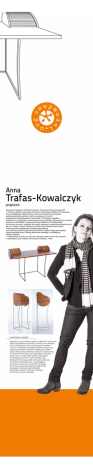 Anna Trafas-Kowalczyk projektant Absolwentka Wydziału Architektury Wnętrz i Wzornictwa Przemysłowego ASP w Poznaniu. Dyplom zrealizowała w Pracowni Projektowania Mebla prof. Aleksandra Kuczmy (1995), gdzie odbyła również roczny staż asystencki. Po dyplomie zadebiutowała jako projektant mebli na wystawie „Forma 95”. Projektowała dla Wielkopolskich Fabryk Mebli i FM Twaróg w Rogoźnie. Współpraca z producentami zaowocowała dwoma projektami wdrożonymi do produkcjii: systemem mebli MODUS i odznaczoną Złotym Medalem MTP kolekcją MAG. Jest autorką koncepcji i projektów sieci galerii meblowych, systemów wystawienniczych dla firm, wystaw i wnętrz. Wspólnie z Justyną Stosik prowadzi Studio Tkaniny w Poznaniu, które współpracuje z fundacją nowymodel.org. Lubi symetrię, powtórzenia, geometryczne kształty. Za godne uwagi uważa projekty łączące dyscyplinę formy z fantazją, która łamie stereotypy i nie poddaje się modnym kanonom. – Projektowanie to luksus, na który tak naprawdę rzadko można sobie pozwolić. A najciekawsze są te projekty, które dopiero powstają – mówi. SEKRETARZYK I BIURKO Nagrodzony na poznańskiej wystawie „FORMA 95” sekretarzyk został zaprojektowany na konkurs. W ślad za nim powstało biurko. Przeznaczone są do przechowywania drobnych i cennych przedmiotów, szybkiego załatwiania spraw. Oba sprzęty są niewielkie, niepozorne. Składają się z dwóch części: lekkiej, prostej metalowej podstawy i zawieszonego na niej kufra sekretarzyka oraz wspartego na niej blatu biurka. Forma i funkcja mebli zostały zredukowane do niezbędnego minimum. Sedno projektu i jego atrakcyjność stanowią sposób umocowania żaluzjowo zamykanych pojemników oraz ich powściągliwy, ale zarazem przewrotny, obły kształt. Skrywają one chimeryczną cechę: okrągłe dna pojemników zachęcają do niefrasobliwego odkładania przedmiotów, półeczki natomiast nakłaniają do trzymania rzeczy w porządku.