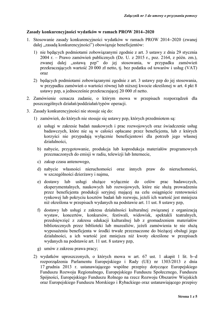 Załącznik nr 3 do umowy o przyznaniu pomocy Zasady konkurencyjności wydatków w ramach PROW 20142020 1. Stosowanie zasady konkurencyjności wydatków w ramach PROW 20142020 (zwanej dalej „zasadą konkurencyjności”) obowiązuje beneficjentów: 1) nie będących podmiotami zobowiązanymi zgodnie z art. 3 ustawy z dnia 29 stycznia 2004 r. – Prawo zamówień publicznych (Dz. U. z 2015 r., poz. 2164, z późn. zm.), zwanej dalej „ustawą pzp” do jej stosowania, w przypadku zamówień przekraczających wartość 20 000 zł netto, tj. bez podatku od towarów i usług (VAT) oraz 2) będących podmiotami zobowiązanymi zgodnie z art. 3 ustawy pzp do jej stosowania, w przypadku zamówień o wartości równej lub niższej kwocie określonej w art. 4 pkt 8 ustawy pzp, a jednocześnie przekraczającej 20 000 zł netto. 2. Zamówienie oznacza zadanie, o którym mowa w przepisach rozporządzeń dla poszczególnych działań/poddziałań/typów operacji. 3. Zasady konkurencyjności nie stosuje się do: 1) zamówień, do których nie stosuje się ustawy pzp, których przedmiotem są: a) usługi w zakresie badań naukowych i prac rozwojowych oraz świadczenie usług badawczych, które nie są w całości opłacane przez beneficjenta, lub z których korzyści nie przypadają wyłącznie beneficjentowi dla potrzeb jego własnej działalności, b) nabycie, przygotowanie, produkcja lub koprodukcja materiałów programowych przeznaczonych do emisji w radiu, telewizji lub Internecie, c) zakup czasu antenowego, d) nabycie własności nieruchomości w szczególności dzierżawy i najmu, oraz innych praw do nieruchomości, e) dostawy lub usługi służące wyłącznie do celów prac badawczych, eksperymentalnych, naukowych lub rozwojowych, które nie służą prowadzeniu przez beneficjenta produkcji seryjnej mającej na celu osiągnięcie rentowności rynkowej lub pokryciu kosztów badań lub rozwoju, jeżeli ich wartość jest mniejsza niż określona w przepisach wydanych na podstawie art. 11 ust. 8 ustawy pzp, f) dostawy lub usługi z zakresu działalności kulturalnej związanej z organizacją wystaw, koncertów, konkursów, festiwali, widowisk, spektakli teatralnych, przedsięwzięć z zakresu edukacji kulturalnej lub z gromadzeniem materiałów bibliotecznych przez biblioteki lub muzealiów, jeżeli zamówienia te nie służą wyposażeniu beneficjenta w środki trwałe przeznaczone do bieżącej obsługi jego działalności, a ich wartość jest mniejsza niż kwoty określone w przepisach wydanych na podstawie art. 11 ust. 8 ustawy pzp, g) umów z zakresu prawa pracy; 2) wydatków uproszczonych, o których mowa w art. 67 ust. 1 akapit 1 lit. bd rozporządzenia Parlamentu Europejskiego i Rady (UE) nr 1303/2013 z dnia 17 grudnia 2013 r. ustanawiającego wspólne przepisy dotyczące Europejskiego Funduszu Rozwoju Regionalnego, Europejskiego Funduszu Społecznego, Funduszu Spójności, Europejskiego Funduszu Rolnego na rzecz Rozwoju Obszarów Wiejskich oraz Europejskiego Funduszu Morskiego i Rybackiego oraz ustanawiającego przepisy Strona 1 z 5 Załącznik nr 3 do umowy o przyznaniu pomocy ogólne dotyczące Europejskiego Funduszu Rozwoju Regionalnego, Europejskiego Funduszu Społecznego, Funduszu Spójności i Europejskiego Funduszu Morskiego i Rybackiego oraz uchylającego rozporządzenie Rady (WE) nr 1083/2006 (Dz. Urz. UE L 347 z 20.12.2013, str. 320, z późn. zm.); 3) wydatków ponoszonych w ramach tzw. projektów grantowych, o których mowa w przepisach o rozwoju lokalnym z udziałem lokalnej społeczności; 4. Wartość zamówienia ustala się z należytą starannością, biorąc pod uwagę łączne spełnienie następujących kryteriów: a) sumowaniu podlegają usługi, dostawy i roboty budowlane tego samego rodzaju i o tym samym przeznaczeniu; b) możliwe jest udzielenie zamówienia w tym samym czasie; c) możliwe jest wykonanie zamówienia przez jednego wykonawcę dostaw, usług lub robót budowlanych (zwanego dalej „wykonawcą”). 5. W celu spełnienia zasady konkurencyjności należy: 1) upublicznić zapytanie ofertowe zgodnie z warunkami, o których mowa w ust. 8, przy czym zapytanie ofertowe zawiera co najmniej: a) opis przedmiotu zamówienia, – jednoznaczny i wyczerpujący, za pomocą dostatecznie dokładnych i zrozumiałych określeń, uwzględniający wszystkie wymagania i okoliczności mogące mieć wpływ na sporządzenie oferty, – który nie powinien odnosić się do określonego wyrobu lub źródła, szczególnych sposobów postępowania lub znaków towarowych, patentów, rodzajów lub specyficznego pochodzenia, chyba że takie odniesienie jest uzasadnione przedmiotem zamówienia i został określony zakres równoważności, b) warunki udziału w postępowaniu, c) kryteria oceny oferty oraz informację o wagach punktowych lub procentowych przypisanych do poszczególnych kryteriów oceny oferty, d) opis sposobu przyznawania punktacji za spełnienie danego kryterium oceny oferty, e) termin składania ofert, przy czym termin na złożenie oferty powinien wynosić nie mniej niż 7 dni kalendarzowych w przypadku dostaw i usług, a 14 dni kalendarzowych w przypadku robót budowlanych od dnia upublicznienia zapytania ofertowego, f) warunki wykluczenia, o którym mowa w ust. 6, g) termin realizacji zamówienia; 2) wybrać najkorzystniejszą spośród wszystkich złożonych ofert1 w oparciu o ustalone w zapytaniu ofertowym kryteria oceny. 6. Zamówienia udzielane przez beneficjenta nie mogą być udzielane podmiotom powiązanym z nim osobowo lub kapitałowo. Przez powiązania kapitałowe lub osobowe rozumie się wzajemne powiązania między beneficjentem lub osobami upoważnionymi do zaciągania zobowiązań w imieniu beneficjenta lub osobami wykonującymi w imieniu 1 W przypadku gdy beneficjent dopuszcza składanie ofert częściowych postępowanie może zakończyć się wyborem kilku wykonawców. Strona 2 z 5 Załącznik nr 3 do umowy o przyznaniu pomocy beneficjenta czynno