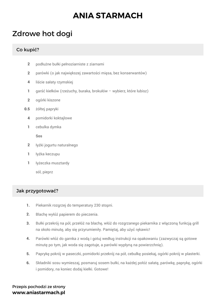 ANIA STARMACH Zdrowe hot dogi Co kupić? 2 podłużne bułki pełnoziarniste z ziarnami 2 parówki (o jak największej zawartości mięsa, bez konserwantów) 4 liście sałaty rzymskiej 1 garść kiełków (rzeżuchy, buraka, brokułów – wybierz, które lubisz) 2 ogórki kiszone 0.5 żółtej papryki 4 pomidorki koktajlowe 1 cebulka dymka Sos 2 łyżki jogurtu naturalnego 1 łyżka keczupu 1 łyżeczka musztardy sól, pieprz Jak przygotować? 1. Piekarnik rozgrzej do temperatury 230 stopni. 2. Blachę wyłóż papierem do pieczenia. 3. Bułki przekrój na pół, przełóż na blachę, włóż do rozgrzanego piekarnika z włączoną funkcją grill na około minutę, aby się przyrumieniły. Pamiętaj, aby użyć rękawic! 4. Parówki włóż do garnka z wodą i gotuj według instrukcji na opakowaniu (zazwyczaj są gotowe minutę po tym, jak woda się zagotuje, a parówki wypłyną na powierzchnię). 5. Paprykę pokrój w paseczki, pomidorki przekrój na pół, cebulkę posiekaj, ogórki pokrój w plasterki. 6. Składniki sosu wymieszaj, posmaruj sosem bułki, na każdej połóż sałatę, parówkę, paprykę, ogórki i pomidory, na koniec dodaj kiełki. Gotowe! Przepis pochodzi ze strony www.aniastarmach.pl