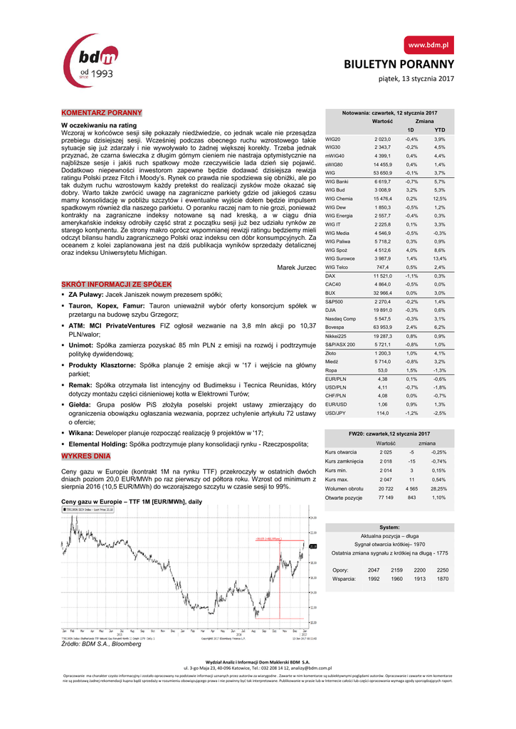 BIULETYN PORANNY piątek, 13 stycznia 2017 KOMENTARZ PORANNY Notowania: czwartek, 12 stycznia 2017 W oczekiwaniu na rating Wczoraj w końcówce sesji siłę pokazały niedźwiedzie, co jednak wcale nie przesądza przebiegu dzisiejszej sesji. Wcześniej podczas obecnego ruchu wzrostowego takie sytuacje się już zdarzały i nie wywoływało to żadnej większej korekty. Trzeba jednak przyznać, że czarna świeczka z długim górnym cieniem nie nastraja optymistycznie na najbliższe sesje i jakiś ruch spatkowy może rzeczywiście lada dzień się pojawić. Dodatkowo niepewności inwestorom zapewne będzie dodawać dzisiejsza rewizja ratingu Polski przez Fitch i Moody’s. Rynek co prawda nie spodziewa się obniżki, ale po tak dużym ruchu wzrostowym każdy pretekst do realizacji zysków może okazać się dobry. Warto także zwrócić uwagę na zagraniczne parkiety gdzie od jakiegoś czasu mamy konsolidację w pobliżu szczytów i ewentualne wyjście dołem będzie impulsem spadkowym również dla naszego parkietu. O poranku raczej nam to nie grozi, ponieważ kontrakty na zagraniczne indeksy notowane są nad kreską, a w ciągu dnia amerykańskie indeksy odrobiły część strat z początku sesji już bez udziału rynków ze starego kontynentu. Ze strony makro oprócz wspomnianej rewizji ratingu będziemy mieli odczyt bilansu handlu zagranicznego Polski oraz indeksu cen dóbr konsumpcyjnych. Za oceanem z kolei zaplanowana jest na dziś publikacja wyników sprzedaży detalicznej oraz indeksu Uniwersytetu Michigan. Marek Jurzec Wartość Zmiana 1D YTD WIG20 2 023,0 -0,4% 3,9% WIG30 2 343,7 -0,2% 4,5% mWIG40 4 399,1 0,4% 4,4% sWIG80 14 455,9 0,4% 1,4% WIG 53 650,9 -0,1% 3,7% WIG Banki 6 619,7 -0,7% 5,7% WIG Bud 3 008,9 3,2% 5,3% WIG Chemia 15 476,4 0,2% 12,5% WIG Dew 1 850,3 -0,5% 1,2% WIG Energia 2 557,7 -0,4% 0,3% WIG IT 2 225,8 0,1% 3,3% WIG Media 4 546,9 -0,5% -0,3% WIG Paliwa 5 718,2 0,3% 0,9% WIG Spoż 4 512,6 4,0% 8,6% WIG Surowce 3 987,9 1,4% 13,4% 747,4 0,5% 2,4% DAX 11 521,0 -1,1% 0,3% SKRÓT INFORMACJI ZE SPÓŁEK CAC40 4 864,0 -0,5% 0,0% ZA Puławy: Jacek Janiszek nowym prezesem spółki; BUX 32 966,4 0,0% 3,0% Tauron, Kopex, Famur: Tauron unieważnił wybór oferty konsorcjum spółek w przetargu na budowę szybu Grzegorz; S&P500 2 270,4 -0,2% 1,4% DJIA 19 891,0 -0,3% 0,6% Nasdaq Comp 5 547,5 -0,3% 3,1% Bovespa 63 953,9 2,4% 6,2% Nikkei225 19 287,3 0,8% 0,9% S&P/ASX 200 5 721,1 -0,8% 1,0% Złoto 1 200,3 1,0% 4,1% Miedź 5 714,0 -0,8% 3,2% Ropa 53,0 1,5% -1,3% EUR/PLN 4,38 0,1% -0,6% USD/PLN 4,11 -0,7% -1,8% CHF/PLN 4,08 0,0% -0,7% EUR/USD 1,06 0,9% 1,3% USD/JPY 114,0 -1,2% -2,5% ATM: MCI PrivateVentures FIZ ogłosił wezwanie na 3,8 mln akcji po 10,37 PLN/walor; Unimot: Spółka zamierza pozyskać 85 mln PLN z emisji na rozwój i podtrzymuje politykę dywidendową; Produkty Klasztorne: Spółka planuje 2 emisje akcji w '17 i wejście na główny parkiet; Remak: Spółka otrzymała list intencyjny od Budimeksu i Tecnica Reunidas, który dotyczy montażu części ciśnieniowej kotła w Elektrowni Turów; Giełda: Grupa posłów PiS złożyła poselski projekt ustawy zmierzający do ograniczenia obowiązku ogłaszania wezwania, poprzez uchylenie artykułu 72 ustawy o ofercie; WIG Telco Wikana: Deweloper planuje rozpocząć realizację 9 projektów w '17; FW20: czwartek,12 stycznia 2017 Wartość Elemental Holding: Spółka podtrzymuje plany konsolidacji rynku - Rzeczpospolita; MangataDNIA Holding: Spółka ogłosi strategię na lata 2017-20 najwcześniej pod WYKRES koniec 1Q'17 - Parkiet Ceny gazu w Europie (kontrakt 1M na rynku TTF) przekroczyły w ostatnich dwóch dniach poziom 20,0 EUR/MWh po raz pierwszy od półtora roku. Wzrost od minimum z sierpnia 2016 (10,5 EUR/MWh) do wczorajszego szczytu w czasie sesji to 99%. Ceny gazu w Europie – TTF 1M [EUR/MWh], daily zmiana Kurs otwarcia 2 025 -5 -0,25% Kurs zamknięcia 2 018 -15 -0,74% Kurs min. 2 014 3 0,15% Kurs max. 2 047 11 0,54% Wolumen obrotu 20 722 4 565 28,25% Otwarte pozycje 77 149 843 1,10% System: Aktualna pozycja – długa Sygnał otwarcia krótkiej– 1970 Ostatnia zmiana sygnału z krótkiej na długą - 1775 Opory: 2047 2159 2200 2250 Wsparcia: 1992 1960 1913 1870 Źródło: BDM S.A., Bloomberg Wydział Analiz i Informacji Dom Maklerski BDM S.A. ul. 3-go Maja 23, 40-096 Katowice, Tel.: 032 208 14 12, [email protected] Opracowanie ma charakter czysto informacyjny i zostało opracowany na podstawie informacji uznanych przez autorów za wiarygodne . Zawarte w nim komentarze są subiektywnymi poglądami autorów. Opracowanie i zawarte w nim komentarze nie są podstawą żadnej rekomendacji kupna bądź sprzedaży w rozumieniu obowiązującego prawa i nie powinny być tak interpretowane. Publikowanie w prasie lub w Internecie całości lub części opracowania wymaga zgody sporządzających raport. BIULETYN PORANNY piątek, 13 stycznia 2017 GPW – PODSUMOWANIE Indeksy GPW FW20 (2,025.00, 2,047.00, 2,014.00, 2,018.00, -15.0000) 2050 2000 1950 Open Low High Close WIG20 2 029,7 2 016,0 2 044,6 2 023,0 -0,4% 1 009 WIG30 2 345,7 2 335,1 2 363,9 2 343,7 -0,2% 1 152 MWIG40 4 392,0 14 392,6 14 461,1 4 399,1 0,4% 195 SWIG80 14 394,8 4 381,2 4 409,7 14 455,9 0,4% 80 WIG-PL 54 560,6 54 482,1 54 718,0 54 482,1 -0,2% 1 273 WIG 53 690,5 53 493,7 53 989,5 53 650,9 -0,1% 1 301 WIG20 Cena Mkt Cap Alior 1800 1750 1700 11 18 25 1 8 August 16 22 29 5 12 19 September 26 3 10 October 17 24 31 7 14 21 November 28 5 12 19 December 27 2 9 2017 16 23 WIG20 (2,029.68, 2,044.59, 2,015.98, 2,022.95, -7.69006) 2050 2000 1950 1900 1850 1800 1750 1700 11 18 25 1 8 August 16 22 29 5 12 19 September 26 3 10 October 17 24 31 7 14 November 21 28 5 12 19 December 27 2 9 2017 16 23 KOMENTARZ POPOŁUDNIOWY Mocna budowlanka Czwartkowa sesja miała pewne podobieństwa do notowań ze środy. Ponownie rynek napędzał KGHM (+2%, 340 mln obrotów), ponownie łączne obroty akcjami WIG20 były wysokie (1 mld zł) i znów mimo większej zmienności w trakcie dn