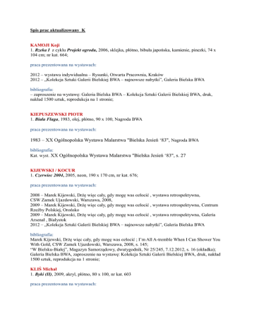 Spis prac aktualizowany K KAMOJI Koji 1. Rzeka I z cyklu Projekt ogrodu, 2006, sklejka, płótno, bibuła japońska, kamienie, pinezki, 74 x 104 cm; nr kat. 664; praca prezentowana na wystawach: 2012 – wystawa indywidualna – Rysunki, Otwarta Pracownia, Kraków 2012 – „Kolekcja Sztuki Galerii Bielskiej BWA – najnowsze nabytki”, Galeria Bielska BWA bibliografia: – zaproszenie na wystawę: Galeria Bielska BWA – Kolekcja Sztuki Galerii Bielskiej BWA, druk, nakład 1500 sztuk, reprodukcja na 1 stronie; KIEPUSZEWSKI PIOTR 1. Biała Flaga, 1983, olej, płótno, 90 x 100, Nagroda BWA praca prezentowana na wystawach: 1983 – XX Ogólnopolska Wystawa Malarstwa "Bielska Jesień ‘83", Nagroda BWA bibliografia: Kat. wyst. XX Ogólnopolska Wystawa Malarstwa "Bielska Jesień ‘83", s. 27 KIJEWSKI / KOCUR 1. Czerwiec 2004, 2005, neon, 190 x 170 cm, nr kat. 676; praca prezentowana na wystawach: 2008 – Marek Kijewski, Drżę więc cały, gdy mogę was ozłocić , wystawa retrospektywna, CSW Zamek Ujazdowski, Warszawa, 2008, 2009 – Marek Kijewski, Drżę więc cały, gdy mogę was ozłocić , wystawa retrospektywna, Centrum Rzeźby Polskiej, Orońsko 2009 – Marek Kijewski, Drżę więc cały, gdy mogę was ozłocić , wystawa retrospektywna, Galeria Arsenał , Białystok 2012 – „Kolekcja Sztuki Galerii Bielskiej BWA – najnowsze nabytki”, Galeria Bielska BWA bibliografia: Marek Kijewski, Drżę więc cały, gdy mogę was ozłocić ; I’m All A-tremble When I Can Shower You With Gold, CSW Zamek Ujazdowski, Warszawa, 2008, s. 145; “W Bielsku-Białej”, Magazyn Samorządowy, dwutygodnik, Nr 25/245, 7.12.2012, s. 16 (okładka); Galeria Bielska BWA, zaproszenie na wystawę: Kolekcja Sztuki Galerii Bielskiej BWA, druk, nakład 1500 sztuk, reprodukcja na 1 stronie; KLIŚ Michał 1. Byki (II), 2009, akryl, płótno, 80 x 100, nr kat. 603 praca prezentowana na wystawach: 2009 – „Byki”, wystawa indywidualna, Galeria Sztuki Współczesnej Oranżeria, PAN, Jabłonna 2009 – „Byki”, wystawa indywidualna, Galeria Bielska BWA, Bielsko-Biała 2009 – „Kleines Wien zur Gast in Wien / Mały Wiedeń z Wizytą w Wiedniu”, Galeria Time, Wiedeń, Austria; reprod.: kat. wyst., ss. 10, 24 2009 – „Byki”, wystawa indywidualna, Galeria Marchołt, Katowice reprod.: „Relacje–Interpretacje”, nr 3/2009, s. 2 i wewn. str. okładki; „Sztuka.pl”, portal internetowy [dostęp 14.02.2011] bibliografia: album Kolekcja Sztuki Galerii Bielskiej BWA, Galeria Bielska BWA, Bielsko-Biała 2011, s. 67, 218 Pozostałe prace artysty w zbiorach Galerii Bielskiej BWA 2. Byki (I), 2009, akryl, płótno, 80 x 100, nr kat. 602 3. Smuga, 1978, olej, płótno, 60 x 80, nr kat. 158 bibliografia: album Kolekcja Sztuki Galerii Bielskiej BWA, Galeria Bielska BWA, Bielsko-Biała 2011, s. 66, 4. Kompozycja I, 1978, olej, płótno, 54 x 73, nr kat. 27 5. Pejzaż, 1985/1986, olej, płótno, 80 x 100, nr kat. 102; sygn. p.d.: M. Kliś 85/86 bibliografia: album Kolekcja Sztuki Galerii Bielskiej BWA, Galeria Bielska BWA, Bielsko-Biała 2011, s. 66, 6. Pejzaż górski (burzowy), 1977, olej, płótno, 80 x 100, nr kat. 107 7. Oczekiwanie I, 1974, serigrafia, papier, 46 x 59, nr kat. 212 8. Oczekiwanie II, 1974, serigrafia, papier, 46 x 59, nr kat. 213 9. Wspomnienie IV, 1974, serigrafia, papier, 46 x 59, nr kat. 214 10. Wspomnienie, którego nie było, 1974, serigrafia, papier, 46 x 59, nr kat. 215 11. Wspomnienie I, 1974, serigrafia, papier, 46 x 59, nr kat. 216 12. Misterium, tryptyk, 2005, olej, płótno, 80 x 100, nr kat. 380 KMITA Katarzyna 1. Bajka, 2012, 100 x 100 cm, papier, praca w technice wycinanki; nr kat. 666; praca prezentowana na wystawach: 2011/2012 – Must have it, Galeria Awangarda BWA, Wrocław 2012 – Katarzyna Kmita – Must have it, Galeria Bielska BWA 2012 – „Kolekcja Sztuki Galerii Bielskiej BWA – najnowsze nabytki”, Galeria Bielska BWA bibiografia: “W Bielsku-Białej”, Magazyn Samorządowy, dwutygodnik, Nr 25/245, 7.12.2012, s. 16 (okładka) Galeria Bielska BWA, zaproszenie na wystawę: Kolekcja Sztuki Galerii Bielskiej BWA, druk, nakład 1500 sztuk, reprodukcja na 1 stronie; KOKORYN Krzysztof 1. Dzik Ojciec, 2008, olej, płótno, 100 x 140, nr kat. 395 Boar Father, oil, canvas praca prezentowana na wystawach: 2009 – „Dzik”, wystawa indywidualna, Galeria Bielska BWA, Bielsko-Biała 2009 – „Neskrotný sen lesnej noci” (Nieokiełznany sen nocy leśnej), wystawa indywidualna, Liptovska Galeria Petra Michala Bohúňa, Liptovski Mikulaš, Słowacja 2010 – „50 obrazów”, Galeria Bielska BWA, Bielsko-Biała bibliografia: książka: Lokomotywa. Wpływ kultury na rozwój lokalny, Galeria Bielska BWA, 2011, repr. s. 100; album Kolekcja Sztuki Galerii Bielskiej BWA, Galeria Bielska BWA, Bielsko-Biała 2011, s. 68, 217 Pozostałe prace artysty w zbiorach Galerii Bielskiej BWA 2. Dziczek Brunatny, 50 x 65, nr kat. 396 3. Dziczek Szary, 50 x 65, nr kat. 397 4. Dziczek z różowym nosem, 50 x 65, nr kat. 398 5. Dziczek Uśmiechnięty, 50 x 65, nr kat. 399 prace prezentowane na wystawach: 2009 – „Dzik”, wystawa indywidualna, Galeria Bielska BWA, Bielsko-Biała 2009 – „Neskrotný sen lesnej noci” (Nieokiełznany sen nocy leśnej), wystawa indywidualna, Liptovska Galeria Petra Michala Bohúňa, Liptovski Mikulaš, Słowacja bibliografia: album Kolekcja Sztuki Galerii Bielskiej BWA, Galeria Bielska BWA, Bielsko-Biała 2011, s. 68, 69; KOKOSIŃSKI Bartosz 1. Bez tytułu, 2011, farba ftalowa, płótno, 80 x 105 x 16, nr kat. 779; Praca prezentowana na wystawach: 2013 – 41. Biennale Malarstwa „Bielska Jesień 2013”, Galeria Bielska BWA, 2013; bibliografia: „Relacje _Interpretacje”, kwartalnik Regionalnego Ośrodka Kultury w Bielsku-Białej, Nr 4 (32), grudzień 2013, okładka, s. 13; Kartka z reprodukcją pracy, nakład 250 szt., wyd. Galeria Bielska BWA, 2013; „Artluk”, kwartalnik 4 (28), 2013, s. 31; „Arteon”, magazyn o sztuce, nr 1 (165)