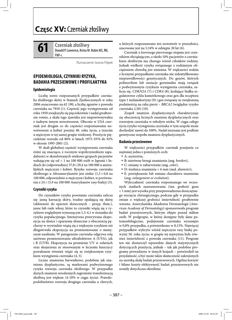 CZĘŚĆ XV: Czerniak złośliwy 61 Czerniak złośliwy Donald P. Lawrence, Krista M. Rubin MS, RN, FNP-c Tłumaczenie: Iwona Filipek EPIDEMIOLOGIA, CZYNNIKI RYZYKA, BADANIA PRZESIEWOWE I PROFILAKTYKA Epidemiologia Liczbę nowo rozpoznanych przypadków czerniaka złośliwego skóry w Stanach Zjednoczonych w roku 2006 oszacowano na 62 190, a liczbę zgonów z powodu czerniaka na 7910 (1). Częstość jego występowania od roku 1950 zwiększyła się pięciokrotnie i nadal gwałtownie rośnie, a skala tego zjawiska jest nieporównywalna z żadnym innym nowotworem. Obecnie w USA czerniak jest drugim co do częstości rozpoznawania nowotworem u kobiet poniżej 40. roku życia, a trzecim u mężczyzn w tej samej grupie wiekowej. Przeżycie pięcioletnie wzrosło od 80% w latach 1975-1976 do 92% w okresie 1995-2001 (2). W skali globalnej częstość występowania czerniaka różni się znacząco, z rocznym współczynnikiem zapadalności w skorelowanych wiekowo grupach pacjentów wahającym się od < 1 na 100 000 osób w Japonii i Indiach do (odpowiednio) 37,8 i 29,4 na 100 000 u australijskich mężczyzn i kobiet. Ryzyko rozwoju czerniaka złośliwego u Afroamerykanów jest niskie (1,3 i 0,8 na 100 000, odpowiednio u mężczyzn i kobiet, w porównaniu z 24 i 15,9 na 100 000 Amerykanów rasy białej) (3). Czynniki ryzyka Do czynników ryzyka powstania czerniaka zalicza się: jasną karnację skóry, trudno opalającą się skórę (skłonność do oparzeń słonecznych – przyp. tłum.), jasne lub rude włosy, które to czynniki wiążą się z ryzykiem względnym wynoszącym 1,3-4,1 w stosunku do ryzyka populacyjnego. Intensywna przerywana ekspozycja na słońce i oparzenia słoneczne z obecnością pęcherzy w wywiadzie wiążą się z większym ryzykiem niż długotrwała ekspozycja na promieniowanie o mniejszym nasileniu. W patogenezie czerniaka odgrywa rolę zarówno promieniowanie ultrafioletowe A (UVA), jak i B (UVB). Ekspozycja na promienie UV w solariach oraz skojarzona ze stosowanym w leczeniu łuszczycy psoralenem również wiąże się ze zwiększonym ryzykiem wystąpienia czerniaka (4, 5). Liczne znamiona barwnikowe, podobnie jak znamiona dysplastyczne, są markerami podwyższonego ryzyka rozwoju czerniaka złośliwego. W przypadku dużych znamion wrodzonych zagrożenie transformacją złośliwą jest większe (4-10% w ciągu życia). Prawdopodobieństwo rozwoju drugiego czerniaka u chorych, u których rozpoznawano ten nowotwór w przeszłości, szacowane jest na 5,34% w odstępie 20 lat (6). Czerniak u krewnego pierwszego stopnia jest czynnikiem obciążającym, a około 10% pacjentów z czerniakiem złośliwym ma chorego wśród członków rodziny. Jednak wielkość ryzyka związanego z rodzinnym obciążeniem chorobą jest zmienna. W większości rodzin z licznymi przypadkami czerniaka nie zidentyfikowano nieprawidłowości genetycznych. Do genów, których polimorfizm lub mutacje germinalne mają związek z podwyższonym ryzykiem wystąpienia czerniaka, zalicza się: CDKN2A (7) i CDK4 (8), kodujące białka regulatorowe cyklu komórkowego oraz gen dla receptora typu 1 melanokortyny (9) i gen związany ze zwiększoną podatnością na raka piersi – BRCA2 (względne ryzyko czerniaka 2,58) (10). Zespół znamion dysplastycznych charakteryzuje się obecnością licznych znamion dysplastycznych oraz rozwojem czerniaka w młodym wieku. W ciągu całego życia ryzyko wystąpienia czerniaka w tym zespole może dochodzić nawet do 100%. Nadal nieznane jest podłoże genetyczne zespołu znamion dysplastycznych. Badania przesiewowe W większości przypadków czerniak przejawia co najmniej jedna z poniższych cech: y A: asymetria, y B: nierówne brzegi znamienia (ang. borders), y C: zmiany w zabarwieniu (ang. color), y D: średnica znamienia > 6 mm (and. diameter), y E: powiększenie lub zmiana charakteru znamienia (ang. enlargement or evolution). Wyleczalność czerniaka rozpoznanego we wczesnych stadiach zaawansowania (tzn. grubość guza < 1 mm) jest wysoka przy przeprowadzeniu doszczętnego wycięcia chirurgicznego, podczas gdy w przypadku zmian o większej grubości śmiertelność gwałtownie wzrasta. Amerykańska Akademia Dermatologii (American Academy of Dermatology) sponsorowała program badań przesiewowych, którym objęto ponad milion osób. W podgrupie, w której dostępne były dane patomorfologiczne, podejrzenie czerniaka wysunięto w 0,8% przypadku, a potwierdzono w 0,15%. Najwięcej przypadków wykryto wśród mężczyzn rasy białej powyżej 50. roku życia; w grupie tej najwyższa była również śmiertelność z powodu czerniaka (11). Program ten nie dostarczył wprawdzie danych statystycznych dotyczących przeżycia, jednak – tak jak podobne programy prowadzone w innych krajach – potwierdził on przydatność, a być może także skuteczność zakrojonych na szeroką skalę badań przesiewowych. Ogólna korzyść i bilans koszty-efektywność badań przesiewowych nie zostały dotychczas określone. – 387 – 7563-008_book.indb 387 2009-12-30 09:41:07 Część XV: Czerniak złośliwy Profilaktyka Nie udowodniono jednoznacznie efektywności miejscowych filtrów słonecznych w profilaktyce pierwotnej czerniaka (12). Może to wynikać z faktu, iż większość dostępnych komercyjnie filtrów słonecznych zmniejsza ekspozycję na promieniowanie UVB, ale nie na UVA; ponadto filtry te są często nieprawidłowo stosowane, dają również fałszywe poczucie bezpieczeństwa, skłaniając do wydłużania czasu kąpieli słonecznych. Skuteczna strategia profilaktyki czerniaka wymaga prawdopodobnie połączenia działań edukacyjnych i zmiany zachowań, poczynając już od najmłodszego wieku. Tego typu programy są realizowane w Stanach Zjednoczonych, Australii i innych rejonach endemicznych, jednak ich rezultat jest obecnie trudny do oceny. PATOMORFOLOGICZNE CECHY CZERNIAKA ZŁOŚLIWEGO Prawdopodobieństwo nawrotu choroby i zgonu z powodu czerniaka jest bezpośrednio