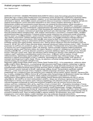 Portal i Kwartalnik Emiddle East Arabski program nuklearny Autor: Magdalena Sokó³ SARKOZY W ZATOCE I ARABSKI PROGRAM NUKLEARNYW efekcie wizyty francuskiego prezydenta Nicolasa Sarkozy’ego w krajach Zatoki Perskiej dosz³o do podpisania umowy dwustronnej o wspó³pracy wojskowej miêdzy Francj± a Zjednoczonymi Emiratami Arabskimi. Ustalono, ¿e si³y francuskie bêd± stacjonowaæ w swojej pierwszej, sta³ej bazie w regionie. Jednocze¶nie zawarto porozumienie dotycz±ce kooperacji w dziedzinie nuklearnej. Zak³ada ono wsparcie technologiczne i pomoc francuskich ekspertów na rzecz rozwoju programu atomowego w ZEA.  Zamierzeniem projektu jest pozyskiwanie energii atomowej oraz pokojowe jej wykorzystanie, przede wszystkim w dziedzinach przemys³u, energetyki i na potrzeby sektora komunalnego. W opiniach komentatorów, zasadniczym celem podró¿y Sarkozy’ego by³o potwierdzenie i zagwarantowanie francuskim firmom, lukratywnych kontraktów z arabskimi partnerami. St±d te¿, rz±d w Pary¿u zaoferowa³ Arabii Saudyjskiej – najwiêkszemu ¶wiatowemu eksporterowi ropy naftowej, pomoc w rozwijaniu nowoczesnych technologii atomowych jako alternatywnego ¼ród³a energii.Jednocze¶nie francuski potentat sektora energetycznego - EDF podpisa³ memorandum o zrozumieniu z w³adzami Kataru, odno¶nie zainteresowania tego kraju kooperacj± w obszarze produkcji energii nuklearnej oraz wytwarzania energii odnawialnej. Sarkozy zawar³ ju¿ wcze¶niej podobne, cywilne kontrakty nuklearne z arabskimi producentami ropy tj. z Algieri± i Libi±. Jego zdaniem muzu³manie i pañstwa arabskie powinny mieæ prawo i mo¿liwo¶æ posiadania w³asnego potencja³u atomowego. Wspomniane porozumienia z ZEA nakre¶l± ramy przysz³ej wspó³pracy w sektorze atomowym oraz militarnym. Pozwalaj±Â Francji na ustanowienie sta³ej bazy wojskowej w kraju o strategicznym po³o¿eniu wzd³u¿ krótkiego odcinka wód Zatoki Perskiej, naprzeciw Iranu. Wed³ug danych oficjalnych francuski kontyngent w ZEA ma liczyæ ok. 400 – 500 osób. Baza stanowiæ bêdzie realizacjê zobowi±zañ miêdzyrz±dowej umowy z 1995 r. Docelowo grupowaæ ma zarówno si³y powietrzne, jak te¿ l±dowe oraz morskie. Przedstawiciele strony francuskiej zadeklarowali, ¿e zacznie ona w pe³ni funkcjonowaæ w 2009 r.Jak stwierdzi³, Sarkozy powziêta inicjatywa militarna potwierdza rozszerzanie zakresu wspó³dzia³ania miêdzy obu krajami, ¶wiadczy o przyja¼ni i strategicznym partnerstwie, a nade wszystko podkre¶la fakt, ¿e Francja aktywnie uczestniczy w procesie stabilizacji regionu. W ramach umowy, francuski koncern Total wraz z grup± Suez, zajm± siê rozbudow± dwóch istniej±cych obecnie w ZEA reaktorów j±drowych. Lokalnym wspó³-wykonawc± przedsiêwziêcia zosta³a firma Areva - w³a¶ciciel i twórca reaktora. W skali miêdzynarodowej, najistotniejszy aspekt podjêtych decyzji, stanowi charakter tego miêdzyrz±dowego uk³adu. Jest pierwszym w regionie porozumieniem w bran¿y nuklearnej, zapowiadaj±cym ogromny postêp i krok naprzód w ambicjach technologicznych krajów Zatoki. Chocia¿ nie ujawniono ca³kowitej warto¶ci kontraktu, spekuluje siê, ¿e znacznie przewy¿sza ona kwotê 4 bilionów euro. Regionalny wy¶cig zbrojeñ?Rada Wspó³pracy Pañstw Zatoki Perskiej (GCC) - lu¼ny gospodarczo - polityczny alians sze¶ciu krajów Zatoki o¶wiadczy³a, ¿e przeanalizuje ideê stworzenia wspólnego programu nuklearnego w regionie. Wed³ug ¼róde³, trwaj± ju¿ stosowne konsultacje z inspektorami ds. energii atomowej dzia³aj±cymi przy ONZ oraz przedstawicielami Miêdzynarodowej Agencji Energii Atomowej (IAEA).W krêgach miêdzynarodowych, plany grupy GCC rozbudzi³y szerok± dyskusjê na temat regionalnego wy¶cigu zbrojeñ. Zaniepokojenie pog³êbiaj± sugestie mówi±ce, ¿e blok chce po³±czyæ w³asn± inicjatywê z irañskim programem atomowym. Stany Zjednoczone podejrzewaj± Iran o potajemne prace nad arsena³em broni nuklearnej, którym jednak Teheran uparcie zaprzecza.ZEA le¿± w pobli¿u strategicznej Cie¶niny Hormuz – g³Ã³wnego szlaku transportowego dla ¶wiatowych dostaw ropy naftowej. W jego obrêbie dosz³o ostatnio do incydentu miêdzy statkami amerykañskimi a jednostkami si³ irañskich. Administracja w Waszyngtonie utrzymuje, ¿e ³odzie Irañskiej Gwardii Rewolucyjnej niebezpiecznie zbli¿y³y siê (na odleg³o¶æ ok. 200 metrów) do trzech amerykañskich okrêtów, nêkaj±c jej i prowokuj±c agresywnymi manewrami. Doprowadzi³o to niemal¿e do wymiany ognia. Irañczycy bagatelizuj± ca³e zdarzenie uznaj±c je za dzia³anie rutynowe.Rodzajem przygotowañ do wdra¿ania emirackich projektów sta³y siê rozmowy toczone przez stronê rz±dow± zarówno z ekspertami IAEA, jak te¿ wspólnie z innymi cz³onkami GCC. ,,Prowadzimy konsultacje z Francj±, kilkoma innymi krajami oraz z Miêdzynarodow± Agencj± Energii Atomowej (IAEA)― – poinformowa³ jeden z wy¿szych urzêdników z ZEA. Kluczowa kwestia to sposób umo¿liwiaj±cy rozwój bezpiecznego, czystego, pokojowego i przejrzystego programu atomowego.Emiraty – lojalny sojusznik amerykañski w Zatoce, wspólnie z Arabi± Saudyjsk± i Katarem, potrzebuj± energii atomowej na pokrycie gwa³townie wzrastaj±cego zapotrzebowanie energetycznego oraz do procesów odsalania wody. Popyt na elektryczno¶æ w regionie zwiêkszy³ siê diametralnie, obci±¿aj±c krajowe sieci energetyczne, w tym samym stopniu, w jakim rekordowe ceny ropy podsycaj± ekspansjê ekonomiczn±. ¬ród³o: Reuters, z dn. 16.01.2008 Magdalena Sokó³, jest studentk± V roku Arabistyki Uniwersytetu Jagielloñskiego. http://www.test.emiddle-east.com Kreator PDF Utworzono 3 March, 2017, 14:44