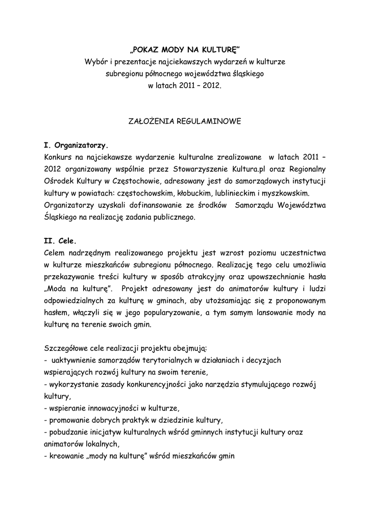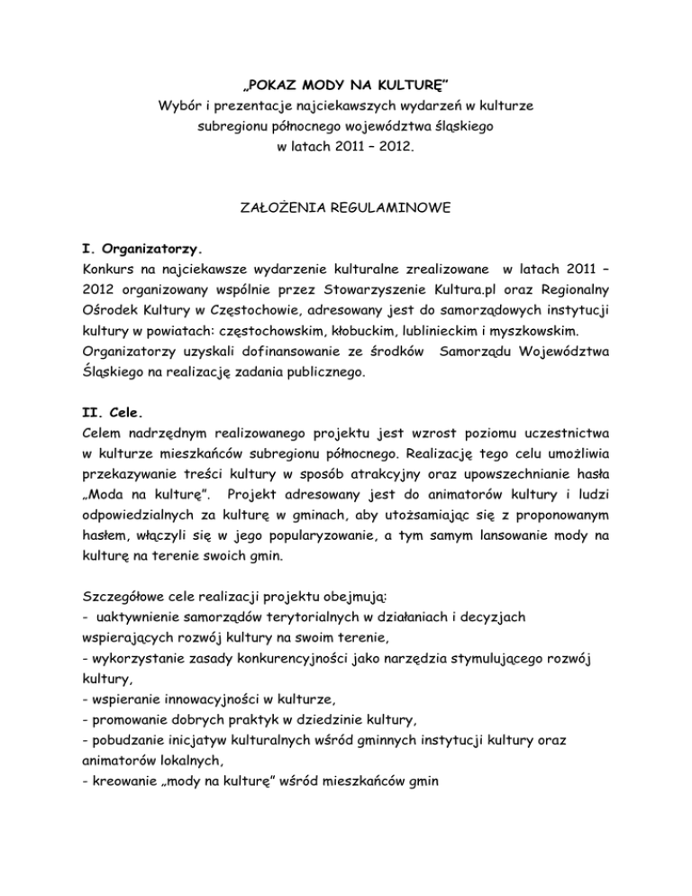 „POKAZ MODY NA KULTURĘ” Wybór i prezentacje najciekawszych wydarzeń w kulturze subregionu północnego województwa śląskiego w latach 2011 – 2012. ZAŁOŻENIA REGULAMINOWE I. Organizatorzy. Konkurs na najciekawsze wydarzenie kulturalne zrealizowane w latach 2011 – 2012 organizowany wspólnie przez Stowarzyszenie Kultura.pl oraz Regionalny Ośrodek Kultury w Częstochowie, adresowany jest do samorządowych instytucji kultury w powiatach: częstochowskim, kłobuckim, lublinieckim i myszkowskim. Organizatorzy uzyskali dofinansowanie ze środków Samorządu Województwa Śląskiego na realizację zadania publicznego. II. Cele. Celem nadrzędnym realizowanego projektu jest wzrost poziomu uczestnictwa w kulturze mieszkańców subregionu północnego. Realizację tego celu umożliwia przekazywanie treści kultury w sposób atrakcyjny oraz upowszechnianie hasła „Moda na kulturę”. Projekt adresowany jest do animatorów kultury i ludzi odpowiedzialnych za kulturę w gminach, aby utożsamiając się z proponowanym hasłem, włączyli się w jego popularyzowanie, a tym samym lansowanie mody na kulturę na terenie swoich gmin. Szczegółowe cele realizacji projektu obejmują: - uaktywnienie samorządów terytorialnych w działaniach i decyzjach wspierających rozwój kultury na swoim terenie, - wykorzystanie zasady konkurencyjności jako narzędzia stymulującego rozwój kultury, - wspieranie innowacyjności w kulturze, - promowanie dobrych praktyk w dziedzinie kultury, - pobudzanie inicjatyw kulturalnych wśród gminnych instytucji kultury oraz animatorów lokalnych, - kreowanie „mody na kulturę” wśród mieszkańców gmin III. Zasady uczestnictwa. 1. W konkursie biorą udział wydarzenia kulturalne zrealizowane w latach 2011 – 2012 przez samorządowe instytucje kultury z terenu subregionu północnego: - festiwale, przeglądy, plenerowe imprezy kulturalne, - warsztaty artystyczne i pokazy pracy twórczej, - wystawy twórczości artystycznej, - prezentacje wyrobów, produktów lokalnych, - konkursy w dziedzinie kultury i sztuki, - wydawnictwa /książkowe, multimedialne, filmy DVD/, - inicjatywy kulturalne angażujące lokalne społeczności, - inne przedsięwzięcia kulturalne 2. Wydarzenia mogą mieć zasięg lokalny lub ponadlokalny. Powinny to być projekty posiadające atrybuty innowacyjności, odkrywczości, świeżości, wprowadzające nowe trendy w kulturze regionalnej, jakkolwiek inspiracji należy poszukiwać zarówno w tradycji jak i we współczesności. 3. Warunkiem uczestnictwa w Konkursie jest przesłanie wypełnionej karty zgłoszenia oraz dokumentacji wydarzenia w formie opisu z dołączoną dokumentacją fotograficzną, filmową /DVD/, wydawnictwami okolicznościowymi i wydawnictwami książkowymi /w pojedynczych egzemplarzach/. W konkursie biorą udział tylko wydarzenia kulturalne już zrealizowane i zakończone. Jeżeli wydarzenie ma charakter cykliczny lub wieloetapowy, to możliwe jest zgłoszenie zakończonego etapu działania, stanowiącego zamkniętą całość. 4. Zgłoszenia należy nadsyłać na adres: Regionalny Ośrodek Kultury, ul. Ogińskiego 13a, 42-200 Częstochowa lub pocztą elektroniczną na adres: [email protected] do 31 października 2012 r. Organizatorzy nie zwracają nadesłanych materiałów. 5. Finałem będzie pokaz nagrodzonych wydarzeń w formie uzgodnionej z organizatorami /prezentacja multimedialna, film, narracja z prezentacją materiałów okolicznościowych, pokaz „żywego planu” itd./. IV. Kryteria oceny i nagrody. 1. Organizatorzy powołają Komisję Konkursową, która dokona oceny zgłoszonych wydarzeń kulturalnych, kierując się następującymi kryteriami: - nowatorstwo, oryginalność, kompleksowość przedsięwzięcia, - zastosowanie nowoczesnych środków technologicznych, - walory artystyczne i poznawcze, - walory edytorskie w przypadku wydawnictw książkowych, - atrakcyjność dla odbiorców lub uczestników, skuteczna forma przekazu, - ukazanie wartości tradycyjnej kultury ludowej w nowym kontekście kulturowym oraz z wykorzystaniem nowoczesnych narzędzi komunikowania treści kultury, - ocena wartości społecznej, zaangażowanie innych podmiotów, szeroki zasięg, - umożliwianie aktywnego i kreatywnego udziału uczestników. 2. Komisja wyłoni najlepsze zrealizowane projekty kulturalne. Wybrane przez Komisję wydarzenia kulturalne otrzymają statuetkę oraz tytuł „Hit kulturalny 2011-2012”. Statuetka z tytułem „Kreator mody na kulturę” przyznana zostanie instytucjom kultury, które przygotowały i zrealizowały nagrodzone projekty a tytuł „Gmina z Kulturą” otrzymają gminy, w których projekty powstały i zostały zrealizowane. Autorom i koordynatorom nagrodzonych projektów zostaną przyznane nagrody finansowe i rzeczowe. Decyzje jury są niepodważalne i ostateczne. 3. Wszyscy zainteresowani zostaną zawiadomieni o decyzjach Komisji w terminie do 10 listopada br. 4. Uroczyste wręczenie statuetek wraz z nagrodami oraz sesja zdjęciowa, będą miały miejsce podczas imprezy finałowej w dniu 29 listopada 2012 r. w Regionalnym Ośrodku Kultury. Uroczystość rozpocznie tytułowy pokaz mody na kulturę, czyli prezentacja nagrodzonych wydarzeń kulturalnych. V. Uwagi końcowe. Organizatorzy mają nadzieję, że zaproponowana formuła konkursowa zainspiruje i zachęci organizatorów życia kulturalnego w gminach, animatorów lokalnych a także władze samorządowe do podnoszenia jakości działań kulturalnych, poszukiwania nowych i oryginalnych pomysłów, kształtowania lokalnych polityk kulturalnych jako ważnych dziedzin życia społeczności lokalnych i promocji gmin poprzez kulturę. Wspólnie kreujemy modę na kulturę.