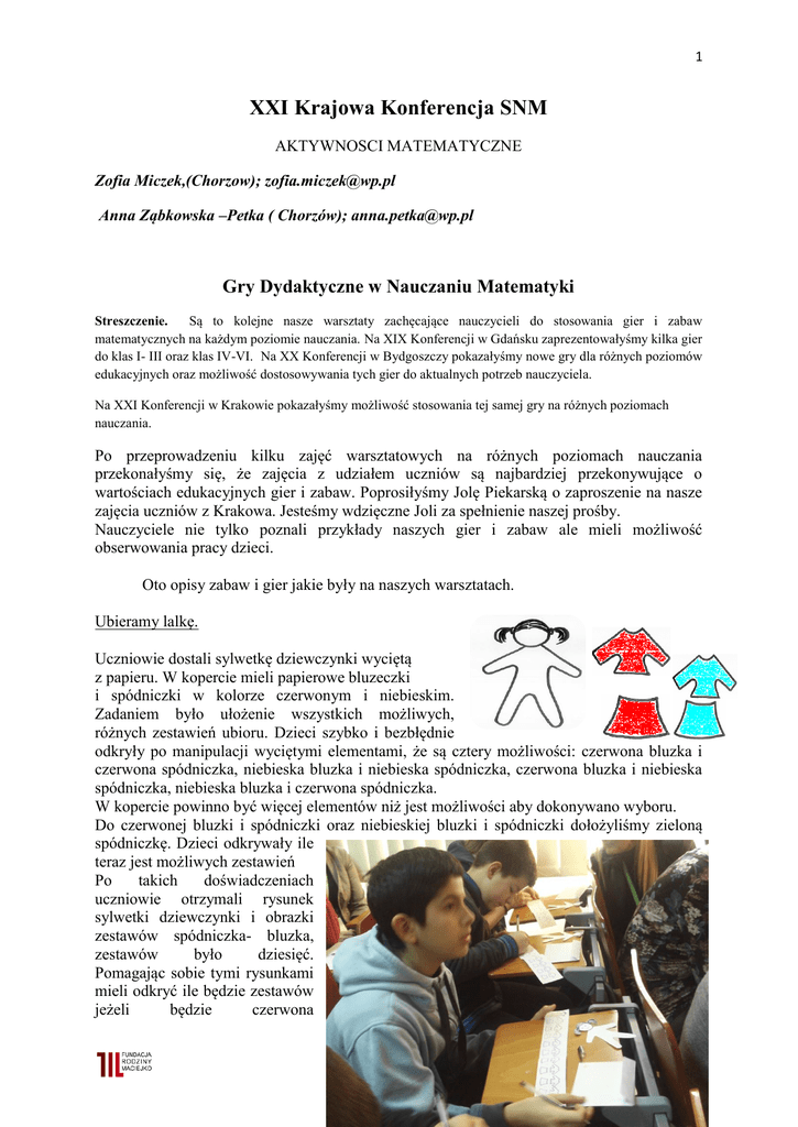 1 XXI Krajowa Konferencja SNM AKTYWNOSCI MATEMATYCZNE Zofia Miczek,(Chorzow); [email protected] Anna Ząbkowska –Petka ( Chorzów); [email protected] Gry Dydaktyczne w Nauczaniu Matematyki Streszczenie. Są to kolejne nasze warsztaty zachęcające nauczycieli do stosowania gier i zabaw matematycznych na każdym poziomie nauczania. Na XIX Konferencji w Gdańsku zaprezentowałyśmy kilka gier do klas I- III oraz klas IV-VI. Na XX Konferencji w Bydgoszczy pokazałyśmy nowe gry dla różnych poziomów edukacyjnych oraz możliwość dostosowywania tych gier do aktualnych potrzeb nauczyciela. Na XXI Konferencji w Krakowie pokazałyśmy możliwość stosowania tej samej gry na różnych poziomach nauczania. Po przeprowadzeniu kilku zajęć warsztatowych na różnych poziomach nauczania przekonałyśmy się, że zajęcia z udziałem uczniów są najbardziej przekonywujące o wartościach edukacyjnych gier i zabaw. Poprosiłyśmy Jolę Piekarską o zaproszenie na nasze zajęcia uczniów z Krakowa. Jesteśmy wdzięczne Joli za spełnienie naszej prośby. Nauczyciele nie tylko poznali przykłady naszych gier i zabaw ale mieli możliwość obserwowania pracy dzieci. Oto opisy zabaw i gier jakie były na naszych warsztatach. Ubieramy lalkę. Uczniowie dostali sylwetkę dziewczynki wyciętą z papieru. W kopercie mieli papierowe bluzeczki i spódniczki w kolorze czerwonym i niebieskim. Zadaniem było ułożenie wszystkich możliwych, różnych zestawień ubioru. Dzieci szybko i bezbłędnie odkryły po manipulacji wyciętymi elementami, że są cztery możliwości: czerwona bluzka i czerwona spódniczka, niebieska bluzka i niebieska spódniczka, czerwona bluzka i niebieska spódniczka, niebieska bluzka i czerwona spódniczka. W kopercie powinno być więcej elementów niż jest możliwości aby dokonywano wyboru. Do czerwonej bluzki i spódniczki oraz niebieskiej bluzki i spódniczki dołożyliśmy zieloną spódniczkę. Dzieci odkrywały ile teraz jest możliwych zestawień Po takich doświadczeniach uczniowie otrzymali rysunek sylwetki dziewczynki i obrazki zestawów spódniczka- bluzka, zestawów było dziesięć. Pomagając sobie tymi rysunkami mieli odkryć ile będzie zestawów jeżeli będzie czerwona www.maciejko.org 2 spódniczka i bluzka, niebieska spódniczka i bluzka, zielona spódniczka i bluzka. Dzieci różnie organizowały sobie pracę ale nie było problemu z odkryciem, że jest dziewięć możliwości. Na rysunku było dziesięć miejsc do wypełnienia aby można było porozmawiać czy wyczerpały wszystkie możliwości. Zachęcałyśmy, aby w domu lub na lekcjach w szkole zbadali ilość zestawień dokładając następne elementy i spróbowały odkryć prawidłowość. W klasach młodszych dzieci dokonują odkryć w drodze manipulacji elementami w starszych dokonując zapisów w różny sposób. Jeżeli zaproponujemy, kto najszybciej i bezbłędnie wykona zadanie mamy grę. Figury i ich własności. Każde dziecko otrzymało zestaw różnokolorowych figur wyciętych z papieru. Zestaw może być różny w zależności od tego, co chcemy zbadać. W naszym zestawie były: kwadrat, prostokąt, trójkąt i koło. Prowadzący czytał polecenia, uczniowie ze swojego zestawu wybierali model spełniający warunek o którym mówiło polecenie i podnosili figurę do góry. Przykładowe polecenia: Wszystkie figury, które mają wszystkie kąty proste. Wszystkie figury o bokach tej samej długości. Wszystkie figury, które nie są czworokątami. Wszystkie figury, które mają dokładnie jeden kąt prosty. Wszystkie figury, które mają co najmniej jeden kąt prosty. Wszystkie figury, które nie są wielokątami. Wszystkie figury, które są wielokątami. Poprosiliśmy aby dzieci same podały polecenia związane z zestawem figur. W klasach młodszych w poleceniach dotyczących kształtu dodajemy jeszcze kolor. Wszystkie czerwone trójkąty. Wszystkie niebieskie koła. Możemy tą zabawę przeprowadzić jako ruchową. Każde dziecko ma w ręce tylko jedną figurę. Dzieci stoją w okręgu, w środku nauczyciel i wydaje polecenie np.: wzywam do siebie wszystkie czerwone kwadraty. Wzywam do siebie wszystkie koła. W klasach starszych możemy pytać o pola powierzchni i obwody. Zabawa logiczna „ Kto jest kto?” Dzieci pracowały parami. Każda para otrzymała kopertę a w niej trzy sylwetki dziewczynek oraz karteczki z napisami: Basia, Zosia, Ala, pies, kot, papuga, włosy czarne, włosy rude, włosy blond. Prowadzący wyjaśnił na czym będzie polegało zadanie. Uczniowie muszą uważnie słuchać informacji podawanych przez nauczyciela, manipulować wyciętymi napisami i odkryć kto jest kim. www.maciejko.org 3 Nauczyciel czyta: Są trzy koleżanki: Basia, Ala i Zosia. ( Dla młodszych dzieci sylwetki są już z wypisanymi imionami). Jedna z nich ma czarne włosy, jedna ma rude włosy a jedna jest blondynką. Każda z nich ma jedno zwierzątko: psa lub kota lub papugę. Odkryj jakiego koloru włosy ma każda z nich i jakie ma zwierzątko jeżeli: Basia nie jest blondynką i nie ma rudych włosów. Zosia nie jest blondynką. Blondynka nie ma papugi. Dziewczynka z rudymi włosami ma psa. Dzieci odkryły, że Basia ma czarne włosy i papugę; Zosia rude włosy i psa; Ala jest blondynką i ma kota. W klasach młodszych dajemy dzieciom wycięte obrazki aby mogły nimi manipulować zaś w klasach starszych tylko tekst. Nie narzucamy dzieciom sposobu organizowania sobie pracy. Porządkujemy półki z książkami. Dzieci pracowały indywidualnie. Otrzymały planszę z rysunkiem półek na książki. Prowadzący powoli czytał polecenia a dzieci zaznaczały na swoich planszach. Na półce z gwiazdką są 4 książki. Na półce bezpośrednio pod gwiazdką o dwie mniej. Na najwyższej półce dwa razy tyle co na półce z gwiazdką. Na półce bezpośrednio nad półką z gwiazdką tyle ile na półce z gwiazdką i bezpośrednio pod nią razem. Na półce drugiej od góry dwa razy mniej niż na pół