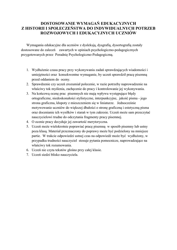 DOSTOSOWANIE WYMAGAŃ EDUKACYJNYCH Z HISTORII I SPOŁECZEŃSTWA DO INDYWIDUALNYCH POTRZEB ROZWOJOWYCH I EDUKACYJNYCH UCZNIÓW Wymagania edukacyjne dla uczniów z dysleksją, dysgrafią, dysortografią zostały dostosowane do zaleceń zawartych w opiniach psychologiczno-pedagogicznych przygotowanych przez Poradnię Psychologiczno-Pedagogiczną. 1. Wydłużenie czasu pracy przy wykonywaniu zadań sprawdzających wiadomości i umiejętności oraz konsekwentne wymaganie, by uczeń sprawdził pracę pisemną przed oddaniem do oceny. 2. Sprawdzenie czy uczeń zrozumiał polecenie, w razie potrzeby naprowadzenie na właściwy tok myślenia, zachęcenie do pracy i kontrolowanie jej wykonywania. 3. Na końcową ocenę prac pisemnych nie mają wpływu występujące błędy ortograficzne, niedoskonałości stylistyczne, interpunkcyjne, jakość pisma - jego strona graficzna, kłopoty z mieszczeniem się w liniaturze. Jednocześnie motywowanie uczniów do większej dbałości o stronę graficzną i estetyczną pisma oraz docenianie ich wysiłków i starań w tym zakresie. Uczeń może sam przeczytać nauczycielowi trudne do odczytania fragmenty pracy pisemnej. 4. O ocenie pracy decyduje jej zawartość merytoryczna. 5. Uczeń może wielokrotnie poprawiać pracę pisemną w sposób pisemny lub ustny poza klasą. Materiał przeznaczony do poprawy może być podzielony na mniejsze partie. W trakcie odpowiedzi ustnej czas na odpowiedź może być wydłużony, w przypadku trudności nauczyciel stosuje pytania pomocnicze, naprowadzające na właściwy tok rozumowania. 6. Uczeń nie czyta tekstów głośno przy całej klasie. 7. Uczeń siedzi blisko nauczyciela.