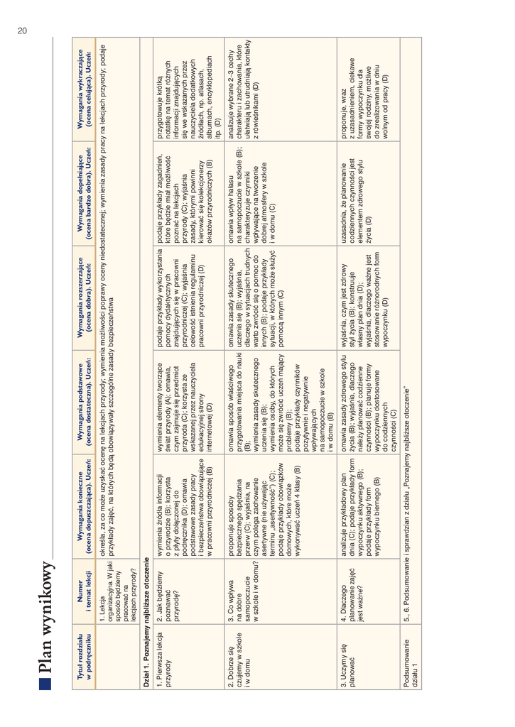 Wymagania konieczne (ocena dopuszczajàca). Uczeƒ: Wymagania podstawowe (ocena dostateczna). Uczeƒ: Wymagania rozszerzajàce (ocena dobra). Uczeƒ: Wymagania dopełniajàce (ocena bardzo dobra). Uczeƒ: Wymagania wykraczajàce (ocena celujàca). Uczeƒ: 5., 6. Podsumowanie i sprawdzian z działu „Poznajemy najbli˝sze otoczenie” omawia zasady zdrowego stylu ˝ycia (B); wyjaÊnia, dlaczego nale˝y planowaç codzienne czynnoÊci (B); planuje formy wypoczynku dostosowane do codziennych czynnoÊci (C) Podsumowanie działu 1 analizuje przykładowy plan dnia (C); podaje przykłady form wypoczynku aktywnego (B); podaje przykłady form wypoczynku biernego (B) 4. Dlaczego planowanie zaj´ç jest wa˝ne? 3. Uczymy si´ planowaç omawia sposób właÊciwego przygotowania miejsca do nauki (B); wymienia zasady skutecznego uczenia si´ (B); wymienia osoby, do których mo˝e si´ zwróciç uczeƒ majàcy problemy (B); podaje przykłady czynników pozytywnie i negatywnie wpływajàcych na samopoczucie w szkole i w domu (B) proponuje sposoby bezpiecznego sp´dzania przerw (C); wyjaÊnia, na czym polega zachowanie asertywne (nie u˝ywajàc terminu „asertywnoÊç”) (C); podaje przykłady obowiàzków domowych, które mo˝e wykonywaç uczeƒ 4 klasy (B) 3. Co wpływa na dobre samopoczucie w szkole i w domu? 2. Dobrze si´ czujemy w szkole i w domu wymienia elementy tworzàce Êwiat przyrody (A); omawia, czym zajmuje si´ przedmiot przyroda (C); korzysta ze wskazanej przez nauczyciela edukacyjnej strony internetowej (D) 2. Jak b´dziemy poznawaç przyrod´? 1. Pierwsza lekcja przyrody wymienia êródła informacji o przyrodzie (B); korzysta z płyty dołàczonej do podr´cznika (D); omawia podstawowe zasady pracy i bezpieczeƒstwa obowiàzujàce w pracowni przyrodniczej (B) uzasadnia, ˝e planowanie codziennych czynnoÊci jest elementem zdrowego stylu ˝ycia (D) proponuje, wraz z uzasadnieniem, ciekawe formy wypoczynku dla swojej rodziny, mo˝liwe do zrealizowania w dniu wolnym od pracy (D) analizuje wybrane 2–3 cechy charakteru i zachowania, które ułatwiajà lub utrudniajà kontakty z rówieÊnikami (D) omawia wpływ hałasu na samopoczucie w szkole (B); charakteryzuje czynniki wpływajàce na tworzenie dobrej atmosfery w szkole i w domu (C) omawia zasady skutecznego uczenia si´ (B); wyjaÊnia, dlaczego w sytuacjach trudnych warto zwróciç si´ o pomoc do innych (B); podaje przykłady sytuacji, w których mo˝e słu˝yç pomocà innym (C) wyjaÊnia, czym jest zdrowy styl ˝ycia (B); konstruuje własny plan dnia (D); wyjaÊnia, dlaczego wa˝ne jest stosowanie ró˝norodnych form wypoczynku (D) przygotowuje krótkà notatk´ na temat ró˝nych informacji znajdujàcych si´ we wskazanych przez nauczyciela dodatkowych êródłach, np. atlasach, albumach, encyklopediach itp. (D) podaje przykłady zagadnieƒ, które b´dzie miał mo˝liwoÊç poznaç na lekcjach przyrody (C); wyjaÊnia zasady, którymi powinni kierowaç si´ kolekcjonerzy okazów przyrodniczych (B) podaje przykłady wykorzystania pomocy dydaktycznych znajdujàcych si´ w pracowni przyrodniczej (C); wyjaÊnia celowoÊç istnienia regulaminu pracowni przyrodniczej (D) 1. Lekcja okreÊla, za co mo˝e uzyskaç ocen´ na lekcjach przyrody; wymienia mo˝liwoÊci poprawy oceny niedostatecznej; wymienia zasady pracy na lekcjach przyrody; podaje organizacyjna. W jaki przykłady zaj´ç, na których b´dà obowiàzywały szczególne zasady bezpieczeƒstwa sposób b´dziemy pracowaç na lekcjach przyrody? Numer i temat lekcji Dział 1. Poznajemy najbli˝sze otoczenie Tytuł rozdziału w podr´czniku Plan wynikowy 20 Numer i temat lekcji Wymagania konieczne (ocena dopuszczajàca). Uczeƒ: 4. OkreÊlamy kierunki geograficzne okreÊla przeznaczenie poszczególnych cz´Êci mikroskopu (C) wyznacza kierunki geograficzne posługujàc si´ instrukcjà, omawia sposób wyznaczania za pomocà kompasu (C) wyznacza kierunki geograficzne kierunków geograficznych za za pomocà gnomonu (C) pomocà gnomonu (B) 12. OkreÊlamy kierunki geograficzne za pomocà kompasu i gnomonu porównuje dokładnoÊç wyznaczania kierunków geograficznych za pomocà kompasu i gnomonu (D) wyjaÊnia, co to jest widnokràg (B); podaje przykłady wykorzystania omawia budow´ kompasu (B) w ˝yciu umiej´tnoÊci wyznaczania kierunków geograficznych (B) podaje nazwy wskazanych przez nauczyciela głównych kierunków geograficznych (C) 11. W jaki sposób okreÊlamy kierunki geograficzne? podaje nazwy głównych kierunków geograficznych (C) podpisuje na schemacie poszczególne cz´Êci mikroskopu (C); przeprowadza obserwacj´ mikroskopowà zgodnie z instrukcjà (D) omawia przeznaczenie mikroskopu (B); przygotowuje mikroskop do prowadzenia obserwacji (C) 10. Poznajemy budow´ i działanie mikroskopu podaje przykłady obiektów, które mo˝na obserwowaç za pomocà mikroskopu (B); wykonuje schematyczny rysunek obserwowanego obiektu (C) planuje obserwacj´ dowolnego obiektu lub organizmu w terenie (D); uzasadnia celowoÊç zaplanowanej obserwacji (D) planuje miejsca 2–3 obserwacji (C); dobiera przyrzàd do obserwowanego obiektu (C) przyporzàdkowuje przyrzàd do obserwowanego obiektu (C); proponuje przyrzàdy, jakie nale˝y przygotowaç do prowadzenia obserwacji w terenie (D); okreÊla charakterystyczne cechy obserwowanych obiektów (C) podaje nazwy przyrzàdów słu˝àcych do prowadzenia obserwacji w terenie (A); przeprowadza obserwacj´ za pomocà lupy lub lornetki (C); notuje 2–3 spostrze˝enia dotyczàce obserwowanych 9a. Lekcja obiektów (C); wykonuje w terenie – schematyczny rysunek Przyrzàdy i pomoce obserwowanego obiektu (C) przyrodnika 9. Przyrzàdy i pomoce ułatwiajàce prowadzenie obserwacji w terenie 3. Przyrzàdy i pomoce przyrodnika na podstawie obserwacji podejmuje prób´ przewidzenia niektórych sytuacji i zjawisk (np. dotyczàcych pogody, zachowania zwierzàt) (D); wyjaÊnia, czym jest doÊwiadczenie (B) porównuje iloÊç i rodzaj informacji uzyskiwanych za
