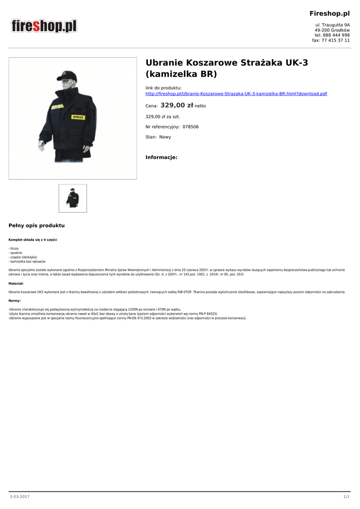 Fireshop.pl ul. Traugutta 9A 49-200 Grodków tel: 888 444 998 fax: 77 415 37 11 Ubranie Koszarowe Strażaka UK-3 (kamizelka BR) link do produktu: http://fireshop.pl/Ubranie-Koszarowe-Strazaka-UK-3-kamizelka-BR.html?download.pdf Cena: 329,00 zł netto 329,00 zł za szt. Nr referencyjny: 078506 Stan: Nowy Informacje: Pełny opis produktu Komplet składa się z 4 części: - bluza - spodnie - czapka (dżokejka) - kamizelka bez rękawów Ubranie specjalne zostało wykonane zgodnie z Rozporzadzeniem Ministra Spraw Wewnętrznych i Administracji z dnia 20 czerwca 2007r. w sprawie wykazu wyrobów służących zapenieniu bezpieczeństwa publicznego lub ochronie zdrowia i życia oraz mienia, a także zasad wydawania dopuszczenia tych wyrobów do użytkowania (Dz. U. z 2007r., nr 143 poz. 1002, z 2010r. nr 85, poz. 553) Materiał: Ubranie koszarowe UK3 wykonane jest z tkaniny bawełnianej z udziałem włókien poliestrowych, tworzących siatkę RIB-STOP. Tkanina posiada wykończenie oleofobowe, zapewniające najwyższy poziom odporności na zabrudzenia. Normy: -Ubranie charakteryzuje się podwyższoną wytrzymałością na rozdarcia sięgającą 1200N po osnowie i 670N po wątku. -Użyta tkanina umożliwia konserwację ubrania nawet w 40oC bez obawy o utratę barw (poziom odporności wybarwień wg normy PN-P 84525) -Ubranie wyposażone jest w specjalne taśmy fluorescencyjne spełniające normy PN-EN 471:2003 w zakresie widzialności oraz odporności w procesie konserwacji. 3-03-2017 1/1