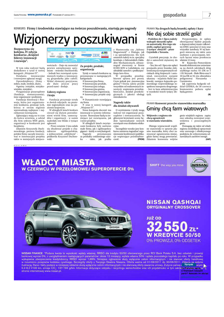 Gazeta Pomorska www.pomorska.pl gospodarka Poniedzia³ek 27 czerwca 2011 r. KONKURS Firmy i œrodowiska stawiaj¹ce na twórcze poszukiwania, startuj¹ po nagrody PRAWO Na drogach bêd¹ bramki, op³aty i kary Wizjonerzy poszukiwani Nie daj sobie strzeliæ gola! Rozpoczyna siê kolejna, IV edycja konkursu „Krajowi liderzy innowacji i rozwoju”. W tym roku walczyæ bêd¹ dodatkowo o tytu³ w nowej kategorii: „Wizjoner IT”. Dzia³ania innowacyjne i rozwojowe zg³aszaæ mog¹: przedsiêbiorcy (firmy mikro, ma³e, œrednie, du¿e), gminy (wiejskie, miejskowiejskie, miejskie), organizacje pozarz¹dowe (fundacje, stowarzyszenia), inne organizacje i podmioty. Fundacja Innowacji i Rozwoju, która jest organizatorem konkursu, promuje tych, którzy w swoim regionie wprowadzaj¹ najlepsze i najciekawsze rozwi¹zania. Zg³aszaj¹cy maj¹ na to czas do koñca wrzeœnia, a udzia³ dla firm sektora MŒP, gmin, organizacji w konkursie jest bezp³atny. Zdaniem Krzysztofa Duch no wskiego, prezesa fundacji, polskie firmy zaczê³y inwestowaæ w innowacyjne projekty tak¿e w mniejszych miejsco- woœciach: - Daje siê zauwa¿yæ pewien umiarkowany optymizm - twierdzi Duchnowski. - Jednak bez rozwi¹zañ systemowych trudno o innowacyjn¹ gospodarkê jako ca³oœæ. Widaæ elementy pozytywne, ale du¿o jeszcze pracy przed nami - dodaje. Liderzy regionu i kraju Fundacja przyznaje tytu³y w dwóch edycjach: na poziomie regionalnym oraz na poziomie krajowym. W ubieg³ych latach konkurs cieszy³ siê du¿ym powodzeniem wœród firm, samorz¹dów i organizacji - w sumie nades³a³y one blisko 2 tysi¹ce zg³oszeñ. - Przez ostatnie 3 lata uda³o siê zbudowaæ projekt o charakterze ogólnopolskim, a jednoczeœnie „oddolnym” podkreœla Krzysztof Duchnowski. 7 Przypomnijmy, ¿e op³ata - Podobno do 1 lipca nale¿y obowi¹zywaæ bêdzie pojazdy wykupiæ skrzynki op³at o dopuszczalnej masie ca³kowiza autostradê. Kto tego nie tej (DMC) powy¿ej 3,5 tony oraz zrobi, zap³aci grzywnê wszystkie autobusy. W tej katez Mastercooka czy „Syfrowy 3 tysi¹ce z³otych? - pisze gorii mieszcz¹ siê tak¿e auta Magnetowid” z Dialogu, jak Czytelnik z Torunia. osobowe z przyczepami, któi za specjalistyczne. Do tych Czytelnik precyzuje, ¿e cho- rych ³¹czna masa przekracza ostatnich nale¿y m.in. specjalny kombajn z Zabrzañskich Zak³a- dzi o samochód ciê¿arowy do w³aœnie 3,5 tony. W Kujawsko-Pomorskiem dów Mechanicznych, ultraso- 12 ton. - Ten, kto od 1 lipca nie op³aci bramki elektroniczne ustawiane nograf stworzony w firmie Za projekt, produkt, ECHO-SON w Lubelskiem, czy przejazdu przez bramkê elek- s¹ na dwóch odcinkach dróg organizacjê ultralekki samolot z podkarpac- troniczn¹ na wytypowanych od- szybkiego ruchu: S5 (DK nr 5 Tytu³y w ramach konkursu s¹ kiego Aero-Kros. cinkach dróg krajowych i auto- i 10) Stryszek - Bia³e B³ota oraz S przyznawane w nastêpuj¹cych W przypadku przedsiê- strad, rzeczywiœcie zostanie 10 (na DK nr 10, tzw. obwodnica kategoriach: biorstw sprawa jest prosta. ukarany - wyjaœnia Rafa³ Jan- poligonowa) Nieszawka Innowacyjna firma, Czym jednak jest „innowacyjna kowski, zastêpca kujawsko-po- Czerniewice. Innowacyjny produkt, gmina”? Ocena zale¿y przede morskiego wojewódzkiego inJak zapewnia bydgoski od Innowacyjna us³uga, wszystkim od realizowanych in- spektora transportu drogowego. dzia³ GDDKiA, do 30 czerwca Innowacyjna gmina, westycji, wspierania przedsiê- - Jest to kara administracyjna bramownice poboru op³at Innowacyjna organizacja, biorczoœci, dzia³añ proekolo- w wysokoœci trzech tysiêcy z³o- bêd¹ gotowe. Innowacyjny projekt unij- gicznych i jakoœci obs³ugi tych. (M) ny, mieszkañców. Dynamicznie rozwijaj¹ca siê firma Nagrody tak¿e PRAWO Konwent przeciw stanowisku marsza³ka oraz w nowej kategorii dla dzia³añ obywateli „Wizjoner IT”. Nowa kategoria doceniæ ma O wyró¿nienia i tytu³y mog¹ innowacje w systemy informa- walczyæ te¿ organizacje pozagmin wiejskich regionu zapisy tyczne. Rozwa¿ane bêd¹ tu ist- rz¹dowe i stowarzyszenia. Tu Wójtowie z regionu nie niej¹ce ju¿ rozwi¹zania, jak g³ównymi kryteriami oceny bê- chc¹ ograniczeñ owe szkodz¹ rozwojowi wojei nowe projekty. dzie wprowadzanie nowych w stawianiu wiatraków. wództwa i poszczególnych W ubieg³ych latach zwyciêz- rozwi¹zañ oraz dzia³ania edukagmin. Dlatego wypracowali wspólDomagaj¹ siê tak¿e od w³adz cami konkursu by³y zarówno cyjne. Szczególnie wysoko jury kon- ne stanowisko w sprawie pla- regionu modyfikacji opracowañ ma³e firmy, jak i ogólnopolscy giganci - ka¿dy w swej kategorii. kursu zamierza nagradzaæ orga- nów marsza³ka, który chce za- oraz szerszego i obiektywnego Nagrody przyznawano nizowanie konferencji i publika- stosowaæ ograniczenia miejsc, podejœcia do wykorzystania odza produkty codziennego u¿yt- cje wspieraj¹ce przedsiêbior- gdzie farmy mog¹ powstawaæ. nawialnych zasobów energii. (PROM) Zdaniem konwentu wójtów (KAF) ku - takie, jak pralka czoœæ. Gminy chc¹ farm wiatrowych R E K L A M A FOT. ASASDAS Aasdsfdsfsdfsdfsdf forum Co Pañstwo s¹dz¹ o finansach naszych partii? Nale¿a³o im obci¹æ www.pomorska.pl/forum