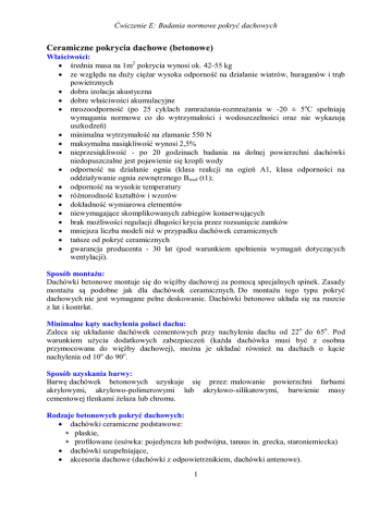 Ćwiczenie E: Badania normowe pokryć dachowych Ceramiczne pokrycia dachowe (betonowe) Właściwości: średnia masa na 1m2 pokrycia wynosi ok. 42-55 kg ze względu na duży ciężar wysoka odporność na działanie wiatrów, huraganów i trąb powietrznych dobra izolacja akustyczna dobre właściwości akumulacyjne mrozoodporność (po 25 cyklach zamrażania-rozmrażania w -20 ± 5oC spełniają wymagania normowe co do wytrzymałości i wodoszczelności oraz nie wykazują uszkodzeń) minimalna wytrzymałość na złamanie 550 N maksymalna nasiąkliwość wynosi 2,5% nieprzesiąkliwość - po 20 godzinach badania na dolnej powierzchni dachówki niedopuszczalne jest pojawienie się kropli wody odporność na działanie ognia (klasa reakcji na ogień A1, klasa odporności na oddziaływanie ognia zewnętrznego Broof (t1); odporność na wysokie temperatury różnorodność kształtów i wzorów dokładność wymiarowa elementów niewymagające skomplikowanych zabiegów konserwujących brak możliwości regulacji długości krycia przez rozsunięcie zamków mniejsza liczba modeli niż w przypadku dachówek ceramicznych tańsze od pokryć ceramicznych gwarancja producenta - 30 lat (pod warunkiem spełnienia wymagań dotyczących wentylacji). Sposób montażu: Dachówki betonowe montuje się do więźby dachowej za pomocą specjalnych spinek. Zasady montażu są podobne jak dla dachówek ceramicznych. Do montażu tego typu pokryć dachowych nie jest wymagane pełne deskowanie. Dachówki betonowe układa się na ruszcie z łat i kontrłat. Minimalne kąty nachylenia połaci dachu: Zaleca się układanie dachówek cementowych przy nachyleniu dachu od 22 o do 65o. Pod warunkiem użycia dodatkowych zabezpieczeń (każda dachówka musi być z osobna przymocowana do więźby dachowej), można je układać również na dachach o kącie nachylenia od 10o do 90o. Sposób uzyskania barwy: Barwę dachówek betonowych uzyskuje się przez: malowanie powierzchni farbami akrylowymi, akrylowo-polimerowymi lub akrylowo-silikatowymi, barwienie masy cementowej tlenkami żelaza lub chromu. Rodzaje betonowych pokryć dachowych: dachówki ceramiczne podstawowe: płaskie, profilowane (esówka: pojedyncza lub podwójna, tanaus in. grecka, staroniemiecka) dachówki uzupełniające, akcesoria dachowe (dachówki z odpowietrznikiem, dachówki antenowe). 1 Ćwiczenie E: Badania normowe pokryć dachowych Badania normowe dachówek betonowych Zgodnie z normą PN-EN 490:2012 "Dachówki i kształtki dachowe cementowe do pokryć dachowych i okładzin ściennych - Charakterystyka wyrobu" przed wprowadzeniem wyrobu do obrotu wymagane są następujące badania: oznaczenie długości zawieszenia dachówek z typową krawędzią przednią oznaczenie prostopadłości dachówek z typową krawędzią przednią oznaczenie szerokości krycia oznaczenie płaskości oznaczenie wodoszczelności oznaczenie masy dachówki oznaczenie wytrzymałości (siły poprzecznej) oznaczenie głębokości profilu. oznaczenie mrozoodporności. Wszystkie wyżej wymienione badania należy wykonać zgodnie z normą PN-EN 491:2012 "Dachówki i kształtki dachowe cementowe do pokryć dachowych i okładzin ściennych Metody badań". 1. Oznaczenie długości zawieszenia dachówek betonowych Dachówkę należy zawiesić na listwach w sposób pokazany na Rys. 1. W zależności od rodzaju dachówki zastosować procedurę A lub B. Rys. 1 Sposób zawieszenia dachówki podczas badania długości zawieszenia (źródło rysunku: PN-EN 491:2012) Procedura A: Zmierzyć z dokładnością do jednego milimetra boki od szczytu lica listwy do niższej krawędzi przedniej dachówki, bez rejonu zamka w przypadku dachówek z zamkiem bocznym (Rys. 2). Zanotować wartości l2 i l3 z dokładnością do milimetra i obliczyć średnią dla dachówki l1. Średnią podać z dokładnością do jednego milimetra. 2 Ćwiczenie E: Badania normowe pokryć dachowych Rys. 2 Sposób badania długości zawieszenia dla dachówki ze stałą nominalną długością zawieszenia (źródło rysunku: PN-EN 491:2012) Dopuszczalna odchyłka: Dla dachówek ze stałą nominalną długością zawieszenia zmierzona wartość długości zawieszenia, zgodnie z PN-EN 491:2012 nie powinna różnić się od wartości deklarowanej przez producenta o więcej niż ± 4 mm. Procedura B: Zmierzyć z dokładnością do jednego milimetra odległość od szczytu lica listwy do najniższego punktu dachówki (Rys. 3). Zanotować wartość l1 z dokładnością do jednego milimetra. Rys. 3 Sposób badania długości zawieszenia dla dachówki ze zmienną nominalną długością zawieszenia (źródło rysunku: PN-EN 491:2012) Dopuszczalna odchyłka: Dla dachówek ze zmienną nominalną długością zawieszenia zmierzona wartość długości zawieszenia, zgodnie z PN-EN 491:2012 nie powinna różnić się od wartości deklarowanej przez producenta o więcej niż ± 4 mm. 3 Ćwiczenie E: Badania normowe pokryć dachowych 2. Oznaczenie prostopadłości dachówek betonowych Badanie to wykonuje się dla dachówek ze stałą nominalną długością zawieszenia. Procedura badawcza: - Zmierzyć z dokładnością do jednego milimetra boki od szczytu lica listwy do niższej krawędzi przedniej dachówki, bez rejonu zamka w przypadku dachówek z zamkiem bocznym (Rys. 2). - Zanotować wartości l2 i l3 z dokładnością do milimetra. - Obliczyć różnicę pomiędzy wartościami l2 i l3. Wynik badania: Zgodnie z normą PN-EN 491:2012, krawędzie dachówki uznaje się za prostopadłe jeśli różnica wartości l2 i l3 nie jest większa niż 4 mm. 3. Oznaczenie szerokości krycia dachówek betonowych Procedura badawcza : Dachówki z zamkiem: - 11 sztuk dachówek zawiesić lub ułożyć na listwie. - Maksymalnie rozciągnąć zamki dachówek. Zmierzyć z dokładnością do 1 mm szerokość krycia rozsuniętych 10 dachówek cwd (Rys. 4). Rys. 4 Sposób pomiaru szerokości krycia rozsuniętych 10 dachówek cwd (źródło rysunku: PN-EN 491:2012)