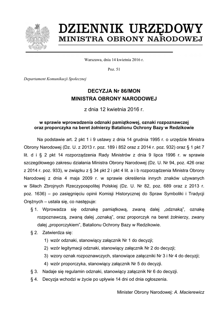Warszawa, dnia 14 kwietnia 2016 r. Poz. 51 Departament Komunikacji Społecznej DECYZJA Nr 86/MON MINISTRA OBRONY NARODOWEJ z dnia 12 kwietnia 2016 r. w sprawie wprowadzenia odznaki pamiątkowej, oznaki rozpoznawczej oraz proporczyka na beret żołnierzy Batalionu Ochrony Bazy w Redzikowie Na podstawie art. 2 pkt 1 i 9 ustawy z dnia 14 grudnia 1995 r. o urzędzie Ministra Obrony Narodowej (Dz. U. z 2013 r. poz. 189 i 852 oraz z 2014 r. poz. 932) oraz § 1 pkt 7 lit. d i § 2 pkt 14 rozporządzenia Rady Ministrów z dnia 9 lipca 1996 r. w sprawie szczegółowego zakresu działania Ministra Obrony Narodowej (Dz. U. Nr 94, poz. 426 oraz z 2014 r. poz. 933), w związku z § 34 pkt 2 i pkt 4 lit. a i b rozporządzenia Ministra Obrony Narodowej z dnia 4 maja 2009 r. w sprawie określenia innych znaków używanych w Siłach Zbrojnych Rzeczypospolitej Polskiej (Dz. U. Nr 82, poz. 689 oraz z 2013 r. poz. 1636) – po zasięgnięciu opinii Komisji Historycznej do Spraw Symboliki i Tradycji Orężnych – ustala się, co następuje: § 1. Wprowadza się odznakę pamiątkową, zwaną dalej „odznaką”, oznakę rozpoznawczą, zwaną dalej „oznaką”, oraz proporczyk na beret żołnierzy, zwany dalej „proporczykiem”, Batalionu Ochrony Bazy w Redzikowie. § 2. Zatwierdza się: 1) wzór odznaki, stanowiący załącznik Nr 1 do decyzji; 2) wzór legitymacji odznaki, stanowiący załącznik Nr 2 do decyzji; 3) wzory oznak rozpoznawczych, stanowiące załączniki Nr 3 i Nr 4 do decyzji; 4) wzór proporczyka, stanowiący załącznik Nr 5 do decyzji. § 3. Nadaje się regulamin odznaki, stanowiący załącznik Nr 6 do decyzji. § 4. Decyzja wchodzi w życie po upływie 14 dni od dnia ogłoszenia. Minister Obrony Narodowej: A. Macierewicz Załączniki do decyzji Nr 86/MON Ministra Obrony Narodowej z dnia 12 kwietnia 2016 r. (poz. 51) Załącznik Nr 1 WZÓR GRAFICZNY ODZNAKI PAMIĄTKOWEJ BATALIONU OCHRONY BAZY W REDZIKOWIE Załącznik Nr 2 WZÓR GRAFICZNY LEGITYMACJI ODZNAKI PAMIĄTKOWEJ BATALIONU OCHRONY BAZY W REDZIKOWIE BATALION OCHRONY BAZY LEGITYMACJA ODZNAKI PAMIĄTKOWEJ Panu/Pani Odznaka pamiątkowa Batalionu Ochrony Bazy jest jedną z form uhonorowania żołnierzy, pracowników wojska oraz innych osób, szczególnie zasłużonych dla jednostki. Jest ona wyrazem przynależności oraz szczególnej więzi posiadacza odznaki z batalionem. ………………………………………….. nadaję odznakę pamiątkową BATALIONU OCHRONY BAZY Rozkaz dzienny nr …... z dnia ………. r. Legitymacja nr …………. „Na głos Ojczyzny wszelkie zastanowienia, wszelkie względy niknąć powinny” Tadeusz KOŚCIUSZKO DOWÓDCA m. p. …………………… Redzikowo Załącznik Nr 3 WZÓR GRAFICZNY OZNAKI ROZPOZNAWCZEJ BATALIONU OCHRONY BAZY W REDZIKOWIE NA MUNDUR WYJŚCIOWY Załącznik Nr 4 WZÓR GRAFICZNY OZNAKI ROZPOZNAWCZEJ BATALIONU OCHRONY BAZY W REDZIKOWIE NA MUNDUR POLOWY Załącznik Nr 5 WZÓR GRAFICZNY PROPORCZYKA NA BERET BATALIONU OCHRONY BAZY W REDZIKOWIE Załącznik Nr 6 REGULAMIN ODZNAKI PAMIĄTKOWEJ BATALIONU OCHRONY BAZY W REDZIKOWIE 1. Celem wprowadzenia odznaki pamiątkowej Batalionu Ochrony Bazy, zwaną dalej „odznaką”, jest kultywowanie i popularyzowanie tradycji jednostki wojskowej oraz uhonorowanie żołnierzy i pracowników wojska za nienaganną służbę i pracę. Odznaka stanowi formę wyróżnienia oraz symbolizuje więź łączącą kadrę i pracowników wojska. 2. Odznaka Batalionu Ochrony Bazy, zwanego dalej „Batalionem”, wykonana jest na planie krzyża maltańskiego. Ramiona krzyża pokryte są biało-czerwoną emalią ze srebrzystą obwódką. Centralnie na krzyżu umieszczony jest hełm rycerski barwy srebrzystej z czerwonym pióropuszem. Pod hełmem umieszczona jest jasno srebrzysta wstęga z napisem „Batalion Ochrony Bazy”. Pomiędzy ramionami krzyża znajdują się dwa skrzyżowane miecze. 3. Prawo do otrzymania odznaki przysługuje: 1) dowódcy Batalionu z tytułu objęcia stanowiska służbowego; 2) żołnierzom po minimum rocznej, nienagannej służbie w Batalionie; 3) pracownikom wojska, po przepracowaniu w Batalionie, co najmniej dwóch lat; 4) wyjątkowo innym osobom fizycznym lub prawnym, szczególnie zasłużonym dla Batalionu. 4. Odznakę nadaje dowódca Batalionu na wniosek Komisji do Spraw Odznaki Pamiątkowej, zwanej dalej „Komisją”. 5. Dowódca Batalionu powołuje Komisję, w składzie: 1) przewodniczący - zastępca dowódcy batalionu; 2) sekretarz - szef sekcji komunikacji społecznej; 3) członkowie: - przedstawiciel korpusu oficerów; - przedstawiciel korpusu podoficerów; - przedstawiciel korpusu szeregowych; - przedstawiciel pracowników wojska. 6. Imienny skład oraz wszelkie zmiany w jej składzie ogłasza się w rozkazie dziennym dowódcy Batalionu. 7. Do obowiązków Komisji należy: 1) przyjmowanie i opiniowanie wniosków o nadanie odznaki lub pozbawienie prawa do jej posiadania; 2) przedkładanie ww. wniosków dowódcy Batalionu; 3) przygotowywanie odznak i legitymacji oraz prowadzenie ich ewidencji. 8. Opinie Komisji formułowane są na zasadzie jednomyślności. Treść opinii odnotowuje się na wniosku przedłożonym do rozpatrzenia. 9. Zajęcie stanowiska przez Komisję powinno następować nie później niż w ciągu 7 dni od dnia złożenia wniosku. Dla ważności posiedzeń Komisji zwołanych w celu rozpatrzenia przedłożonych wniosków, wymagana jest obecności co najmniej 2/3 składu Komisji. 10. Fakt nadania lub pozbawienia prawa do odznaki ogłasza się w rozkazie dziennym dowódcy Batalionu. 11. Odznakę wraz z legitymacją wręcza się na uroczystej zbiórce z okazji świąt państwowych i wojskowych oraz w innych szczególnie ważnych dla służby i pracy okolicznościach, zgodnie z wymogami ceremoniału wojskowego. 12. Odznaka nadawana jest imiennie i niedopuszczalne jest przekazywanie jej innym, darowanie lub sprzedaż osobom trzecim. 13. Zasady noszenia odznaki określają przepisy ubiorcze żołnierzy S