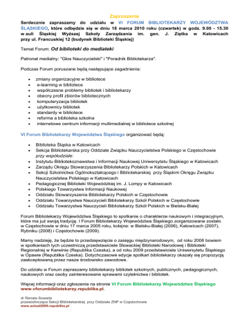 Zaproszenie Serdecznie zapraszamy do udziału w VI FORUM BIBLIOTEKARZY WOJEWÓDZTWA ŚLĄSKIEGO, które odbędzie się w dniu 18 marca 2010 roku (czwartek) w godz. 9.00 - 15.30 w auli Śląskiej Wyższej Szkoły Zarządzania im. gen. J. Ziętka w Katowicach przy ul. Francuskiej 12 (budynek Biblioteki Śląskiej) Temat Forum: Od biblioteki do mediateki Patronat medialny: "Głos Nauczycielski" i "Poradnik Bibliotekarza". Podczas Forum poruszane będą następujące zagadnienia: • • • • • • • • • zmiany organizacyjne w bibliotece e-learning w bibliotece współczesne problemy bibliotek i bibliotekarzy obecny profil zbiorów bibliotecznych komputeryzacja bibliotek użytkownicy bibliotek standardy w bibliotece reforma a biblioteka szkolna internetowe centrum informacji multimedialnej w bibliotece szkolnej VI Forum Bibliotekarzy Województwa Śląskiego organizować będą: • • • • • • • • • • Biblioteka Śląska w Katowicach Sekcja Bibliotekarska przy Oddziale Związku Nauczycielstwa Polskiego w Częstochowie przy współudziale: Instytutu Bibliotekoznawstwa i Informacji Naukowej Uniwersytetu Śląskiego w Katowicach Zarządu Okręgu Stowarzyszenia Bibliotekarzy Polskich w Katowicach Sekcji Szkolnictwa Ogólnokształcącego i Bibliotekarskiej przy Śląskim Okręgu Związku Nauczycielstwa Polskiego w Katowicach Pedagogicznej Biblioteki Wojewódzkiej im. J. Lompy w Katowicach Polskiego Towarzystwa Informacji Naukowej Oddziału Stowarzyszenia Bibliotekarzy Polskich w Częstochowie Oddziału Towarzystwa Nauczycieli Bibliotekarzy Szkół Polskich w Częstochowie Oddziału Towarzystwa Nauczycieli Bibliotekarzy Szkół Polskich w Bielsku-Białej Forum Bibliotekarzy Województwa Śląskiego to spotkanie o charakterze naukowym i integracyjnym, które ma już swoją tradycję. I Forum Bibliotekarzy Województwa Śląskiego zorganizowane zostało w Częstochowie w dniu 17 marca 2005 roku, kolejne: w Bielsku-Białej (2006), Katowicach (2007), Rybniku (2008) i Częstochowie (2009). Mamy nadzieję, że będzie to przedsięwzięcie o zasięgu międzynarodowym, od roku 2006 bowiem w spotkaniach tych uczestniczą przedstawiciele Słowackiej Biblioteki Narodowej i Biblioteki Regionalnej w Karwinie (Republika Czeska), a od roku 2009 przedstawiciele Uniwersytetu Śląskiego w Opawie (Republika Czeska). Dotychczasowe edycje spotkań bibliotekarzy okazały się propozycją zaakceptowaną przez nasze środowisko zawodowe. Do udziału w Forum zapraszamy bibliotekarzy bibliotek szkolnych, publicznych, pedagogicznych, naukowych oraz osoby zainteresowane sprawami czytelnictwa i bibliotek. Więcej informacji oraz zgłoszenia na stronie VI Forum Bibliotekarzy Województwa Śląskiego www.vforumbibliotekarzy.republika.pl. dr Renata Sowada przewodnicząca Sekcji Bibliotekarskiej przy Oddziale ZNP w Częstochowie www.actual2005.republika.pl