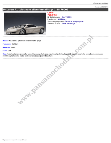 Informacje o produkcie Utworzono 03-03-2017 McLaren F1 (platinum silver/metallic gr 1:18 76003 Cena : 759,00 zł .p l Nr katalogowy : AA-76003 Producent : AUTOart Stan magazynowy : brak w magazynie Średnia ocena : brak recenzji Nazwa: McLaren F1 (platinum silver/metallic grey) om Producent: AUTOart Numer id: 76003 .c Skala: 1/18 w w w .p an sa m oc ho dz ik Opis: Model wykonany z metalu, w modelu mamy otwierane drzwi maske silnika, bagażnik oraz skrętne koła, w środku mamy mamy miekkie wykończenia, model pochodzi z najlepszej serii Signature Wygenerowano w programie www.oscGold.com
