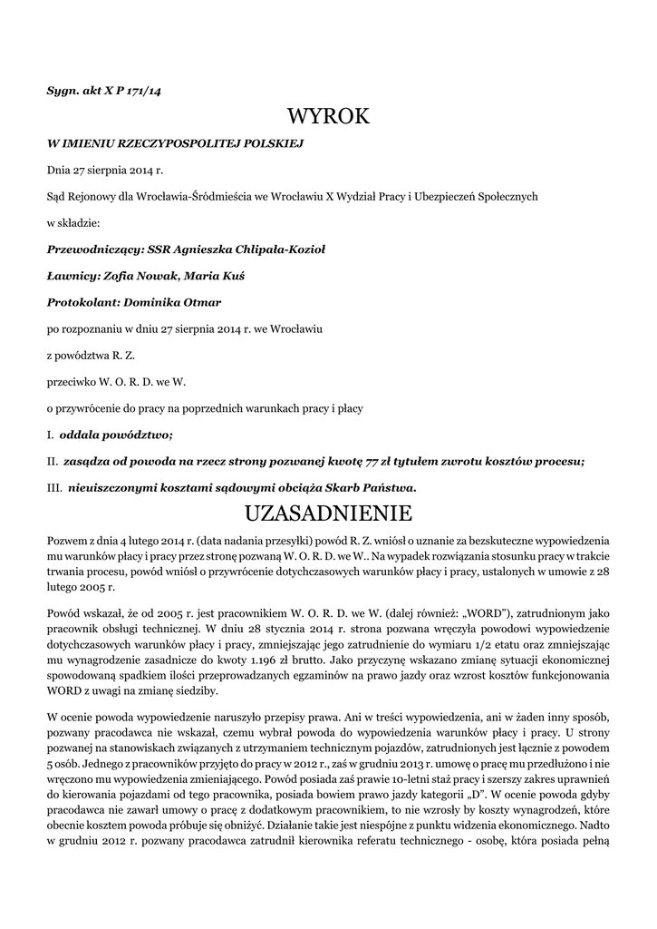 Sygn. akt X P 171/14 WYROK W IMIENIU RZECZYPOSPOLITEJ POLSKIEJ Dnia 27 sierpnia 2014 r. Sąd Rejonowy dla Wrocławia-Śródmieścia we Wrocławiu X Wydział Pracy i Ubezpieczeń Społecznych w składzie: Przewodniczący: SSR Agnieszka Chlipała-Kozioł Ławnicy: Zofia Nowak, Maria Kuś Protokolant: Dominika Otmar po rozpoznaniu w dniu 27 sierpnia 2014 r. we Wrocławiu z powództwa R. Z. przeciwko W. O. R. D. we W. o przywrócenie do pracy na poprzednich warunkach pracy i płacy I. oddala powództwo; II. zasądza od powoda na rzecz strony pozwanej kwotę 77 zł tytułem zwrotu kosztów procesu; III. nieuiszczonymi kosztami sądowymi obciąża Skarb Państwa. UZASADNIENIE Pozwem z dnia 4 lutego 2014 r. (data nadania przesyłki) powód R. Z. wniósł o uznanie za bezskuteczne wypowiedzenia mu warunków płacy i pracy przez stronę pozwaną W. O. R. D. we W.. Na wypadek rozwiązania stosunku pracy w trakcie trwania procesu, powód wniósł o przywrócenie dotychczasowych warunków płacy i pracy, ustalonych w umowie z 28 lutego 2005 r. Powód wskazał, że od 2005 r. jest pracownikiem W. O. R. D. we W. (dalej również: „WORD”), zatrudnionym jako pracownik obsługi technicznej. W dniu 28 stycznia 2014 r. strona pozwana wręczyła powodowi wypowiedzenie dotychczasowych warunków płacy i pracy, zmniejszając jego zatrudnienie do wymiaru 1/2 etatu oraz zmniejszając mu wynagrodzenie zasadnicze do kwoty 1.196 zł brutto. Jako przyczynę wskazano zmianę sytuacji ekonomicznej spowodowaną spadkiem ilości przeprowadzanych egzaminów na prawo jazdy oraz wzrost kosztów funkcjonowania WORD z uwagi na zmianę siedziby. W ocenie powoda wypowiedzenie naruszyło przepisy prawa. Ani w treści wypowiedzenia, ani w żaden inny sposób, pozwany pracodawca nie wskazał, czemu wybrał powoda do wypowiedzenia warunków płacy i pracy. U strony pozwanej na stanowiskach związanych z utrzymaniem technicznym pojazdów, zatrudnionych jest łącznie z powodem 5 osób. Jednego z pracowników przyjęto do pracy w 2012 r., zaś w grudniu 2013 r. umowę o pracę mu przedłużono i nie wręczono mu wypowiedzenia zmieniającego. Powód posiada zaś prawie 10-letni staż pracy i szerszy zakres uprawnień do kierowania pojazdami od tego pracownika, posiada bowiem prawo jazdy kategorii „D”. W ocenie powoda gdyby pracodawca nie zawarł umowy o pracę z dodatkowym pracownikiem, to nie wzrosły by koszty wynagrodzeń, które obecnie kosztem powoda próbuje się obniżyć. Działanie takie jest niespójne z punktu widzenia ekonomicznego. Nadto w grudniu 2012 r. pozwany pracodawca zatrudnił kierownika referatu technicznego - osobę, która posiada pełną emeryturę wojskową. Tymczasem powód nie ma żadnych innych źródeł utrzymania. Powód wskazał również, że w tym samym czasie pracodawca obniżył czas pracy i wynagrodzenie także wielu innym pracownikom, jednak ograniczając ich etaty do 3/4. Powód zarzucił, że pozwany pracodawca nie wyjaśnił kryteriów doboru pracowników wybranych do redukcji warunków zatrudnienia, tymczasem przyczyny powinny być prawdziwe, rzeczywiste i jasno wskazane w oświadczeniu o wypowiedzeniu warunków pracy i płacy. Ocena zasadności wypowiedzenia winna uwzględniać prawidłowość kryteriów doboru pracowników do redukcji. Te kryteria powinny być obiektywne. Pracodawca powinien przy tym uwzględniać kryteria takie jak: wykształcenie, staż pracy, nienaganny przebieg pracy jak też sytuację majątkową i rodzinną pracodawcy. U pozwanego pracodawcy zatrudnieni są pracownicy z mniejszym stażem pracy, mniejszym doświadczeniem i niższymi kwalifikacjami. Nadto powód jest żywicielem trzyosobowej rodziny. Powód po zmniejszeniu wynagrodzenia będzie zmuszony poszukiwać nowego zatrudnienia bowiem nie utrzyma rodziny za ok. 800 zł miesięcznie. Stąd też wypowiedzenie należy uznać również za naruszające zasady współżycia społecznego. W pisemnej odpowiedzi na pozew z dnia 31 marca 2014 r. (data stempla pocztowego, k. 17) strona pozwana W. O. R. D. we W. wniosła o oddalenie powództwa oraz zasądzenie kosztów procesu według norm przepisanych. W ocenie strony pozwanej wypowiedzenie zmieniające nie zostało dokonane z naruszeniem przepisów prawa. Przyczyną zmiany warunków zatrudnienia były względy ekonomiczne wywołane spadkiem liczby prowadzonych egzaminów oraz wzrostem kosztów utrzymania siedziby WORD. Wskazanie kryteriów doboru pracowników do zwolnienia nie wchodzi w zakres dyspozycji przepisu nakazującego wskazanie w treści oświadczenia pracodawcy o wypowiedzeniu warunków pracy i płacy przyczyn tego wypowiedzenia. Uzasadnienie wypowiedzenia było zgodne z przepisami prawa pracy. Nie ma mowy o naruszeniu przepisów ustawy o szczególnych zasadach rozwiązywania z pracownikami stosunków pracy z przyczyn niedotyczących pracowników, bowiem strona pozwana nie dokonywała zwolnień w ilości kwalifikującej je pod przepisy tejże ustawy. Pozwana podkreśliła, że dobierając pracowników, którym miały być wypowiadane warunki zatrudnienia, uwzględniano ich przydatność do pracy, jakość świadczonej pracy, dotychczasowy przebieg pracy, kryterium posiadanych kwalifikacji oraz dyspozycyjności. Podejmując decyzję o zatrudnieniu kierownika referatu jako osoby spoza dotychczasowych pracowników pracodawca miał na uwadze fakt, że żaden z nich nie miał ku temu wystarczających kwalifikacji. Staż pracy nie jest jedynym kryterium doboru pracowników. Pracodawca przyjął kryteria opierające się na ocenie ich kompetencji. Strona pozwana wskazała, że bezpośredni przełożeni powoda negatywnie ocenili jego pracę na dotychczasowym stanowisku. Nadto powód jako jedyny ma przeciwwskazania do pracy na wysokości ponad 3 metrów i może wykonywać prac na wyższych wysokościach. W piśmie procesowym z dnia 30 kwietnia 2014 r. (data stempla pocztowego, k. 60) powód podtrzymał dotychczasowe twierdzenia. Nadto wskazał, iż uzasadnienie w