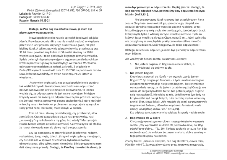 4. po Trójcy,1. 7. 2011, Niwy Pieśni: (Śpiewnik Ewangelicki) 307/1-4, 833, 726, 307/5-8, 318; A: 59 Lekcja: do Rzymian 12,17-21 Ewangelia: Łukasz 6,36-42 Kazanie: Genesis 50,15-21 Dlatego, że Pan Bóg ma ostatnie słowo, ja mam być pierwszym w odpuszczeniu. Prawdopodobnie nikt nas nie sprzedał do niewoli tak jako Józefa. Prawdopodobnie nikt z nas nie musiał siedzieć w więzieniu przez wiele lat z powodu krzywego oskarżenia o gwałt, tak jako biblijny Józef. A takie rzeczy nie zdarzały się tylko przed naszą erą. 31 lat temu pewien Larry Fuller z USA został skazany na 50 lat więzienia za gwałt, i to na podstawie błędnego zeznania świadka. Sędzia uwierzył nieprzekonywującym argumentom śledczych i po krótkim procesie sądowym posłał byłego weterana z Wietnamu, odznaczonego medalem za zasługi, za kratki. Z więzienia w Dallas/TX wyszedł na wolność dnia 31.10.2006 na podstawie testów DNA, które udownodniły, że był on niewinny. Po 25 latach w więzieniu... Aczkolwiek większość z nas prawdopodobnie nie przeżyła tak wielkich krzywd i teoretycznie przychodzi nam odpuszczać naszym winowajcom o wiele mniejsze przewinienia, to jednak wydaje się, że odpuszczenie nie jest wcale łatwiejsze. Mniejsze krzywdy wcale nie znaczą, że odpuszczenie będzie prostsze. Wydaje się, że tutaj można zastosować pewne stwierdzenie,( które ktoś użył w trochę innym kontekście): problemem zazwyczaj nie są wysokie skały przed nami, lecz raczej małe kamyki w butach. Czas od czasu stoimy przed decyzją, czy przebaczyć, albo zemścić się. Czas od czasu zdarza się, że nasi przeciwnicy, nasi „winowajcy“ są na kolanach a my górą. I co wtedy? Marzymy jak Hrabia Monte Christo o słodkiej zemście? A zemsta bywa tak słodka, że nawet nie wpada nam do głowy myśl o odpuszczeniu. Czy już doznajemy ze strony bliźnich (dosłownie: rodziny, rodzeństwa, żony, męża, dzieci...) krzywd większych czy mniejszych, czy oszukali nas w sprawie dziedzictwa, byli nam niewierni, obmawiają nas, albo tylko z nami nie mówią, Biblia przypomina nam dziś starą znaną prawdę: Dlatego, że Pan Bóg ma ostatnie słowo, ja mam być pierwszym w odpuszczeniu. I lepiej jeszcze: dlatego, że Bóg pierwej odpuścił NAM, powinniśmy i my odpuszczać naszym bliźnim (Kol 3,13: ). Nie bez przyczyny Józef nazwany jest przedobrazem Pana Jezusa Chrystusa: znienawidzili go, sprzedano go, cierpiał, ale odpuścił zbrodniarzom a Bóg wszystko zmienił na dobre. W tej historii odgrywamy rolę złych, nienawidzących, zbrodniczych braci, którzy myślą tylko o własnej korzyści i słodkiej zemście. Tych, za których Jezus modli się z krzyża: Ojcze, odpuść im... Jeżeli tych słów nie przyjęliśmy za swe, będzie praktycznie niemożliwe mówić o odpuszczeniu bliźnim. Spójrz najpierw, ile tobie odpuszczono! Dlatego, że Jezus mi odpuścił, ja mam być pierwszy w odpuszczaniu mym bliźnim. Ale wróćmy do historii Józefa. Ta uczy nas 3 rzeczy: 1. Nie jestem Bogiem, 2. Bóg zmienia złe w dobre, 3. Odwdzięczaj się dobrym za złe. 1. Nie jestem Bogiem Kiedy bracia przyszli do Józefa – on wyznał: „czy ja jestem Bogiem?“ Był drugim po faraonie – a tych uważano za bogów, ale pomimo to wyznał: ja nie jestem Bogiem. To stwierdzenie oznacza dwie rzeczy: ja nie jestem ostatnim sędzią! Oraz: ja nie wiem, do czego było dobre to złe. Nie potrafię objąć i osądzić całą rzeczywistość. Nie widzę za róg. Jeżeli nawet Syn Boży na krzyżu oddał sąd do rąk Bożych, o ile bardziej my tak winniśmy czynić! (Por. słowa lekcji: „Nie mścijcie się sami, ale pozostawcie to gniewowi Bożemu, albowiem napisano: Pomsta do mnie należy, Ja odpłacę, mówi Pan.” Rz 12,19). Kto odpłaca sam, sprawia tylko większą krzywdę – także sobie. 2. Bóg zmienia złe w dobre Chyba najpiękniejszym wyrokiem naszego tekstu to wyznanie Józefa: „Wy wprawdzie knuliście zło przeciwko mnie, ale Bóg obrócił to w dobro... “ (v. 20). Takiego zaufania w to, że Pan Bóg może obracać zło w dobro, że z nami ma tylko dobre zamiary – tego potrzebujemy na codzień. Znamy frazes: „człowiek obmyślo, Pan Bóg skreślo” („člověk míní, Pán Bůh mění“). Zazwyczaj wyrażamy przez to pewną rezygnację, Z życzeniem bogatego użytku duchowego Martin Piętak, tel. +420-737 775 901, [email protected], niwy.cz pojednanie z tym, że nasze piękne plany nie doszły do skutku. Naprz. urlop na Mallorce, kiedy dzień przed odlotem zachorowało dziecko... Ale ta prawda funkcjonuje także w odwrotnym kierunku: Nasze pofiderne myśli i plany, gorzkości i żale, to, co uważamy za stracone, beznadziejne – to wszystko Bóg może skreślić – i zmienić w dobre. Pan nie skreśla tylko pięknych rzeczy, żeby nam psuć radość, ale skreśla rezygnację, żeby nam radość dać. Mnie się widzi, że naprawa stosunków w rodzinie czy pracy to rzecz niemożliwa. Ale Pan Bóg zmienia! Trzymajmy się tego – mocniej niż naszych żalów do złych ludzi! Koncentracja na krzywdę prowadzi do użalania się nad sobą. Koncentracja na dobrego Boga prowadzi do użalania się nad złymi. Tak na marginesie: wiecie, co powiedział ów Larry Fuller, kiedy po 25 latach wychodził z więzienia? „Nie odczuwam żadnego zgorzknienia. Takie już życie. Moja wiara wystawiona była na próbę, ale wytrwałem.“. I ze zużytymi Bibliami pod pachą wyszedł. Jego sprawiedliwością był Bóg. 3. Odpłacaj dobrym za złe Prawdziwe odpuszczenie, to nie tylko tolerancja, to więcej, niż tylko dać spokój, nie wracać tym samym – ale odpłacać DOBRYM. Braciom, (którzy zresztą znów kłamali!) Józef mówi: „Nie bójcie się (2x) oraz: „zatroszczę się o was i o wasze dzieci”. Co dobrego możesz zaoferować swoim winowajcom i ich dzieciom? A propo Józef: poprzez jego bolesne doświadczenia Bóg uratował cały Egipt i jego sąsiadów. Ciekaw jestem, jakie błogosławieństwo 