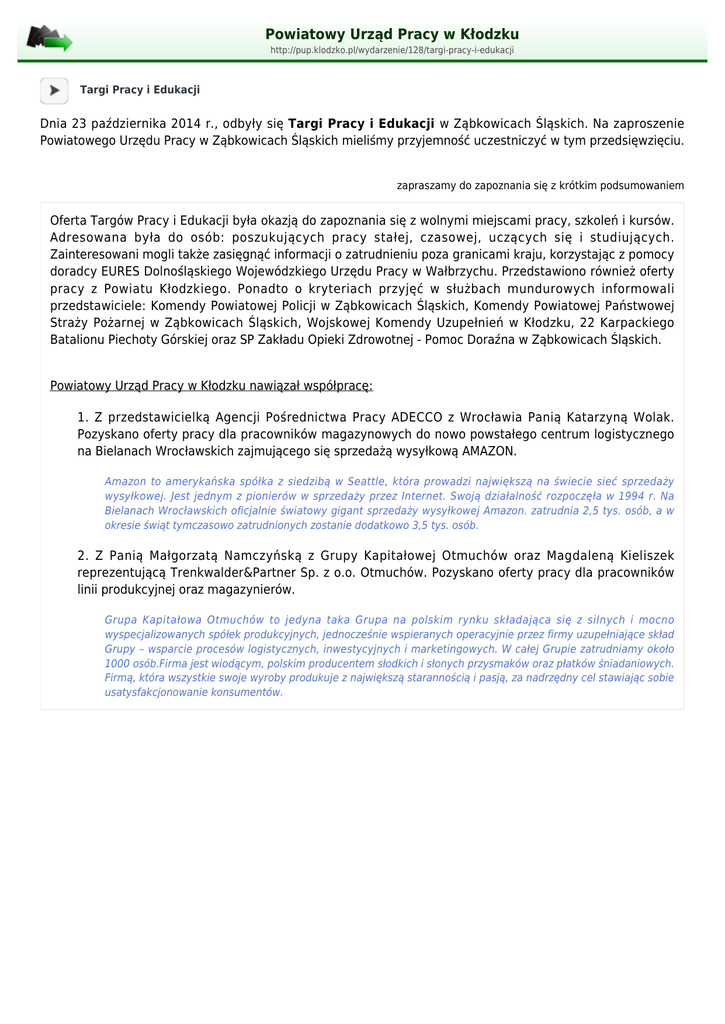 Powiatowy Urząd Pracy w Kłodzku http://pup.klodzko.pl/wydarzenie/128/targi-pracy-i-edukacji Targi Pracy i Edukacji Dnia 23 października 2014 r., odbyły się Targi Pracy i Edukacji w Ząbkowicach Śląskich. Na zaproszenie Powiatowego Urzędu Pracy w Ząbkowicach Śląskich mieliśmy przyjemność uczestniczyć w tym przedsięwzięciu. zapraszamy do zapoznania się z krótkim podsumowaniem Oferta Targów Pracy i Edukacji była okazją do zapoznania się z wolnymi miejscami pracy, szkoleń i kursów. Adresowana była do osób: poszukujących pracy stałej, czasowej, uczących się i studiujących. Zainteresowani mogli także zasięgnąć informacji o zatrudnieniu poza granicami kraju, korzystając z pomocy doradcy EURES Dolnośląskiego Wojewódzkiego Urzędu Pracy w Wałbrzychu. Przedstawiono również oferty pracy z Powiatu Kłodzkiego. Ponadto o kryteriach przyjęć w służbach mundurowych informowali przedstawiciele: Komendy Powiatowej Policji w Ząbkowicach Śląskich, Komendy Powiatowej Państwowej Straży Pożarnej w Ząbkowicach Śląskich, Wojskowej Komendy Uzupełnień w Kłodzku, 22 Karpackiego Batalionu Piechoty Górskiej oraz SP Zakładu Opieki Zdrowotnej - Pomoc Doraźna w Ząbkowicach Śląskich. Powiatowy Urząd Pracy w Kłodzku nawiązał współpracę: 1. Z przedstawicielką Agencji Pośrednictwa Pracy ADECCO z Wrocławia Panią Katarzyną Wolak. Pozyskano oferty pracy dla pracowników magazynowych do nowo powstałego centrum logistycznego na Bielanach Wrocławskich zajmującego się sprzedażą wysyłkową AMAZON. Amazon to amerykańska spółka z siedzibą w Seattle, która prowadzi największą na świecie sieć sprzedaży wysyłkowej. Jest jednym z pionierów w sprzedaży przez Internet. Swoją działalność rozpoczęła w 1994 r. Na Bielanach Wrocławskich oficjalnie światowy gigant sprzedaży wysyłkowej Amazon. zatrudnia 2,5 tys. osób, a w okresie świąt tymczasowo zatrudnionych zostanie dodatkowo 3,5 tys. osób. 2. Z Panią Małgorzatą Namczyńską z Grupy Kapitałowej Otmuchów oraz Magdaleną Kieliszek reprezentującą Trenkwalder&Partner Sp. z o.o. Otmuchów. Pozyskano oferty pracy dla pracowników linii produkcyjnej oraz magazynierów. Grupa Kapitałowa Otmuchów to jedyna taka Grupa na polskim rynku składająca się z silnych i mocno wyspecjalizowanych spółek produkcyjnych, jednocześnie wspieranych operacyjnie przez firmy uzupełniające skład Grupy – wsparcie procesów logistycznych, inwestycyjnych i marketingowych. W całej Grupie zatrudniamy około 1000 osób.Firma jest wiodącym, polskim producentem słodkich i słonych przysmaków oraz płatków śniadaniowych. Firmą, która wszystkie swoje wyroby produkuje z największą starannością i pasją, za nadrzędny cel stawiając sobie usatysfakcjonowanie konsumentów.