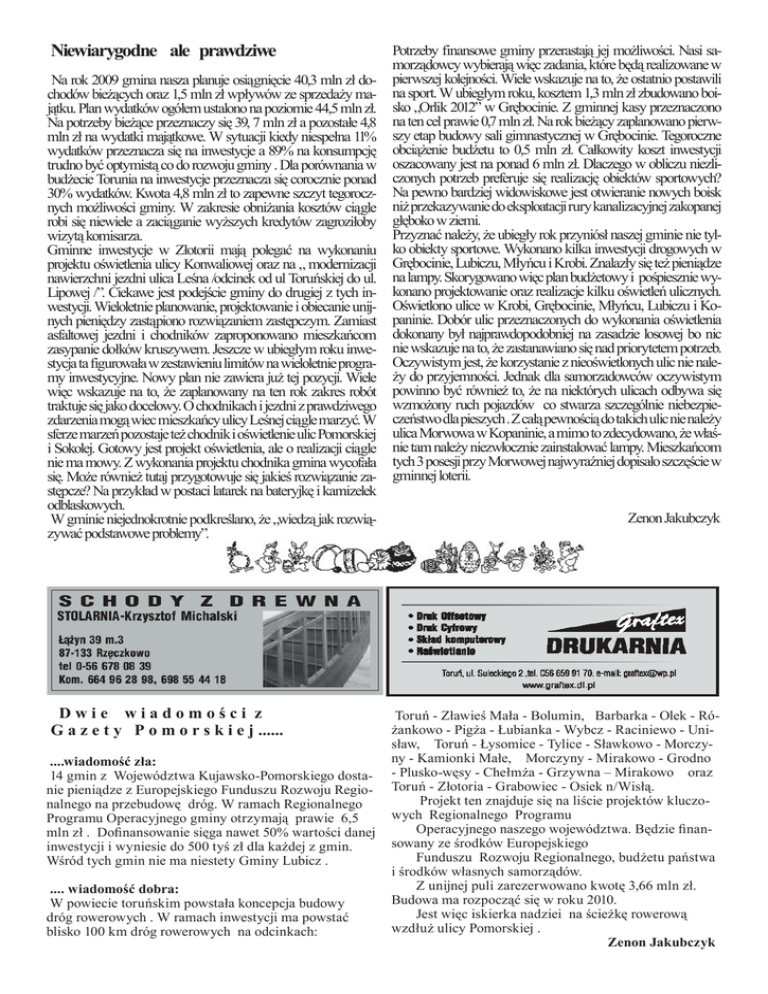Niewiarygodne ale prawdziwe Potrzeby finansowe gminy przerastają jej możliwości. Nasi samorządowcy wybierają więc zadania, które będą realizowane w Na rok 2009 gmina nasza planuje osiągnięcie 40,3 mln zł do- pierwszej kolejności. Wiele wskazuje na to, że ostatnio postawili chodów bieżących oraz 1,5 mln zł wpływów ze sprzedaży ma- na sport. W ubiegłym roku, kosztem 1,3 mln zł zbudowano boijątku. Plan wydatków ogółem ustalono na poziomie 44,5 mln zł. sko „Orlik 2012” w Grębocinie. Z gminnej kasy przeznaczono Na potrzeby bieżące przeznaczy się 39, 7 mln zł a pozostałe 4,8 na ten cel prawie 0,7 mln zł. Na rok bieżący zaplanowano pierwmln zł na wydatki majątkowe. W sytuacji kiedy niespełna 11% szy etap budowy sali gimnastycznej w Grębocinie. Tegoroczne wydatków przeznacza się na inwestycje a 89% na konsumpcję obciążenie budżetu to 0,5 mln zł. Całkowity koszt inwestycji trudno być optymistą co do rozwoju gminy . Dla porównania w oszacowany jest na ponad 6 mln zł. Dlaczego w obliczu niezlibudżecie Torunia na inwestycje przeznacza się corocznie ponad czonych potrzeb preferuje się realizację obiektów sportowych? 30% wydatków. Kwota 4,8 mln zł to zapewne szczyt tegorocz- Na pewno bardziej widowiskowe jest otwieranie nowych boisk nych możliwości gminy. W zakresie obniżania kosztów ciągle niż przekazywanie do eksploatacji rury kanalizacyjnej zakopanej robi się niewiele a zaciąganie wyższych kredytów zagroziłoby głęboko w ziemi. Przyznać należy, że ubiegły rok przyniósł naszej gminie nie tylwizytą komisarza. Gminne inwestycje w Złotorii mają polegać na wykonaniu ko obiekty sportowe. Wykonano kilka inwestycji drogowych w projektu oświetlenia ulicy Konwaliowej oraz na „ modernizacji Grębocinie, Lubiczu, Młyńcu i Krobi. Znalazły się też pieniądze nawierzchni jezdni ulica Leśna /odcinek od ul Toruńskiej do ul. na lampy. Skorygowano więc plan budżetowy i pośpiesznie wyLipowej /”. Ciekawe jest podejście gminy do drugiej z tych in- konano projektowanie oraz realizacje kilku oświetleń ulicznych. westycji. Wieloletnie planowanie, projektowanie i obiecanie unij- Oświetlono ulice w Krobi, Grębocinie, Młyńcu, Lubiczu i Konych pieniędzy zastąpiono rozwiązaniem zastępczym. Zamiast paninie. Dobór ulic przeznaczonych do wykonania oświetlenia asfaltowej jezdni i chodników zaproponowano mieszkańcom dokonany był najprawdopodobniej na zasadzie losowej bo nic zasypanie dołków kruszywem. Jeszcze w ubiegłym roku inwe- nie wskazuje na to, że zastanawiano się nad priorytetem potrzeb. stycja ta figurowała w zestawieniu limitów na wieloletnie progra- Oczywistym jest, że korzystanie z nieoświetlonych ulic nie nalemy inwestycyjne. Nowy plan nie zawiera już tej pozycji. Wiele ży do przyjemności. Jednak dla samorzadowców oczywistym więc wskazuje na to, że zaplanowany na ten rok zakres robót powinno być również to, że na niektórych ulicach odbywa się traktuje się jako docelowy. O chodnikach i jezdni z prawdziwego wzmożony ruch pojazdów co stwarza szczególnie niebezpiezdarzenia mogą wiec mieszkańcy ulicy Leśnej ciągle marzyć. W czeństwo dla pieszych . Z całą pewnością do takich ulic nie należy sferze marzeń pozostaje też chodnik i oświetlenie ulic Pomorskiej ulica Morwowa w Kopaninie, a mimo to zdecydowano, że właśi Sokolej. Gotowy jest projekt oświetlenia, ale o realizacji ciągle nie tam należy niezwłocznie zainstalować lampy. Mieszkańcom nie ma mowy. Z wykonania projektu chodnika gmina wycofała tych 3 posesji przy Morwowej najwyraźniej dopisało szczęście w się. Może również tutaj przygotowuje się jakieś rozwiązanie za- gminnej loterii. stępcze? Na przykład w postaci latarek na bateryjkę i kamizelek odblaskowych. Zenon Jakubczyk W gminie niejednokrotnie podkreślano, że „wiedzą jak rozwiązywać podstawowe problemy”. Dwie wiadomości z G a z e t y P o m o r s k i e j ...... ....wiadomość zła: 14 gmin z Województwa Kujawsko-Pomorskiego dostanie pieniądze z Europejskiego Funduszu Rozwoju Regionalnego na przebudowę dróg. W ramach Regionalnego Programu Operacyjnego gminy otrzymają prawie 6,5 mln zł . Dofinansowanie sięga nawet 50% wartości danej inwestycji i wyniesie do 500 tyś zł dla każdej z gmin. Wśród tych gmin nie ma niestety Gminy Lubicz . .... wiadomość dobra: W powiecie toruńskim powstała koncepcja budowy dróg rowerowych . W ramach inwestycji ma powstać blisko 100 km dróg rowerowych na odcinkach: Toruń - Zławieś Mała - Bolumin, Barbarka - Olek - Różankowo - Pigża - Łubianka - Wybcz - Raciniewo - Unisław, Toruń - Łysomice - Tylice - Sławkowo - Morczyny - Kamionki Małe, Morczyny - Mirakowo - Grodno - Plusko-węsy - Chełmża - Grzywna – Mirakowo oraz Toruń - Złotoria - Grabowiec - Osiek n/Wisłą. Projekt ten znajduje się na liście projektów kluczowych Regionalnego Programu Operacyjnego naszego województwa. Będzie finansowany ze środków Europejskiego Funduszu Rozwoju Regionalnego, budżetu państwa i środków własnych samorządów. Z unijnej puli zarezerwowano kwotę 3,66 mln zł. Budowa ma rozpocząć się w roku 2010. Jest więc iskierka nadziei na ścieżkę rowerową wzdłuż ulicy Pomorskiej . Zenon Jakubczyk Godziny otwarcia 10:00 - 17:00 wynikają z potrzeby obsługi mieszkańców pracujących w różnych godzinach. Z uzyskanych informacji z Oddziału Rejonowego Poczty w Toruniu wynika, że obciążenie placówki w Złotorii jest w normie i obecnie nie planuje się żadnych zmian organizacyjnych. Starania Rady Sołeckiej o przywrócenie Urzędu Pocztowego w Złotorii czynione były od chwili jego likwidacji w 2003r. Uporczywie składaliśmy wnioski o przywrócenie placówki, która obsługiwała nie tylko mieszkańców Złotorii, ale i miejscowości Grabowiec, Kopanino, Nowa Wieś. Wyraziliśmy sprzeciw wobec zamiaru sprzedaży przez gminę budynku, w którym przez ponad 50 lat funkcjonow
