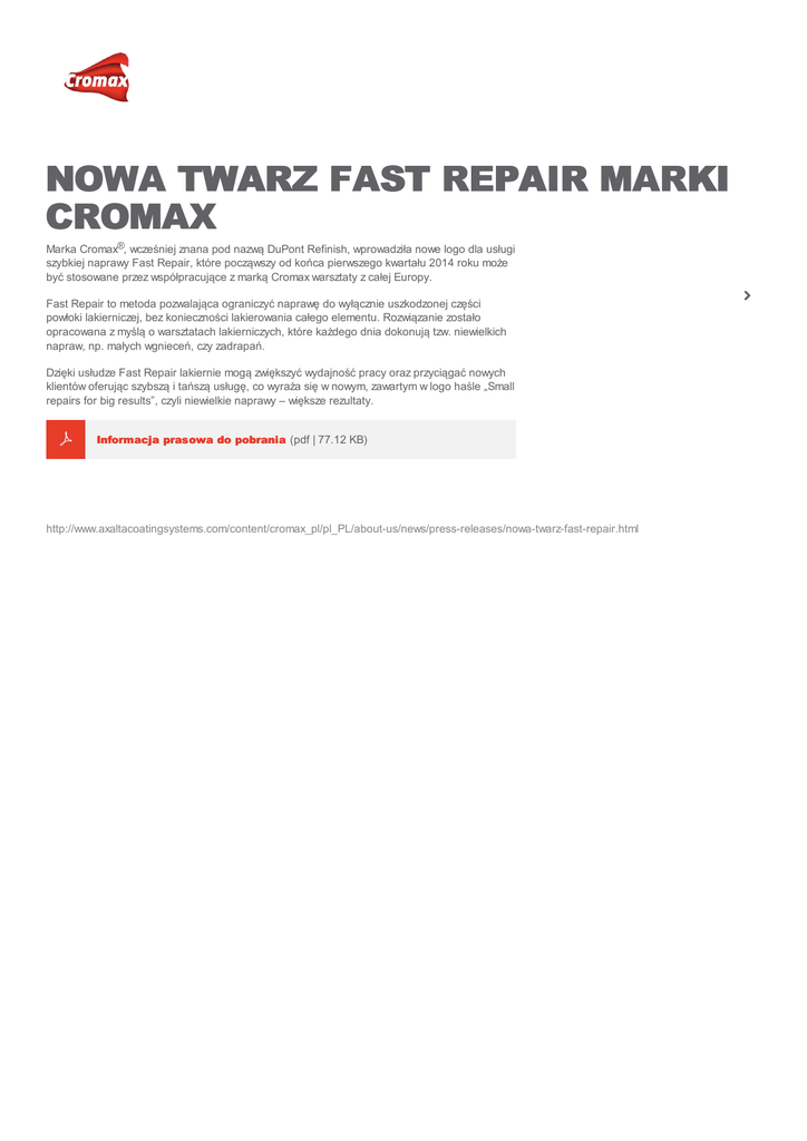 NOWA TWARZ FAST REPAIR MARKI CROMAX Marka Cromax®, wcześniej znana pod nazwą DuPont Refinish, wprowadziła nowe logo dla usługi szybkiej naprawy Fast Repair, które począwszy od końca pierwszego kwartału 2014 roku może być stosowane przez współpracujące z marką Cromax warsztaty z całej Europy. Fast Repair to metoda pozwalająca ograniczyć naprawę do wyłącznie uszkodzonej części powłoki lakierniczej, bez konieczności lakierowania całego elementu. Rozwiązanie zostało opracowana z myślą o warsztatach lakierniczych, które każdego dnia dokonują tzw. niewielkich napraw, np. małych wgnieceń, czy zadrapań. Dzięki usłudze Fast Repair lakiernie mogą zwiększyć wydajność pracy oraz przyciągać nowych klientów oferując szybszą i tańszą usługę, co wyraża się w nowym, zawartym w logo haśle „Small repairs for big results”, czyli niewielkie naprawy – większe rezultaty. f Informacja prasowa do pobrania (pdf | 77.12 KB) http://www.axaltacoatingsystems.com/content/cromax_pl/pl_PL/about-us/news/press-releases/nowa-twarz-fast-repair.html u
