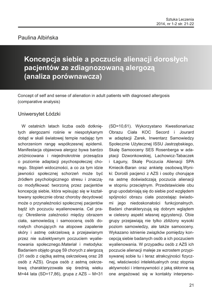 Sztuka Leczenia 2014, nr 1-2 str. 21-22 Paulina Albińska Koncepcja siebie a poczucie alienacji dorosłych pacjentów ze zdiagnozowaną alergozą (analiza porównawcza) Concept of self and sense of alienation in adult patients with diagnosed allergosis (comparative analysis) Uniwersytet Łódzki W ostatnich latach liczba osób dotkniętych alergozami rośnie w niespotykanym dotąd w skali światowej tempie nadając tym schorzeniom rangę współczesnej epidemii. Manifestacja objawowa alergoz bywa bardzo zróżnicowana i niejednokrotnie przesądza o poziomie adaptacji psychospołeczej chorego. Stopień widoczności, a co za tym idzie jawności społecznej schorzeń może być źródłem psychologicznego stresu i znacząco modyfikować tworzoną przez pacjentów koncepcję siebie, która wpisując się w kształtowany społecznie obraz choroby decydować może o przynależności społecznej pacjentów bądź ich poczuciu wyalienowania. Cel pracy: Określenie zależności między obrazem ciała, samowiedzą i samooceną osób dorosłych chorujących na atopowe zapalenie skóry i astmę oskrzelową a przejawianym przez nie subiektywnym poczuciem wyalienowania społecznego.Materiał i metodyka: Badaniem objęto grupę 59 chorych z alergozą (31 osób z ciężką astmą oskrzelową oraz 28 osób z AZS). Grupa osób z astmą oskrzelową charakteryzowała się średnią wieku M=44 lata (SD=17,86), grupa z AZS – M=31 (SD=10,61). Wykorzystano Kwestionariusz Obrazu Ciała KOC Secord i Jourard w adaptacji Zarek, Inwentarz Samowiedzy Społecznie Użytecznej ISSU Jastrzębskiego, Skalę Samooceny SES Rosenberga w adaptacji Dzwonkowskiej, Lachowicz-Tabaczek i Łaguny, Skalę Poczucia Alienacji SPA Kmiecik-Baran oraz ankietę osobową.Wyniki: Dorośli pacjenci z AZS i osoby chorujące na astmę doświadczają poczucia alienacji w stopniu przeciętnym. Przedstawiciele obu grup upodabniają się do siebie pod względem spójności obrazu ciała pozostając świadomi jego niedoskonałości funkcjonalnych. Badani charakteryzują się dobrym wglądem w cielesny aspekt własnej egzystencji. Obie grupy przejawiają nie tylko zbliżony wysoki poziom samowiedzy, ale także samooceny. Wykazano istnienie związków pomiędzy koncepcją siebie badanych osób a ich poczuciem wyalienowania. W przypadku osób z AZS ich poczucie alienacji maleje ze wzrostem przypisywanej sobie tu i teraz atrakcyjności fizycznej, właściwości intelektualnych oraz stopnia aktywności i intensywności z jaką skłonne są one angażować się w kontakty interperso21 Koncepcja siebie a poczucie alienacji dorosłych pacjentów ze zdiagnozowaną alergozą (analiza porównawcza) nalne i działania na przedmiotach, wzrasta natomiast ze wzrostem przypisywanej sobie samooceny. Osoby z astmą baczniejszą uwagę zwracają na własne właściwości intelektualne. Ich wysoki poziom zapewnia minimalizację poczucia alienacji. [email protected] 22