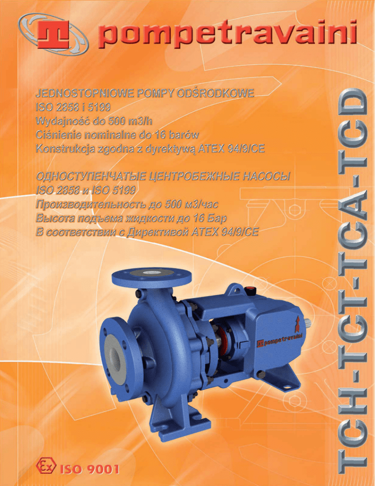 TCH-TCT-TCA-TCD Jednostopniowe pompy odśrodkowe Одноступенчатый центробежный насос серия TCH Nowe pompy typoszeregu TCH oraz pochodne należące do tej samej rodziny, odzwierciedlają wytyczne projektowe zawarte w normie ISO 5199 class II: norma ta przewiduje wprowadzenie nowych, surowych standardów produkcyjnych nadających się do zastosowania do pomp produkowanych zgodnie z normą ISO 2858/DIN 24256 w celu otrzymania idealnego produktu do najcięższych zastosowań, szczególnie w przemyśle petrochemicznym, podążając za przykładem standardów API. Konstrukcja pomp jest także rezultatem ciągłych badań, rozwoju i rozległego doświadczenia zdobytego przez wiele lat z pompami typoszeregu MCU-CH zastosowanymi w wielu instalacjach i dziedzinach. Ostatecznie, wierzymy że pompy te odzwierciedlają opinie i sugestie otrzymane od klientów i użytkowników. Pompy typoszeregu TCH są produktem w najwyższym stopniu ulepszonym dla poprawy: • Wytrzymałości • Niezawodności • Trwałości • Sprawności • Bezpieczeństwa • Kosztów użytkowania Program produkcyjny zawiera trzy rozmiary ram nośnych typu „back pull-out” obudowa pompy jest typu spiralnego z osiowym kołnierzem (przyłączem) ssawnym, wirnik typu promieniowego overhang mounting [z mocowaniem jednostronnym]. Cała nasza produkcja jest kontrolowana przez certyfikowany system kontroli jakości zgodny z normą ISO 9001:2000. • • • • • • • • • Informacje techniczne typoszereg Техническая информация Насосы новой серии ТСН и ее производные являются результатом применения норматив ISO 5199 класс II: эти нормативы предусматривают введение более строгих требований к производству насосов, ранее подпадавших под нормативы ISO 2858/DIN 24256, чтобы получить идеальный насос для промышленного использования, особенно в нефтехимической отрасли, следуя нормативам АРІ. Эти насосы являются также результатом постоянного научного поиска и долгого опыта использования в различнейших областях серии MCU-CH. Здесь также, не в последнюю очередь, были учтены драгоценное мнение и отзывы потребителей. В результате появился насос кардинально усовершенствованный по таким параметрам: - Прочность конструкции - Срок эксплуатации - Безопасность Конструкция предусматривает 3 разных размера рамы подшипника (типа back pull-out). Корпус насоса – спирального типа с аксиальным всасом, импеллер – радиальный, консольного типа. Вся наша продукция сертифицирована согласно норматив качества ISO 9001:2000. - Zdolność pompowania czystych i lekko zanieczyszczonych płynów, gorących, przegrzanych, kwaśnych i żrących w przemyśle chemicznym, petrochemicznym, farmaceutycznym, żywnościowym, papierniczym, hutniczym, tekstylnym, środowiskowym i innych. Wydajność do 500 m3/h i ciśnienie do 16 barów. Wymiary gabarytowe i wykonanie są zgodne z normą ISO 2858/DIN 24256. Szeroki zakres materiałów konstrukcyjnych, od żeliwa do hastelloy (stop niklowo – molibdenowy). Wysoka sprawność hydrauliczna i niskie wymagane NPSH. Wał uszczelniony za pomocą dławnicy, pojedyncze lub podwójne uszczelnienie mechaniczne (ISO 3069/UNI EN 12756) z wszystkimi opcją instalacyjną wedle wymagań API. Wedle potrzeby obudowy pompy i dławnicy mogą być wyposażone w komory chłodzące lub grzewcze. Jednostki do 30 kW mogą być zespolone w monoblok z silnikami z kołnierzem B5 za pomocą dodatkowego kołnierza wsporczego (lantern). Konstrukcja monoblokowa oferuje bardzo dobre osiowanie zestawu pompa-silnik, łatwość montażu oraz gwarantuje zachowanie poprawnego osiowania nawet po transporcie. Od typoszeregu TCH powstały serie TCT, TCA oraz TCD, które zostały zaprojektowane do bardzo specyficznych zastosowań, serie te zawierają wiele wspólnych części. - Надежность - Эффективность - Экономичность - Перекачка чистых и слегка загрязненных жидкостей, гарячих и перегретых жидкостей, кислот и щелочей в химической, нефтехимической, фармацевтической, пищевой, бумажной, металлургической, текстильной промышленностях, виноделии, и т.д. Производительность до 500 м3/час и давление до 16 Бар. - Внешние размеры и технические характеристики в соответствии с нормативами ISO2858/DIN 24256. - Широкий выбор материалов (от чугуна до Хастелоя). - Высокая гидравлическая отдача и нежесткие требования к кавитационному запасу. - Возможно сальниковое уплотнение или механическое уплотнение, одинарное или двойное (ISO3069/DIN 24960), для любой установки согласно планам АРІ. - Возможно подогревать или охлаждать корпус насоса и камеру уплотнени