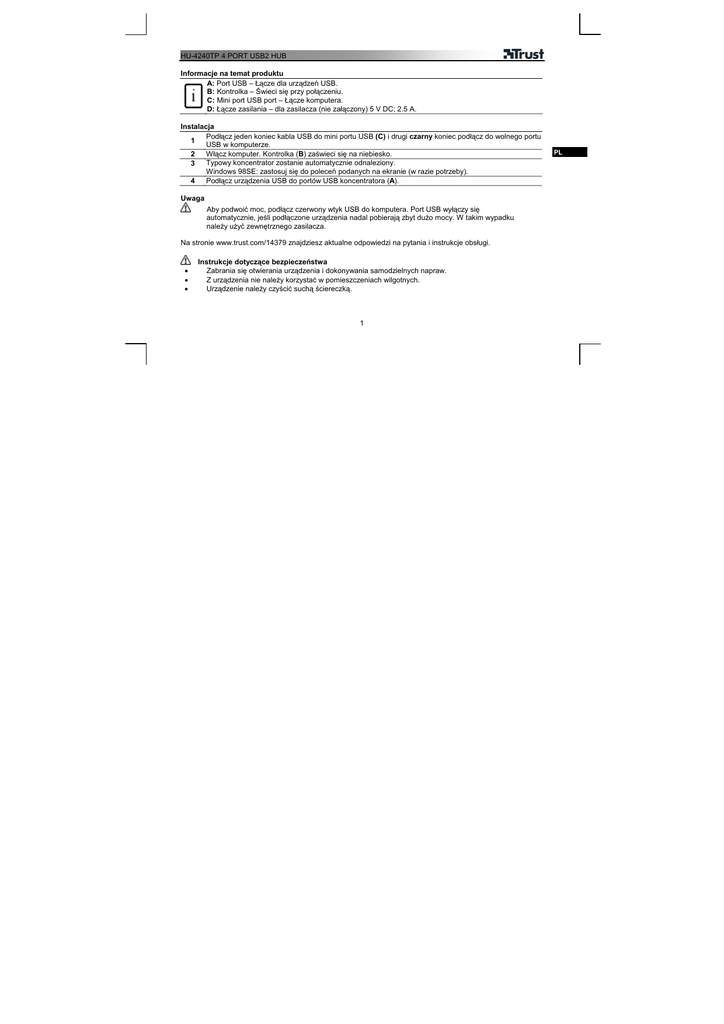 HU-4240TP 4 PORT USB2 HUB Informacje na temat produktu A: Port USB – Łącze dla urządzeń USB. B: Kontrolka – Świeci się przy połączeniu. C: Mini port USB port – Łącze komputera. D: Łącze zasilania – dla zasilacza (nie załączony) 5 V DC; 2.5 A. Instalacja Podłącz jeden koniec kabla USB do mini portu USB (C) i drugi czarny koniec podłącz do wolnego portu 1 USB w komputerze. 2 Włącz komputer. Kontrolka (B) zaświeci się na niebiesko. Typowy koncentrator zostanie automatycznie odnaleziony. 3 Windows 98SE: zastosuj się do poleceń podanych na ekranie (w razie potrzeby). 4 Podłącz urządzenia USB do portów USB koncentratora (A). Uwaga Aby podwoić moc, podłącz czerwony wtyk USB do komputera. Port USB wyłączy się automatycznie, jeśli podłączone urządzenia nadal pobierają zbyt dużo mocy. W takim wypadku należy użyć zewnętrznego zasilacza. Na stronie www.trust.com/14379 znajdziesz aktualne odpowiedzi na pytania i instrukcje obsługi. • • • Instrukcje dotyczące bezpieczeństwa Zabrania się otwierania urządzenia i dokonywania samodzielnych napraw. Z urządzenia nie należy korzystać w pomieszczeniach wilgotnych. Urządzenie należy czyścić suchą ściereczką. 1 PL HU-4240TP 4 PORT USB2 HUB • Urządzenie spełnia główne wymogi oraz wszelkie stosowne postanowienia zawarte w obowiązujących dyrektywach europejskich. Deklaracja Zgodności (DoC) znajduje się na stronie www.trust.com/14379/ce. Gwarancja i prawa autorskie • Urządzenie posiada 2-letnią gwarancję fabryczną, licząc od daty zakupu. Szczegółowe informacje znajdują się na stronie www.trust.com/warranty. • Kopiowanie jakiejkolwiek części niniejszej instrukcji obsługi bez zgody firmy Trust International B.V. jest zabronione. 2