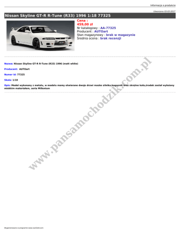Informacje o produkcie Utworzono 03-03-2017 Nissan Skyline GT-R R-Tune (R33) 1996 1:18 77325 Cena : 459,00 zł l Nr katalogowy : AA-77325 Producent : AUTOart Stan magazynowy : brak w magazynie Średnia ocena : brak recenzji .p Nazwa: Nissan Skyline GT-R R-Tune (R33) 1996 (matt white) om Producent: AUTOart Numer id: 77325 .c Skala: 1/18 w w w .p an sa m oc ho dz ik Opis: Model wykonany z metalu, w modelu mamy otwierane dwoje drzwi maske silnika,bagaznik oraz skrętne koła,środek został wyłożony miekkim materiałem, seria Millenium Wygenerowano w programie www.oscGold.com